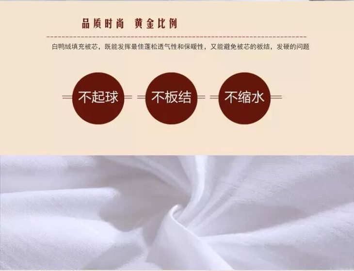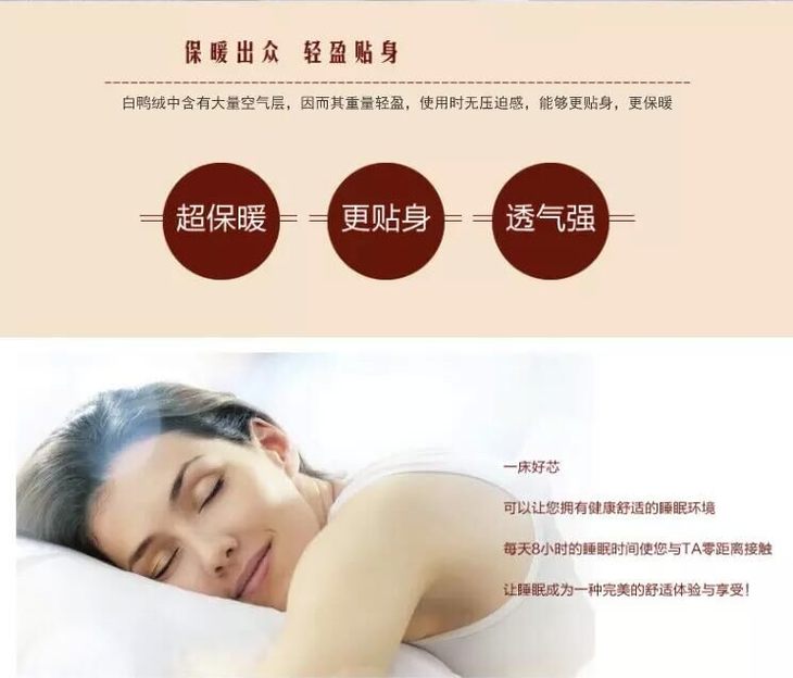 2.羽柔被的面料是经过防绒处理的,有一点小孔也会钻出羽绒,因此使用时要小心,避免被尖锐物刺割被子。