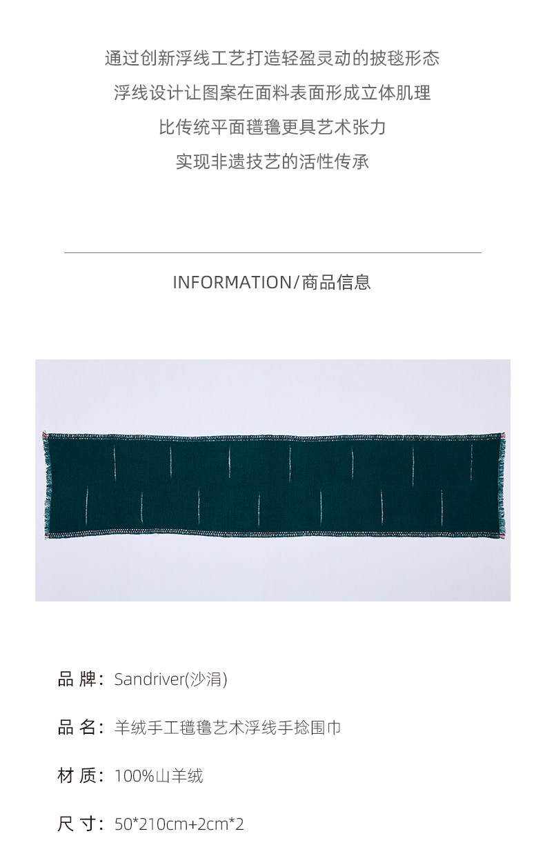 - 历年在巴黎时装周亮相,享誉世界的艺术羊绒品牌[Sandriver 沙涓]由羊绒布道者郭秀玲女士创立。阿拉善自有牧场纯种羔羊绒,日本国宝设计师小筱顺子,上海自有基地精工细作。承载羊绒情怀,坚持匠人品质。
