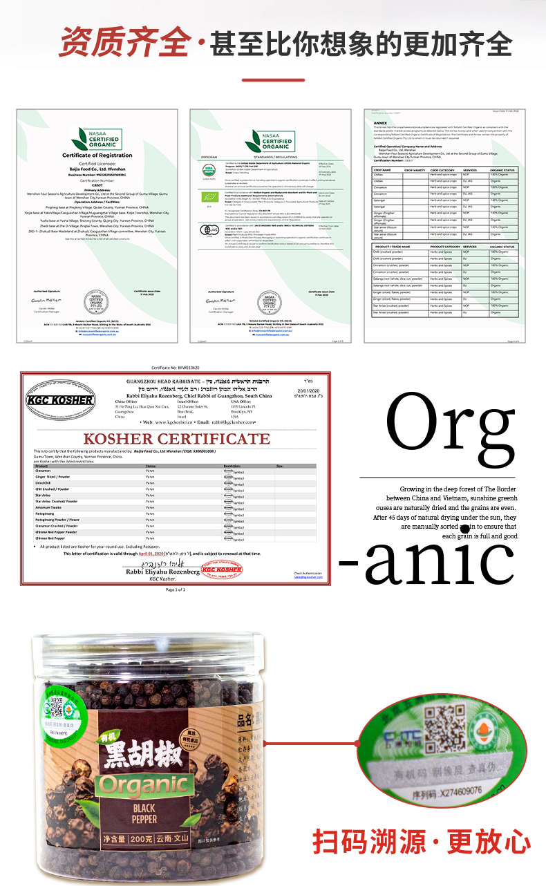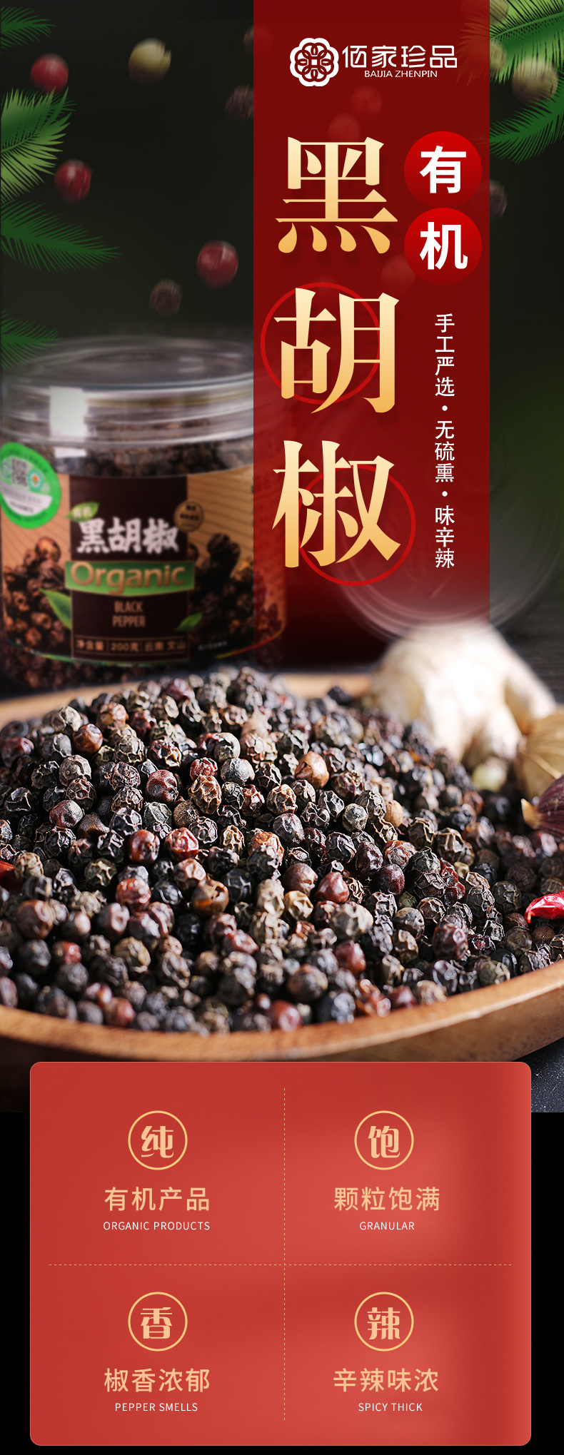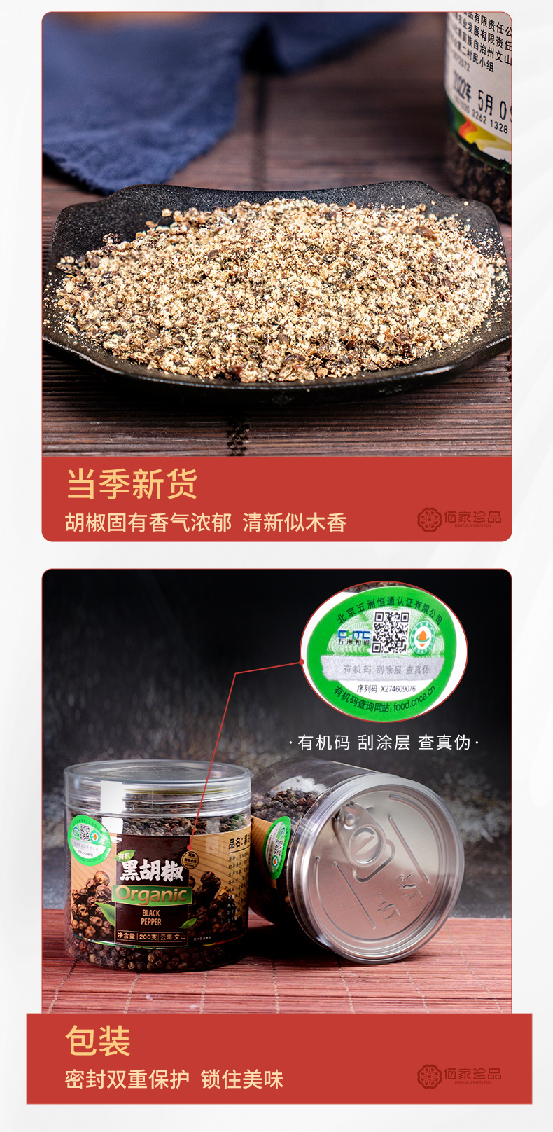 有机黑胡椒粒200g云南特产精选瓶装调味干货厨房卤料调料香辛家用食品包邮