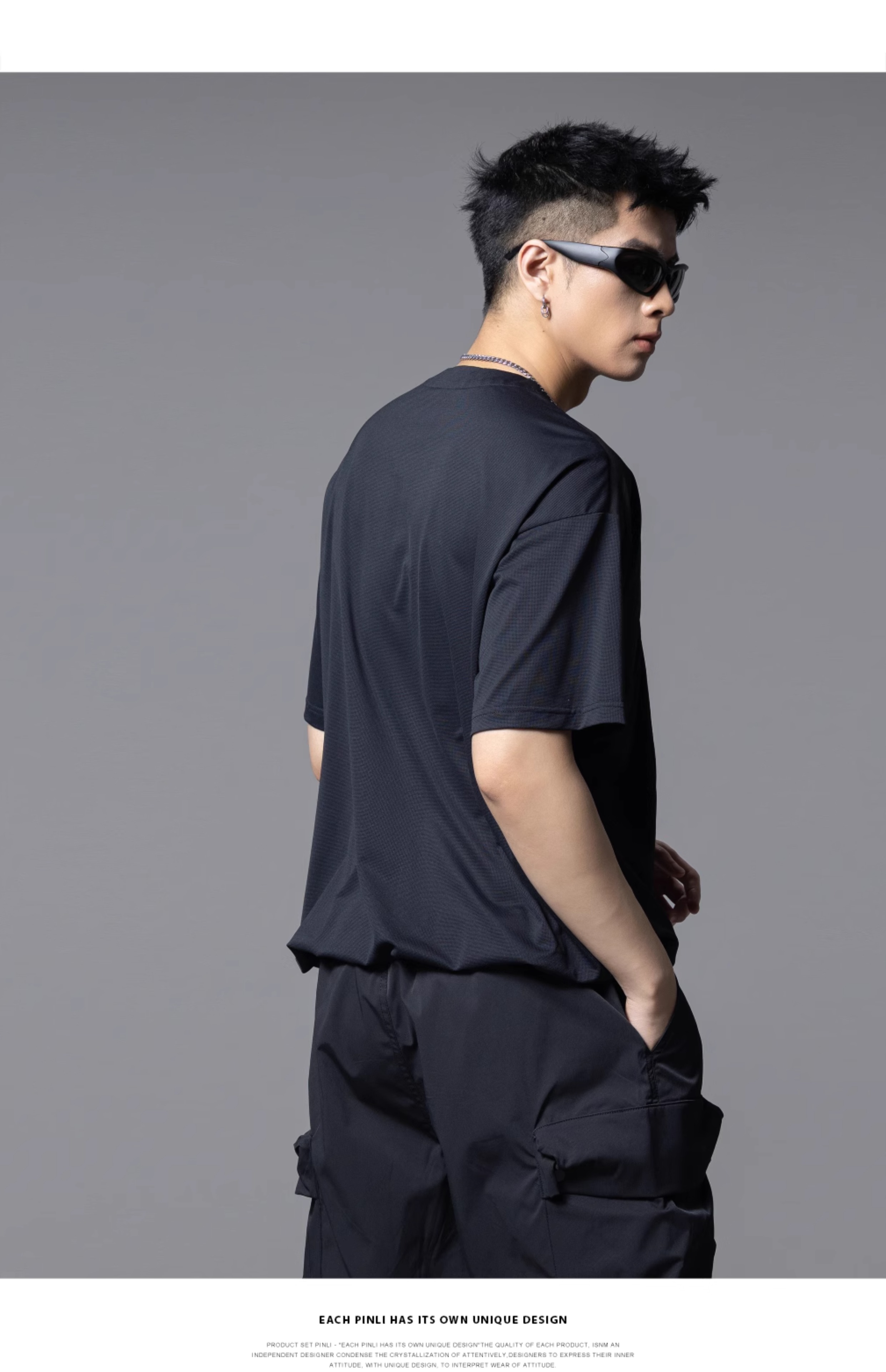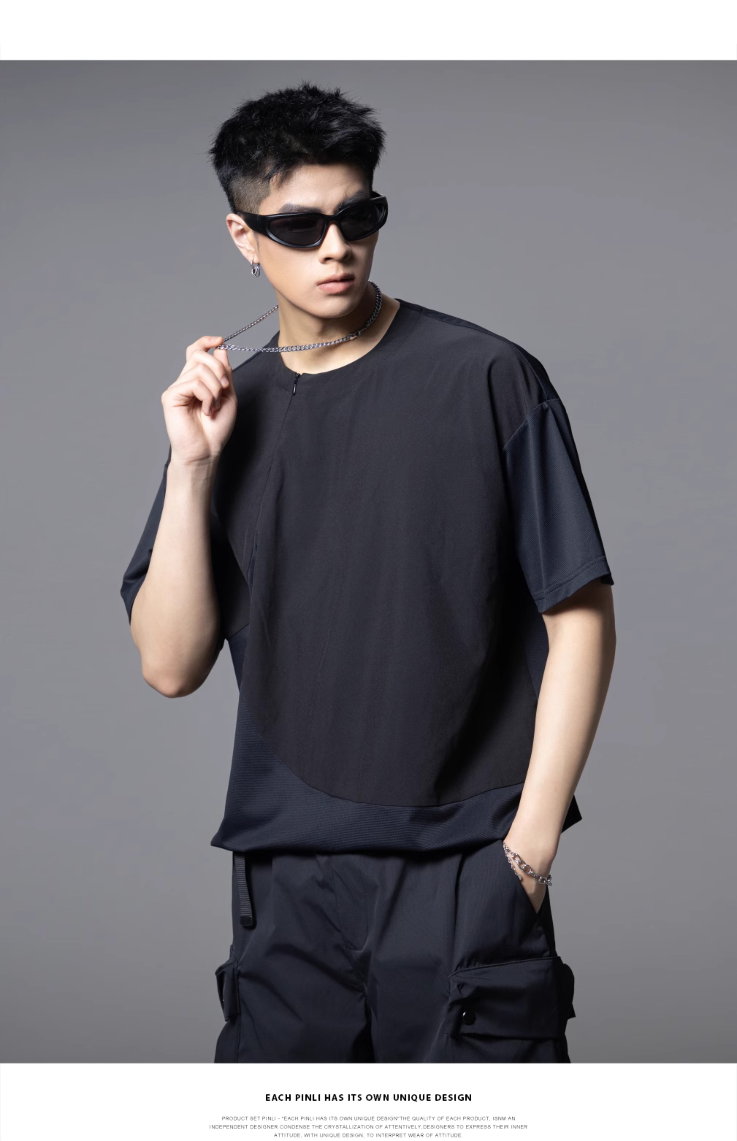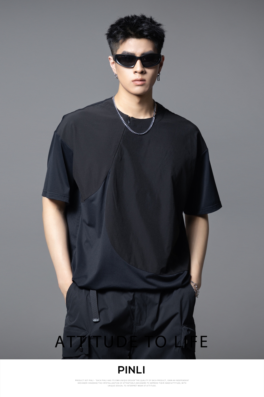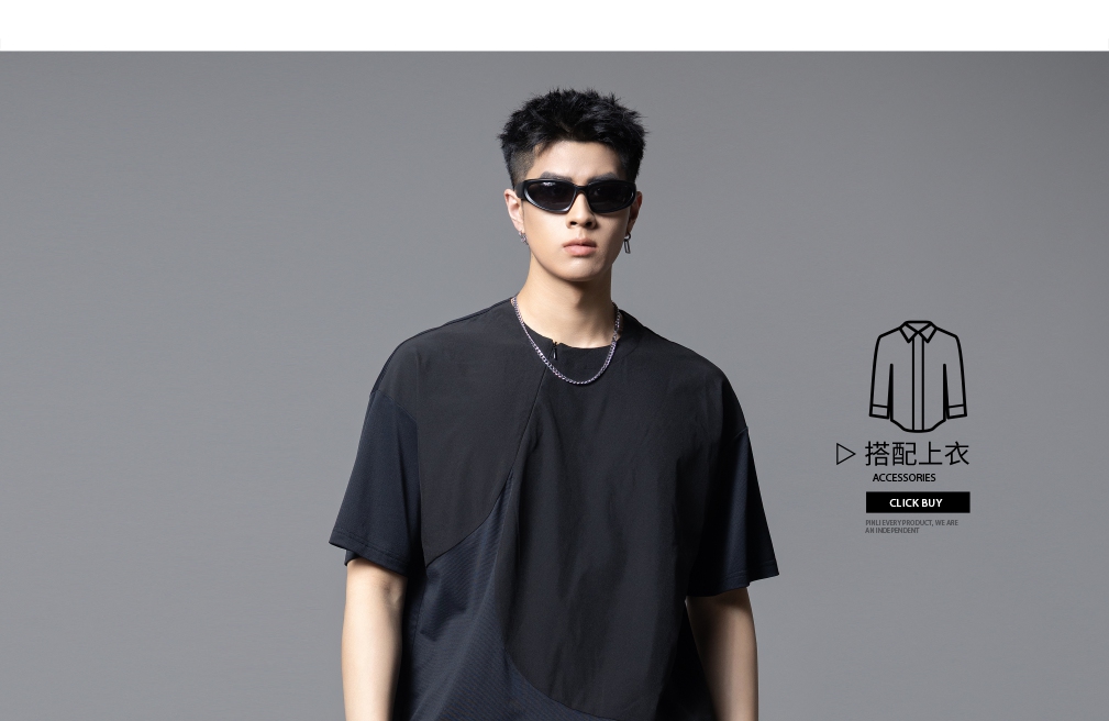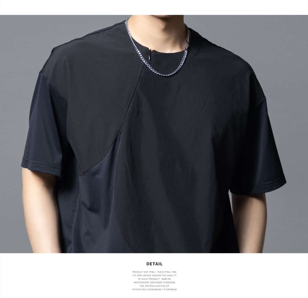 PINLI品立2025夏季新款男士拼接宽松廓形短袖T恤潮流纯色百搭上衣B252111033