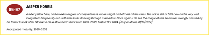 “酒液的颜色更深沉,完整度更高,质感厚重且几乎具备所有品质。橡木桶使用率仅50%,二者完美融合在一起。华丽丰富,就像水果在青色的草地上舞动。再次强调,我确实看到了这瓶酒的魔力。亨利在他父亲强烈建议下,很好照顾到Clos de Mouchere这座独占园,建议在2030-2038年饮用。”
