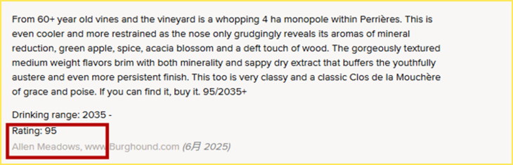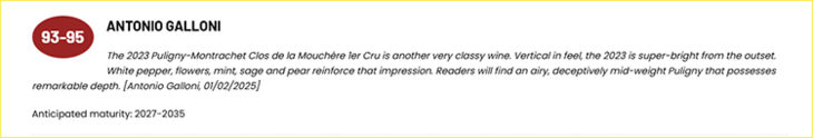 这也是公认蕞好喝的独占园干白,2023年份荣获Jasper Morris 97分和Allen Meadows95分。要知道AM是出了名“打分严”,其之于勃艮第就如同Parker在波尔多的地位,像1945年的康帝也才拿到95分,均价¥2000+的双鸡普利尼蒙哈榭一级园拿95分的也屈指可数,本次配额不多,抓紧手速。