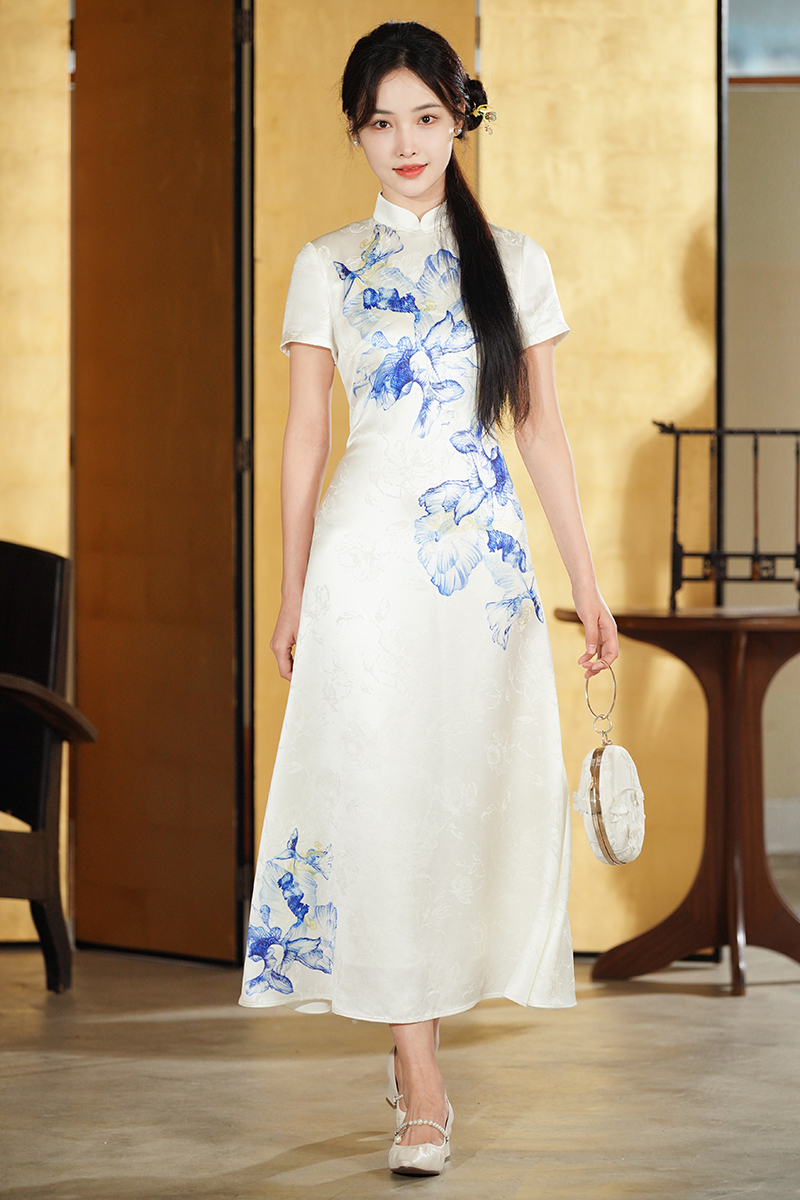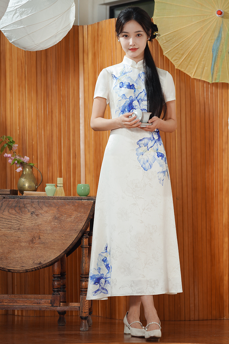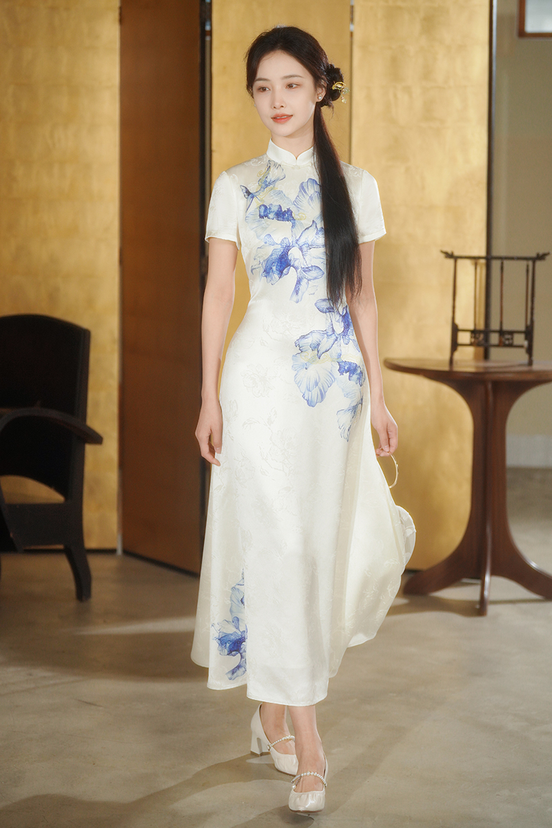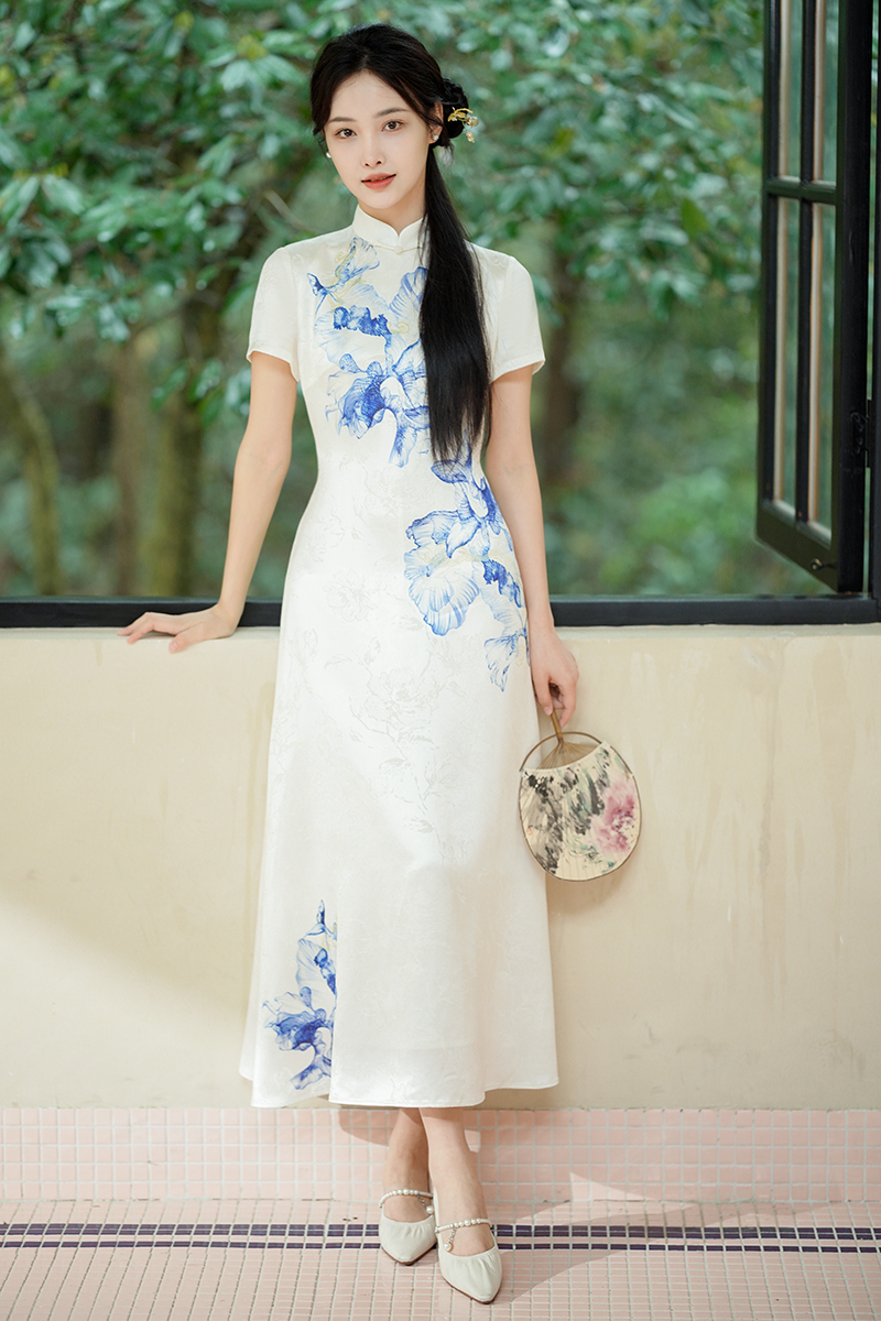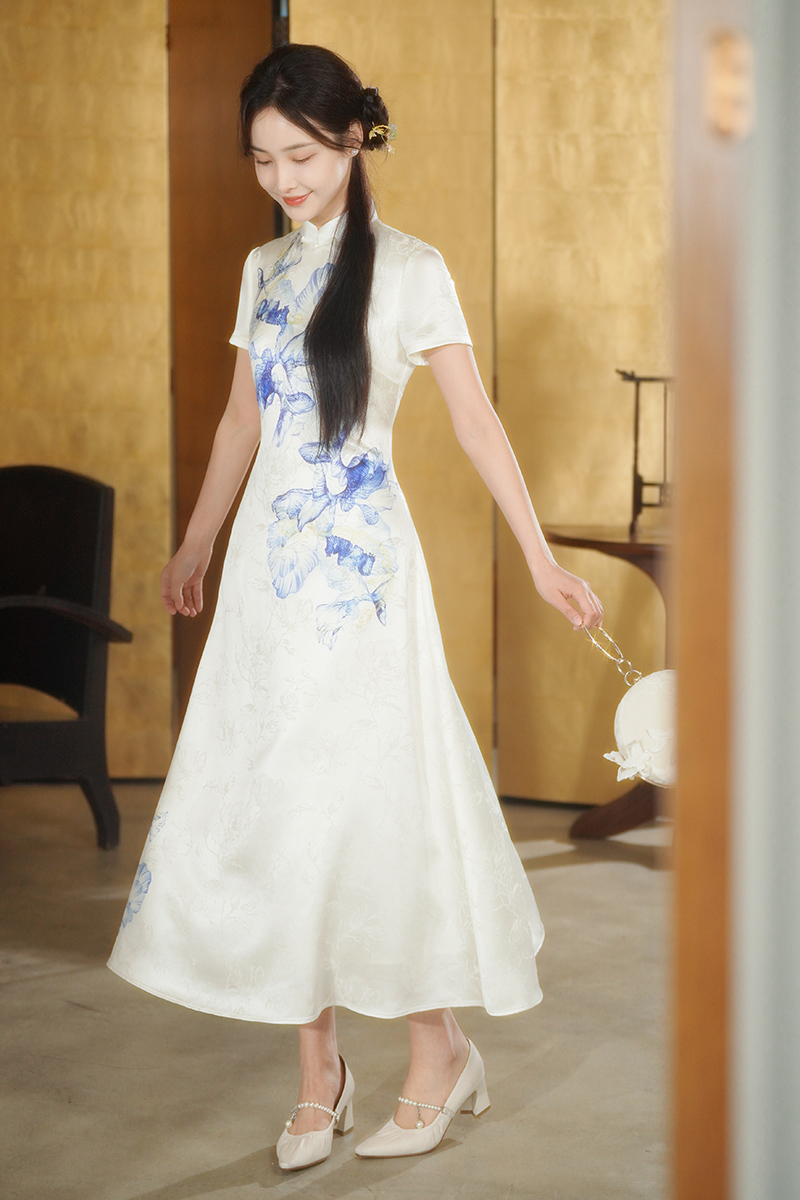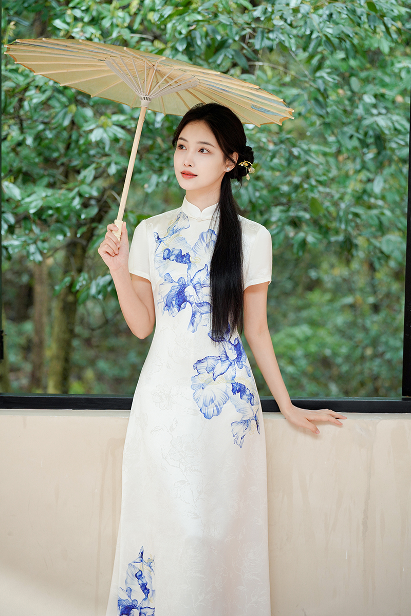 运用中式传统颜色“东方既白”,东方既白是蓝蒙蒙白不透的颜色;青花明净、旗袍优雅、美瓷如人,衣身宛如青花瓷般细腻素雅,一滴墨度一尺青花。
