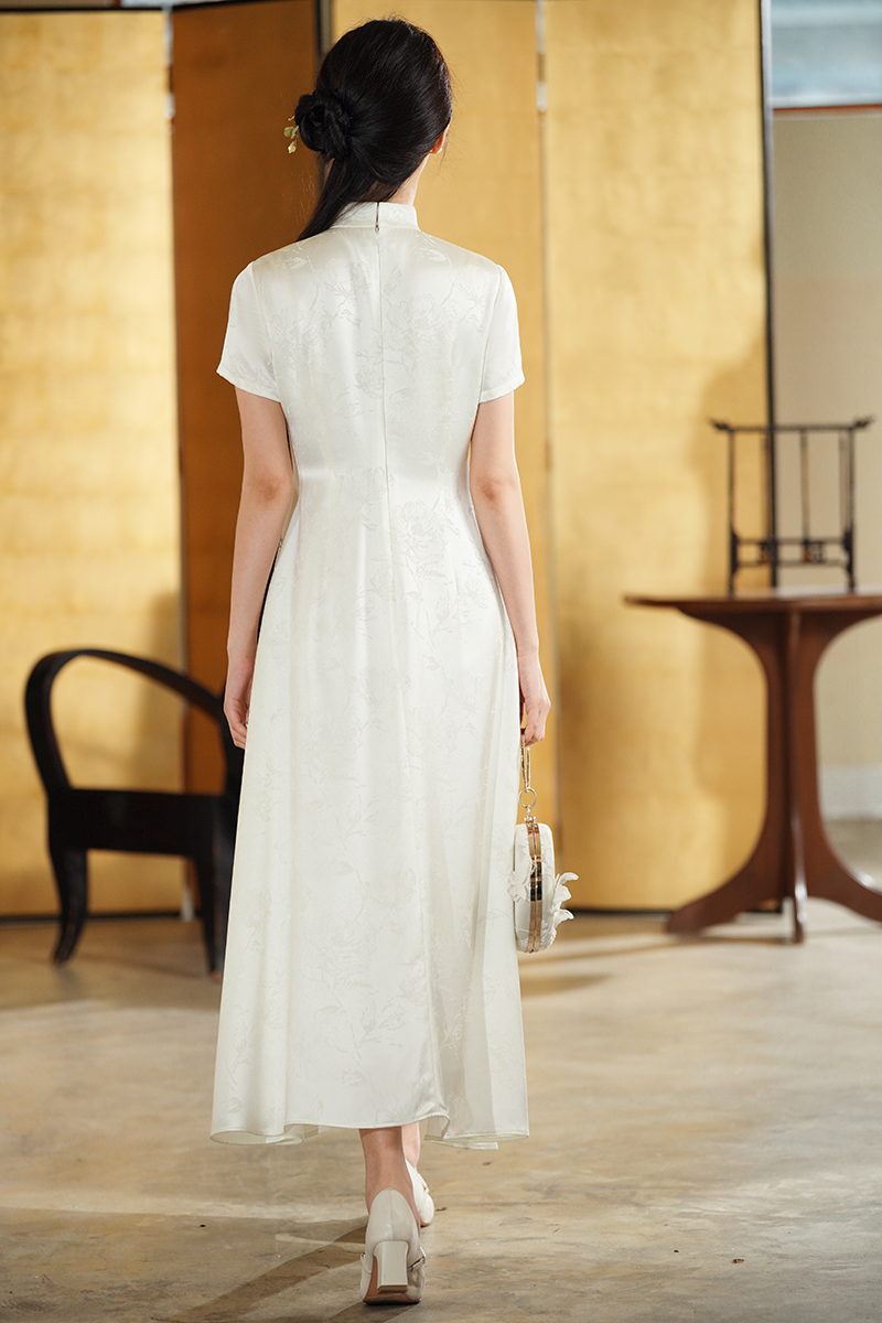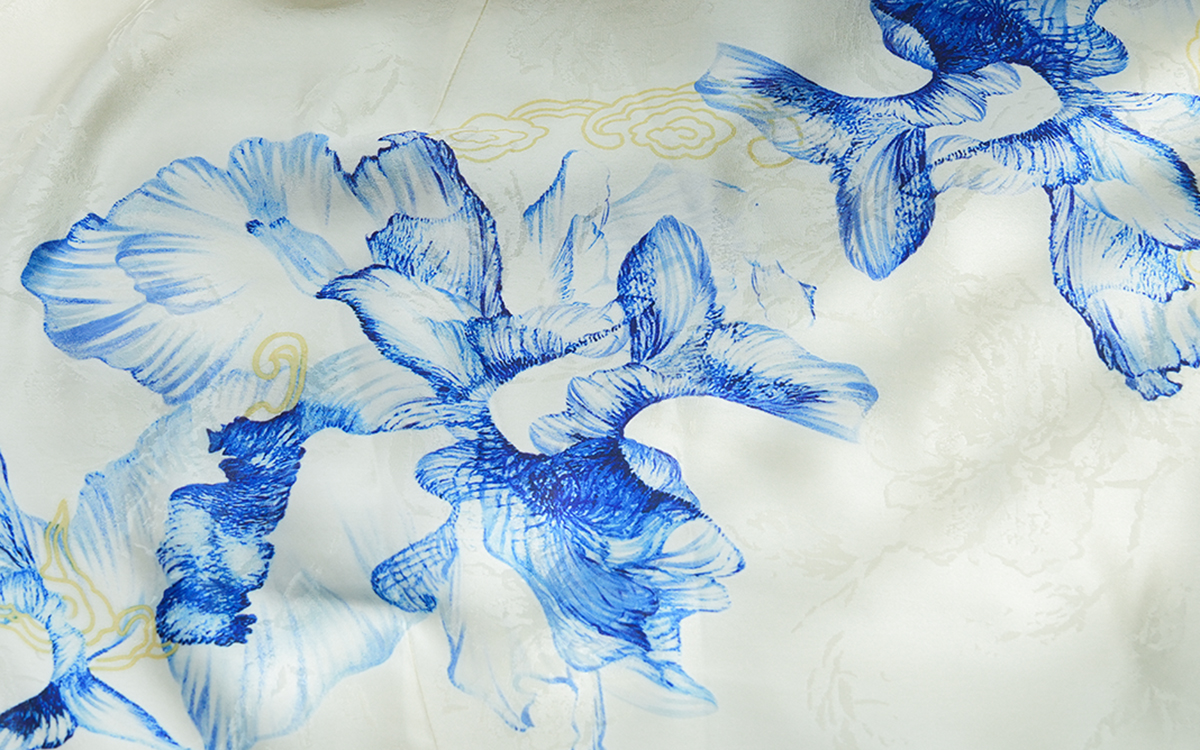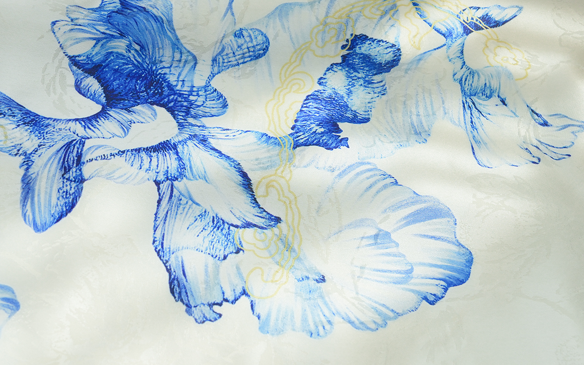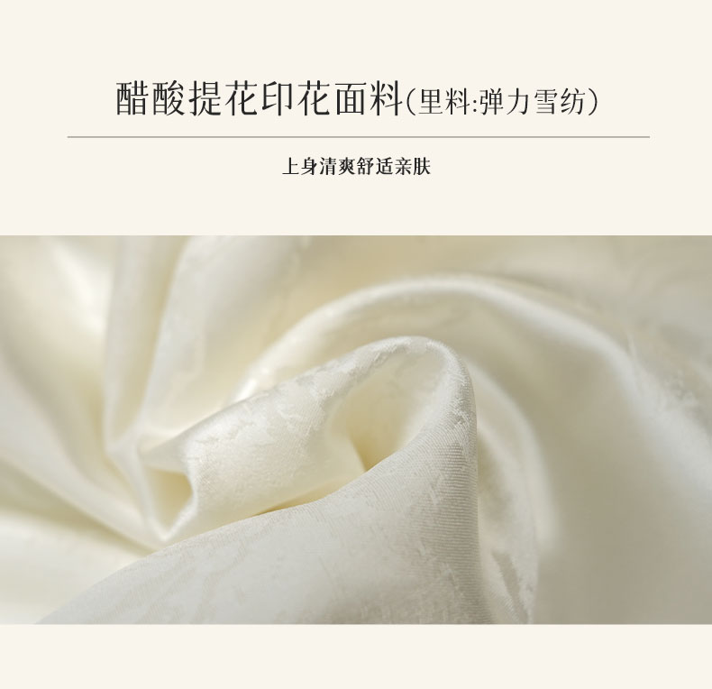 醋酸面料上的提花暗纹为柔美大气的杜鹃花,白色杜鹃花寓意着被爱的欣喜、永远属于你等,充满浪漫氛围。