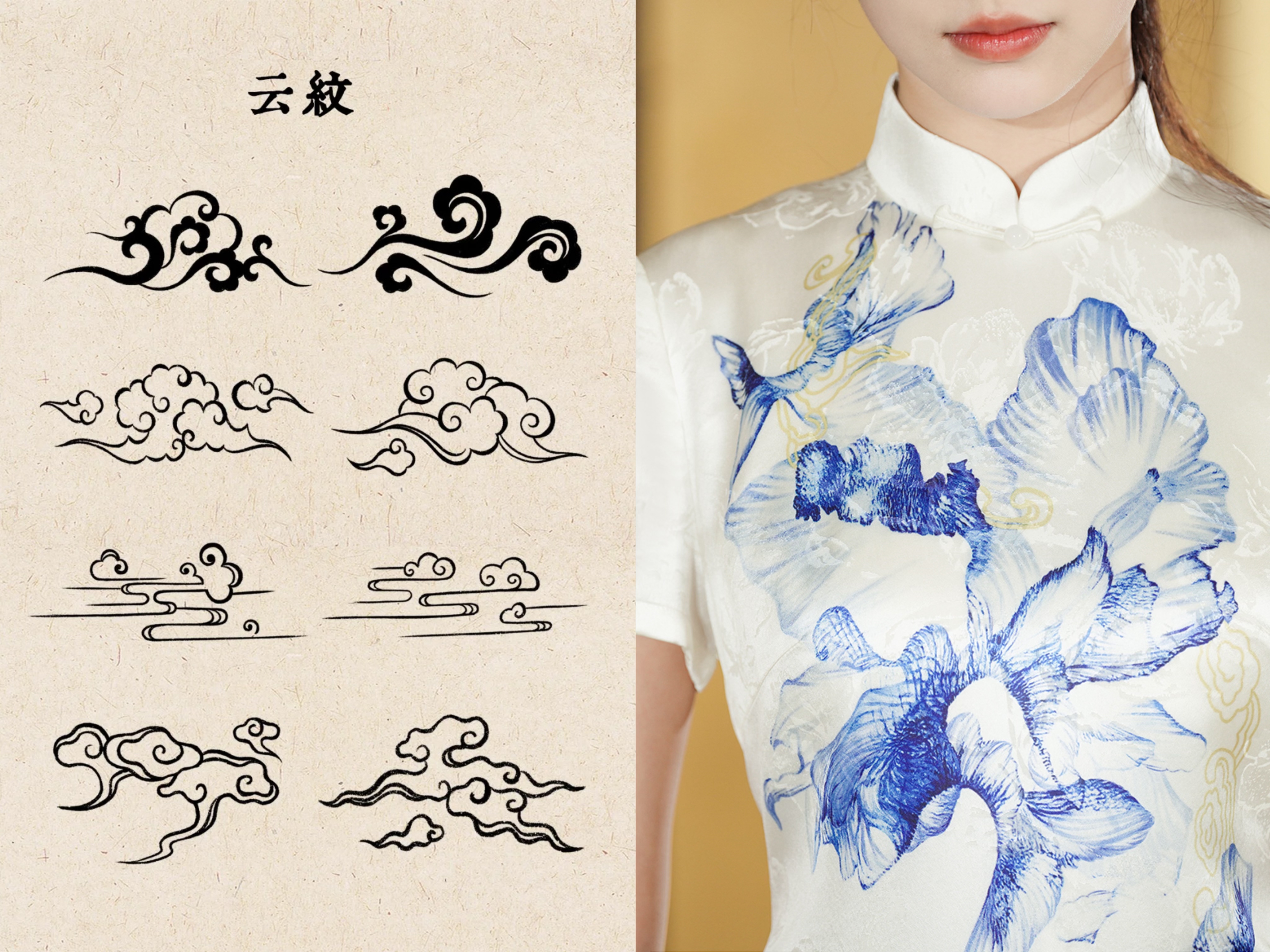 ☁️衣身上黄色的花纹为【云纹】,与蓝色【鸢尾花瓣花纹】交叠在一起。