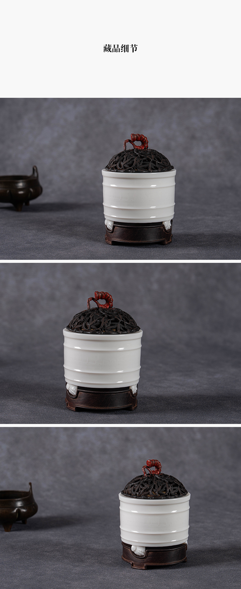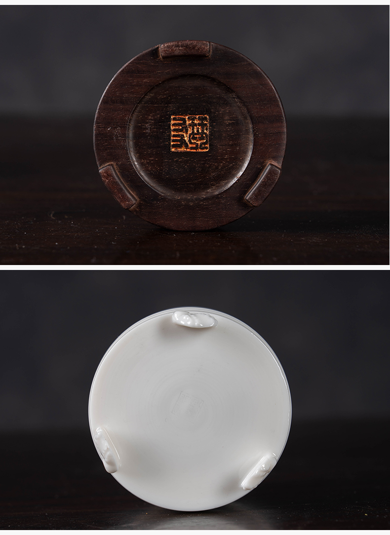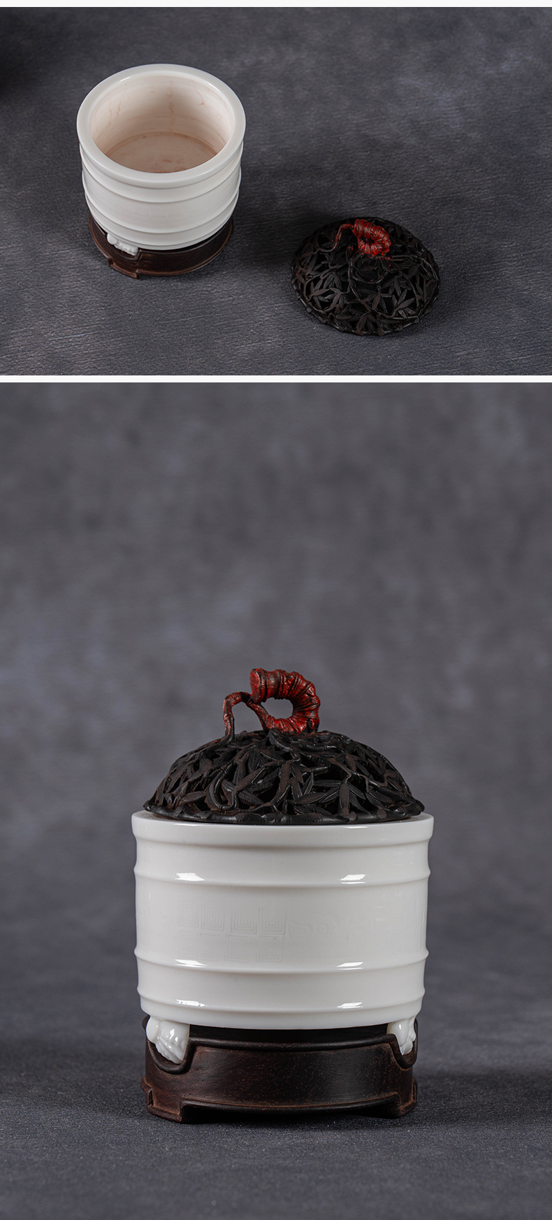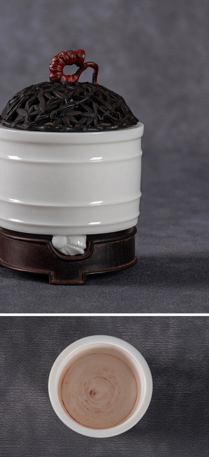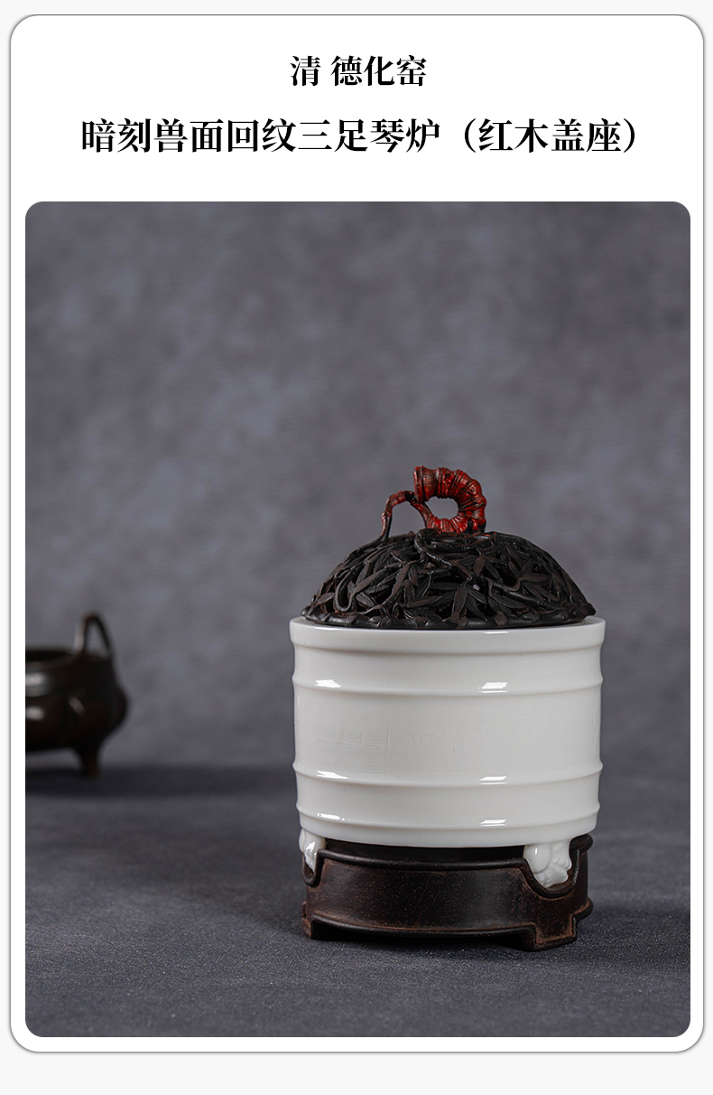 清 德化窑暗刻兽面回纹三足琴炉(红木盖座)