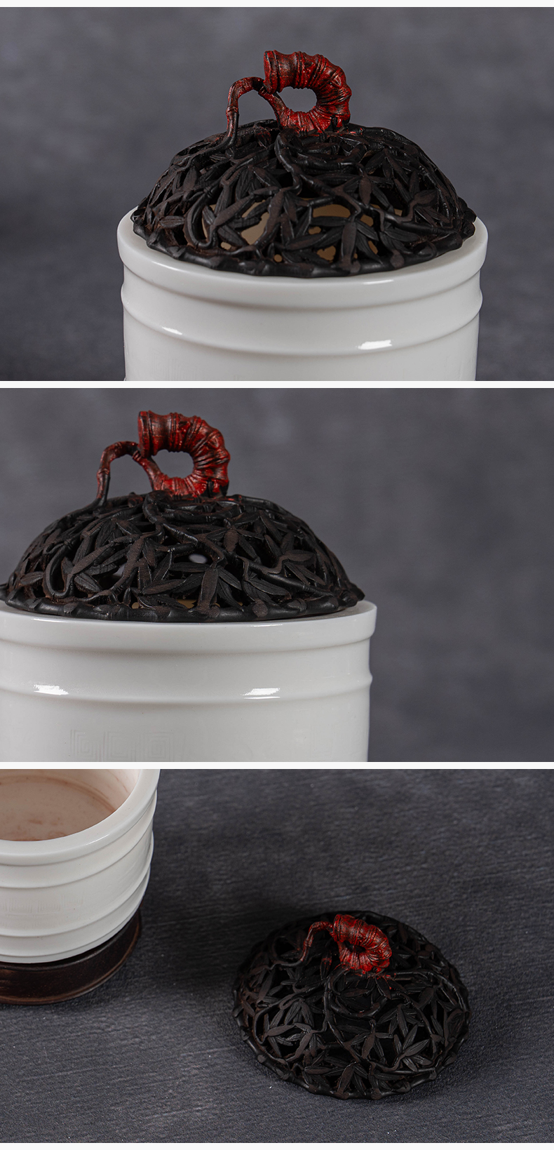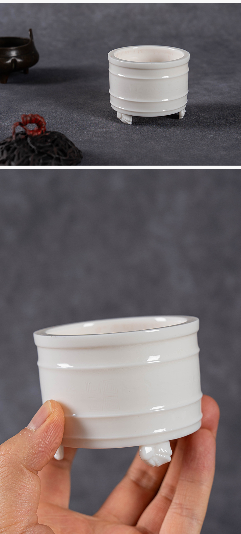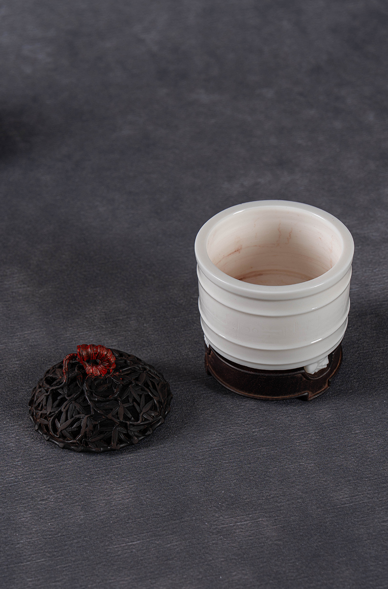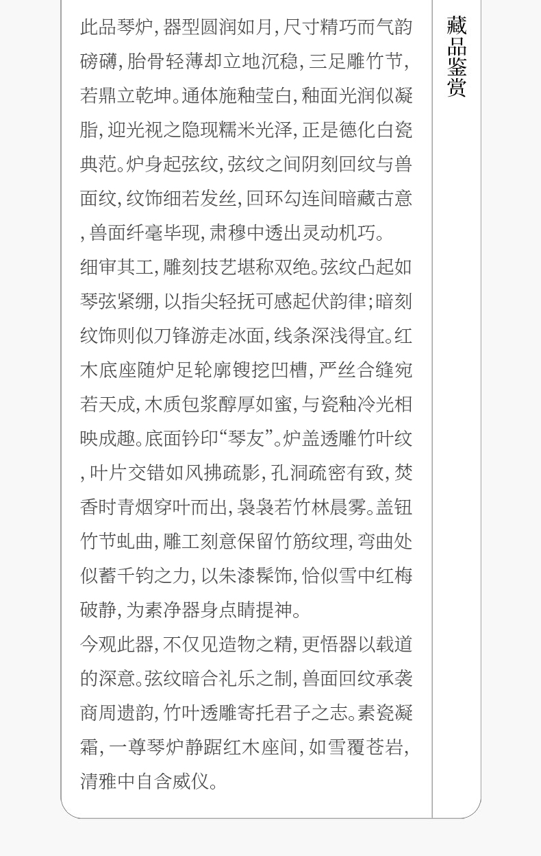 清 德化窑暗刻兽面回纹三足琴炉(红木盖座)