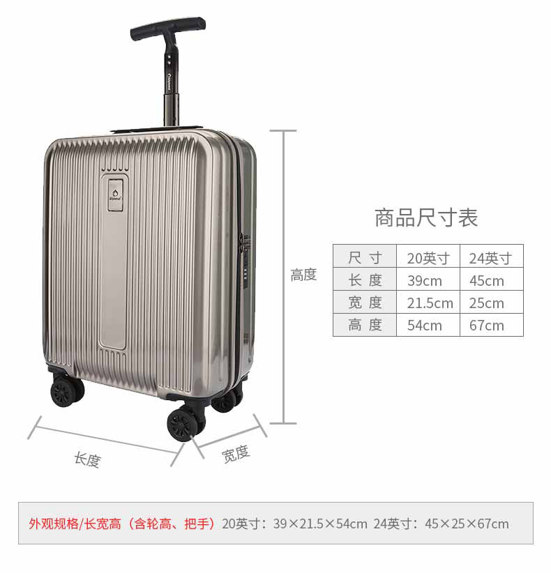 外观尺寸:390*215*540mm /20英寸 HM-23102 可登机 外观尺寸 450*250*670mm /24英寸 HM-23103 需托运