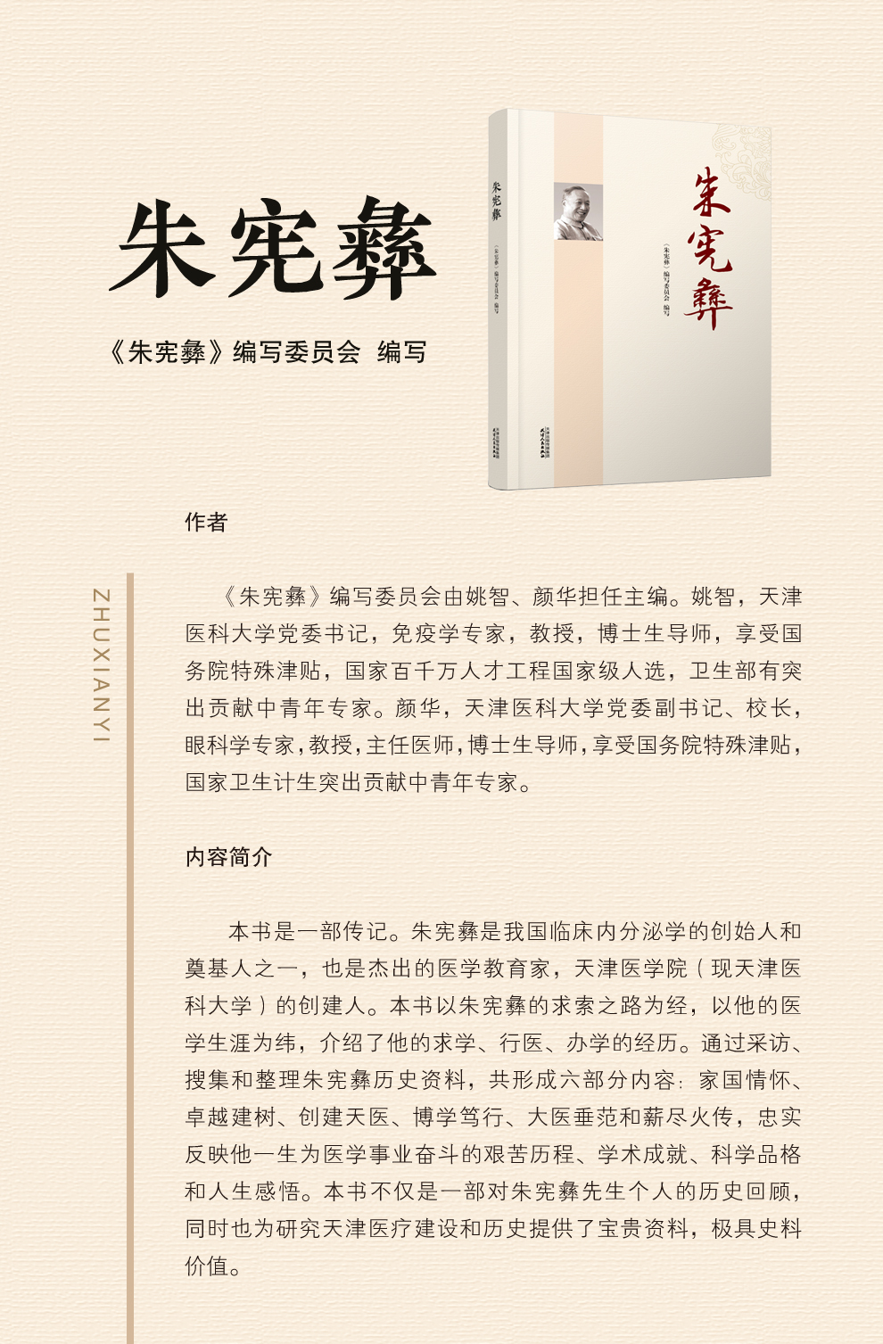 《朱宪彝》编写委员会由姚智、颜华担任主编。姚智,天津医科大学党委书记,免疫学专家,教授,博士生导师,享受国务院特殊津贴,国家百千万人才工程国家级人选,卫生部有突出贡献中青年专家。颜华,天津医科大学党委副书记、校长,眼科学专家,教授,主任医师,博士生导师,享受国务院特殊津贴,国家卫生计生突出贡献中青年专家。