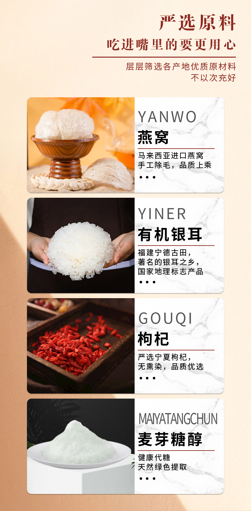 【配料】:银耳、麦芽糖醇、枸杞、燕窝