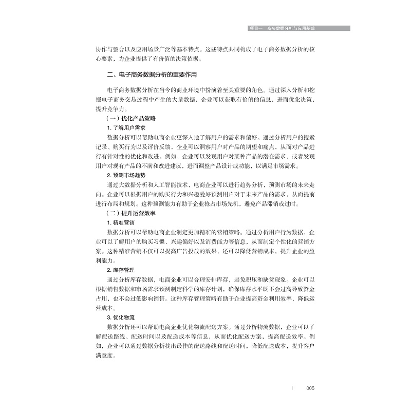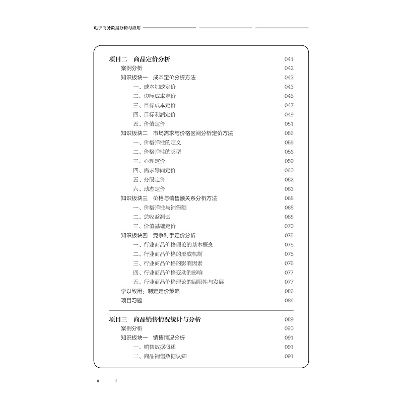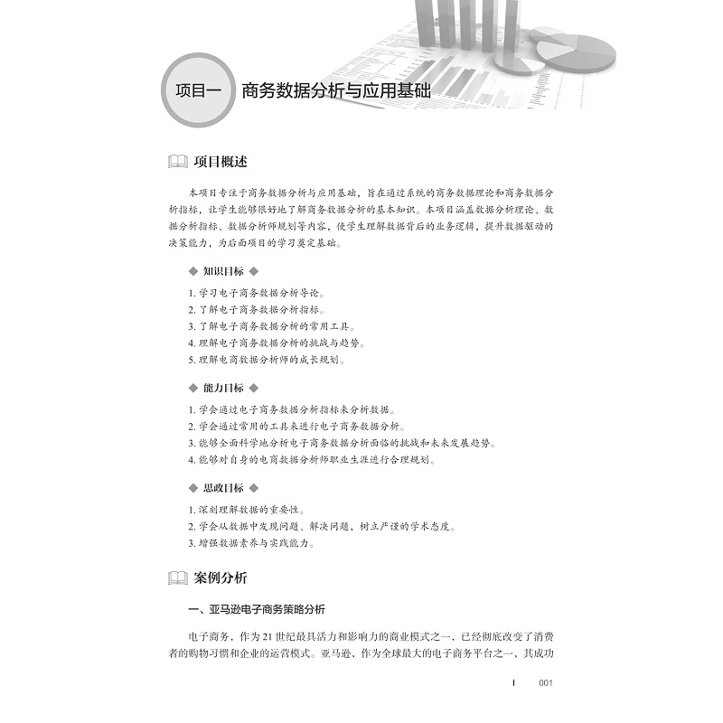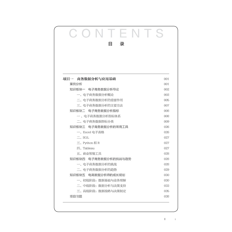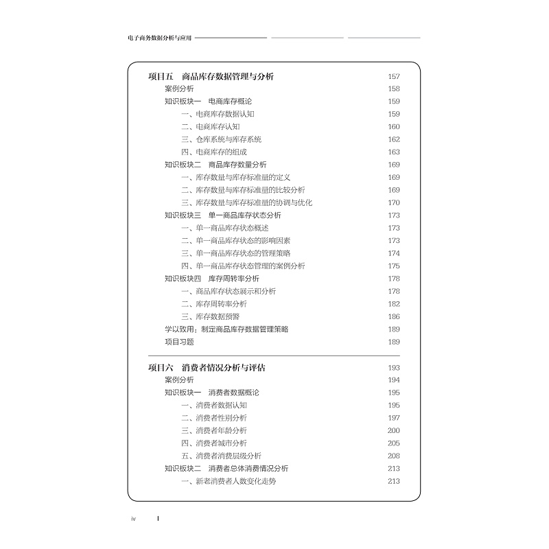 商务数据分析是商务类专业的一门专业核心课程,依据商务运营管理岗位群中数据运营典型职业活动而设置,主要任务是完成运营数据的分析并依据分析结果提升营销和运营效率、科学预测、增强客户体验。通过本课程的学习,学生能掌握数据分析的基本知识、工具、方法,具备在互联网环境下的数据分析、数据可视化展现、及评估优化的能力,通过对流量来源、商品销量、用户画像等数据,利用流量、销售转化率、客户价值、库存分析、动销率分析、等常用的分析指标进行数据分析,以此指导店铺品类结构及营销策略,加强店铺的竞争力。本教材理论联系实践,强调动手能力 ;形式新颖,案例丰富。书中提供大量来自企业的案例,讲解过程中穿插大量的图表和小模块。 教材配套资源丰富,提供 ppt课件、教学大纲,教学实训手册,教学视频,软件操作视频、教学案例库,教案,实训报告等。