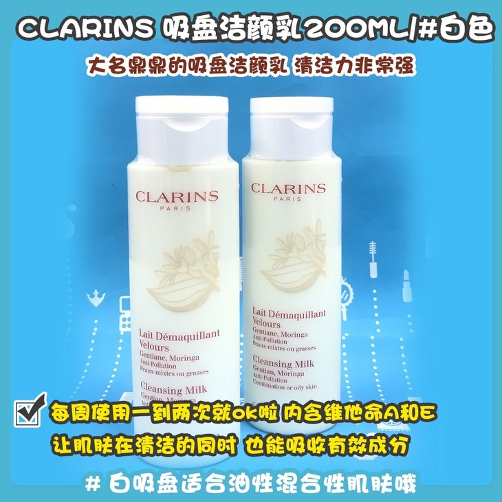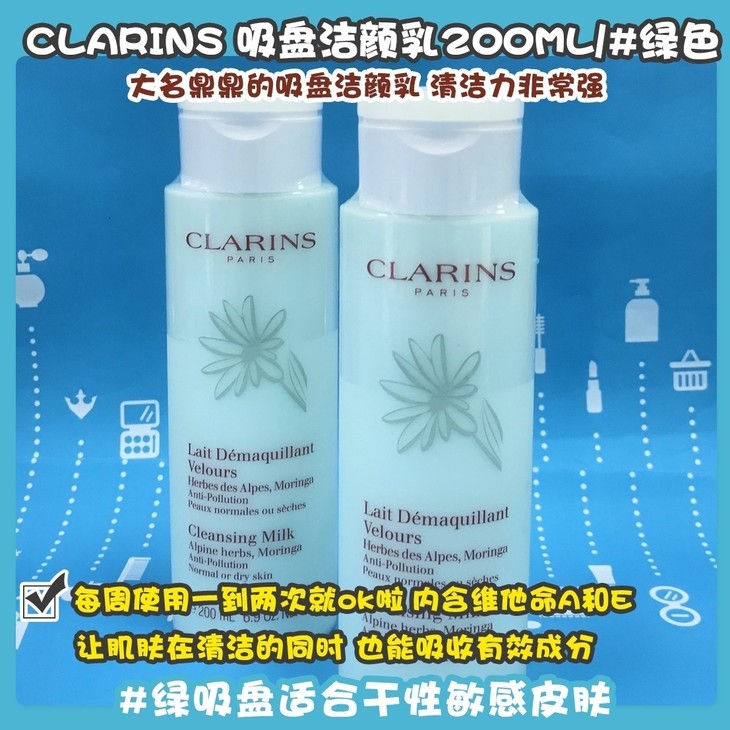 CLARINS 吸盘洁颜乳200ML#绿色/#白色👍大名鼎鼎的吸盘洁颜乳😍,清洁力非常强,每周使用一到两次就ok啦📆。内含维他命A和E👏🏻,让肌肤在清洁的同时,也能吸收有效成分💦。洗去彩妆、皮肤表面过多的油脂和毛孔内的污物🌬。洗净之后皮肤真的像鸡蛋一样嫩滑喲🌟。#☑️绿吸盘适合干性敏感皮肤,#☑️白吸盘适合油性混合性肌肤哦
