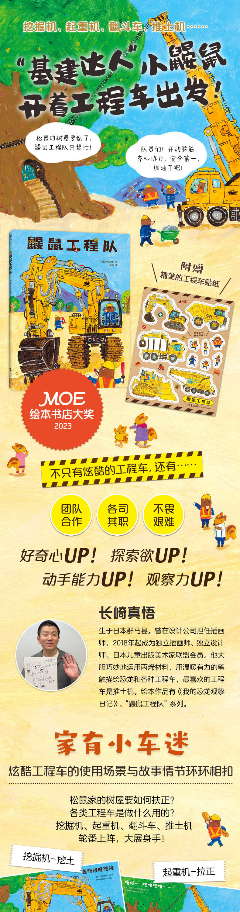 生于群马县。曾在设计公司担任插画师,2018年起成为独立插画师、独立设计师。他大胆巧妙地运用丙烯材料,用温暖有力的笔触描绘恐龙及各种车的形象。他最喜欢的重型工程机械车是推土机。绘本作品有《我的恐龙观察日记》(『ぼくのきょうりゅうかんさつ日記』)(德间书店)。日本儿童出版美术家联盟会员。