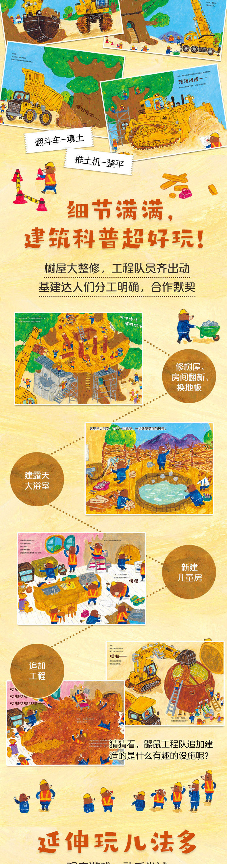 这时,鼹鼠工人们又忙忙碌碌地搭起了脚手架——工程还没结束,他们要建造更多的新房间!