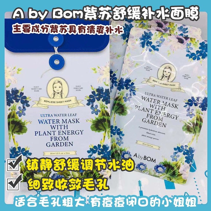 A by Bom紫苏舒缓补水面膜👍光看包装还以为是文件夹,质感很棒,有种夏季☀的清新感~主要成分紫苏具有清爽补水💦,镇静舒缓调节水油〽,细致收敛毛孔的作用➰。除了紫苏成分💜以外,重要的一点这款面膜还因为冰羽灵膜布,是采用的医用🏥冰羽灵作为膜布的哦!💁适合毛孔粗大,有痘痘闭口的小姐姐