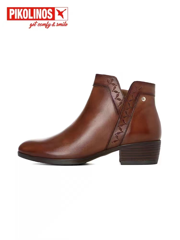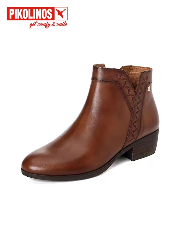 Pikolinos派高雁23冬季牛皮圆头粗跟侧拉链休闲踝靴