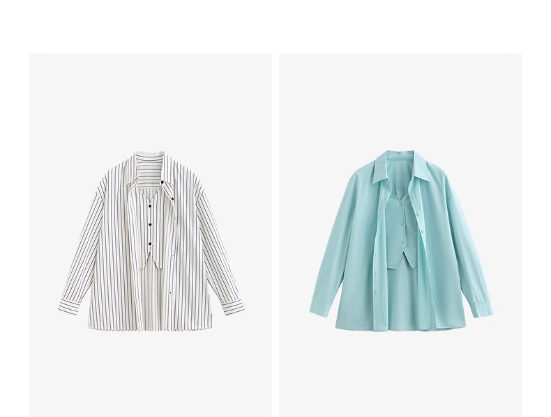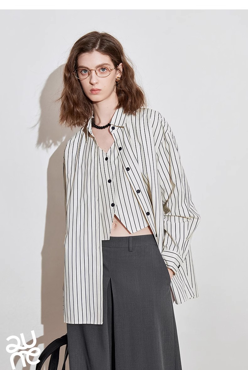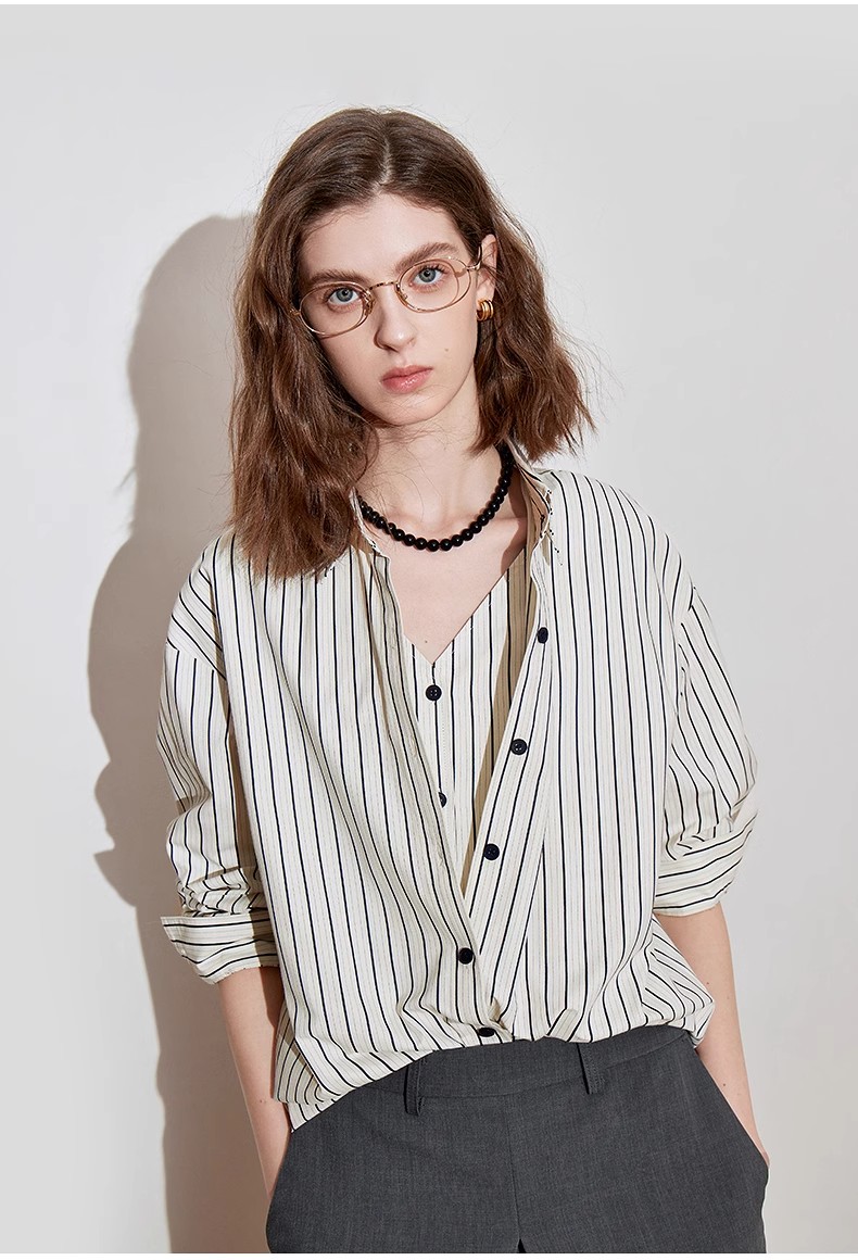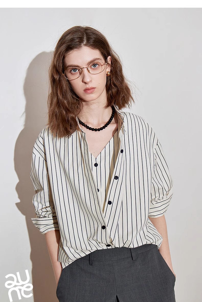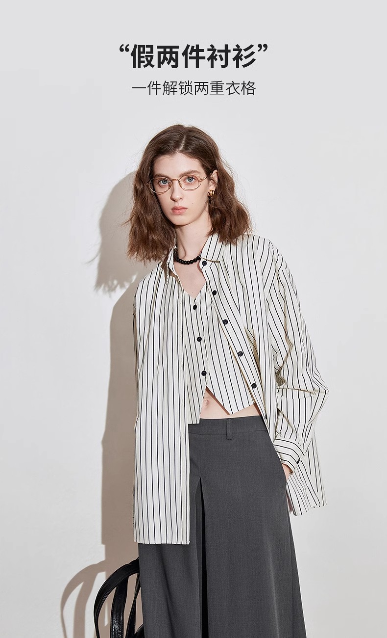 初语条纹衬衫女假两件上衣2025春季新款莱赛尔棉质百搭外搭衬衣