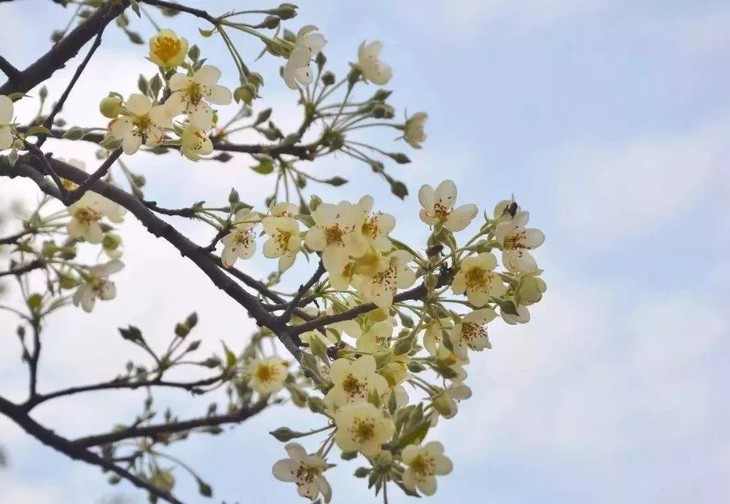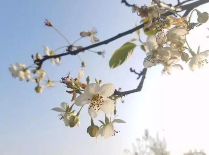山楂花像桃花,却没有桃花那擦脂抹粉的娇态;它像梨花,却不如梨花般迎风怒放的张扬。洁白的花瓣在阳光下晶莹透亮,星星花蕊点缀其中,小巧可爱。