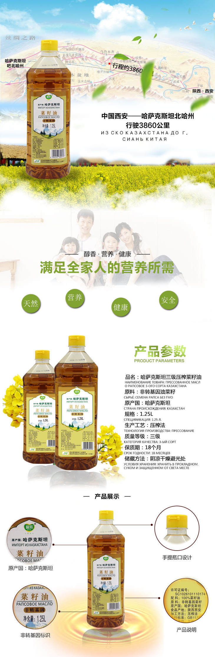 爱菊 哈萨克斯坦 食用油 三级压榨 菜籽油 1.25L