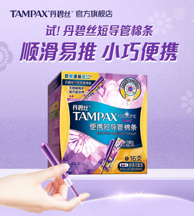 丹碧丝进口易推便携短导管卫生棉条普通流量16支装新手试用内置式卫生巾