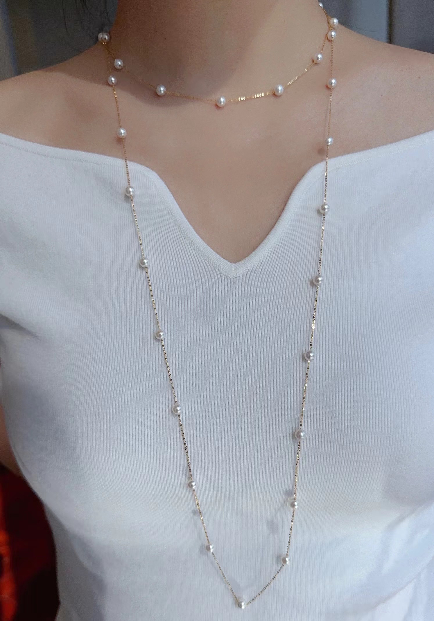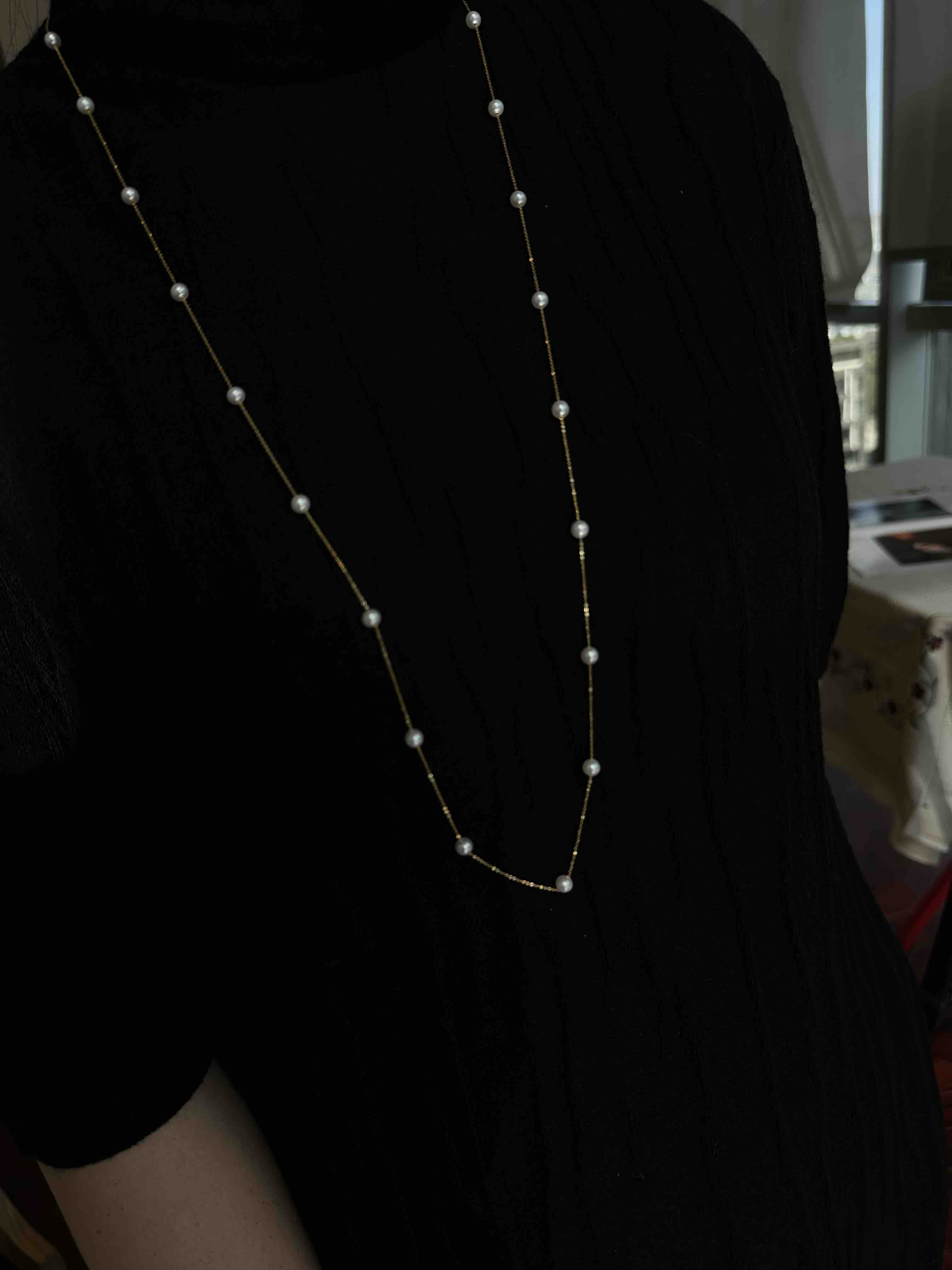 尾部也做了一枚小珍珠结尾,可以多种佩戴方式。也可以用来调节长度,总长是45cm,卡在任何一颗小珍珠上就可以。根据您的需求。![]()