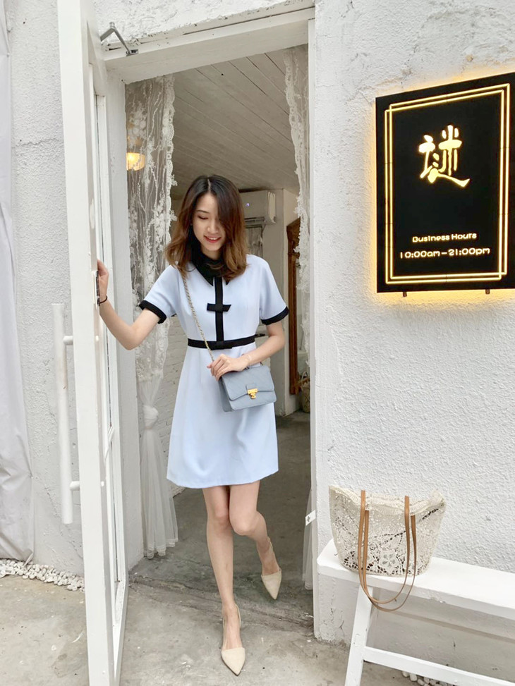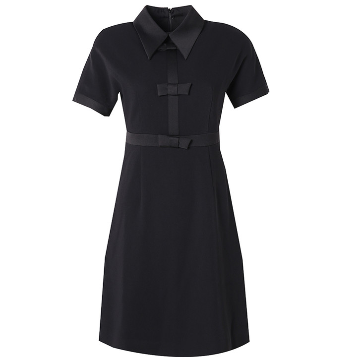 洛诗琳2019年夏装新品名媛风时尚尖领蝴蝶结收腰连衣裙