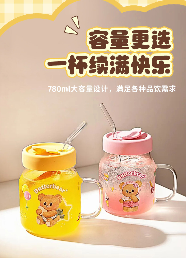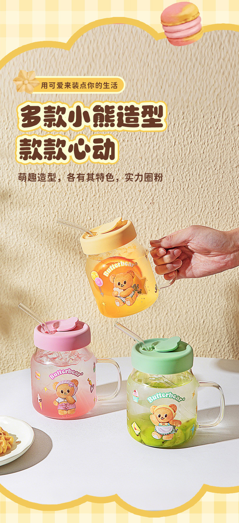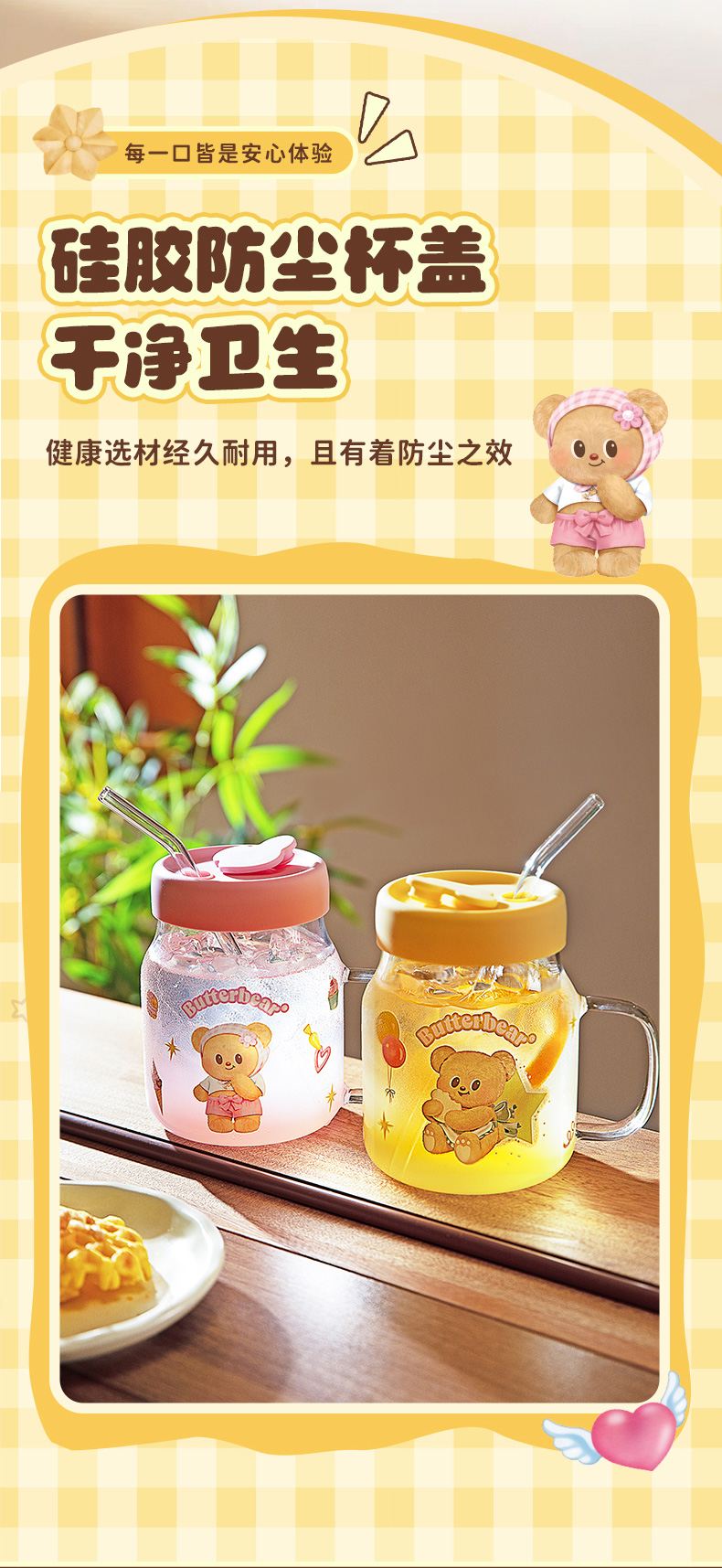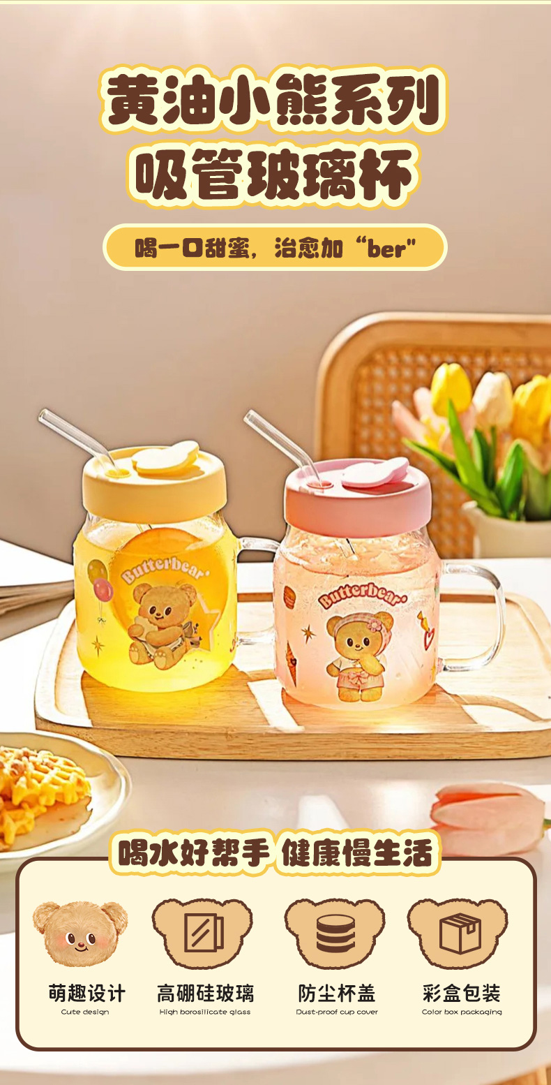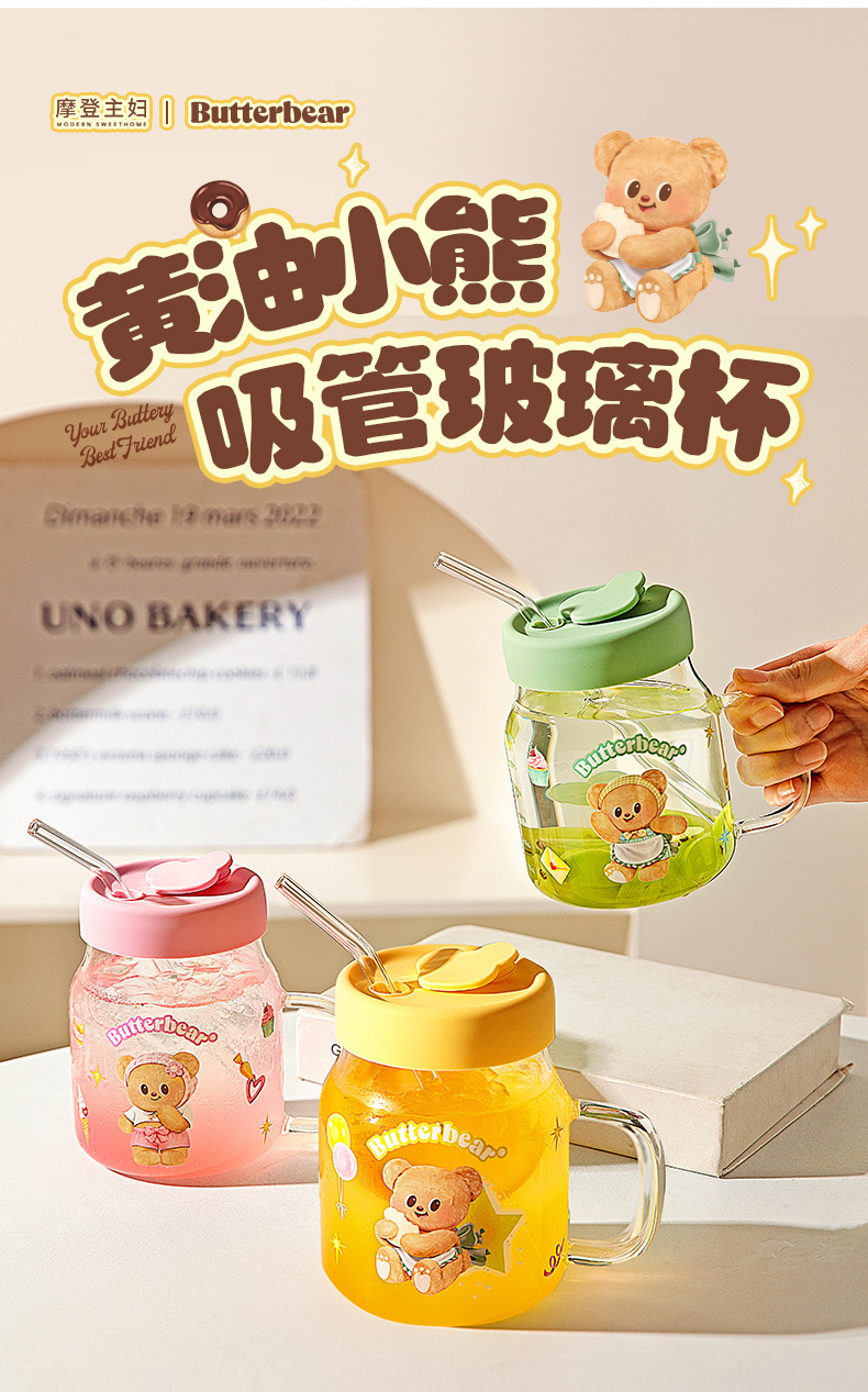 摩登主妇黄油小熊带盖玻璃杯吸管杯高颜值杯子女办公室水杯果汁杯