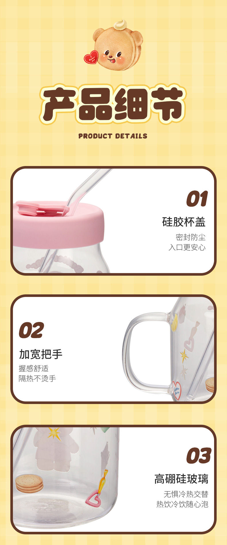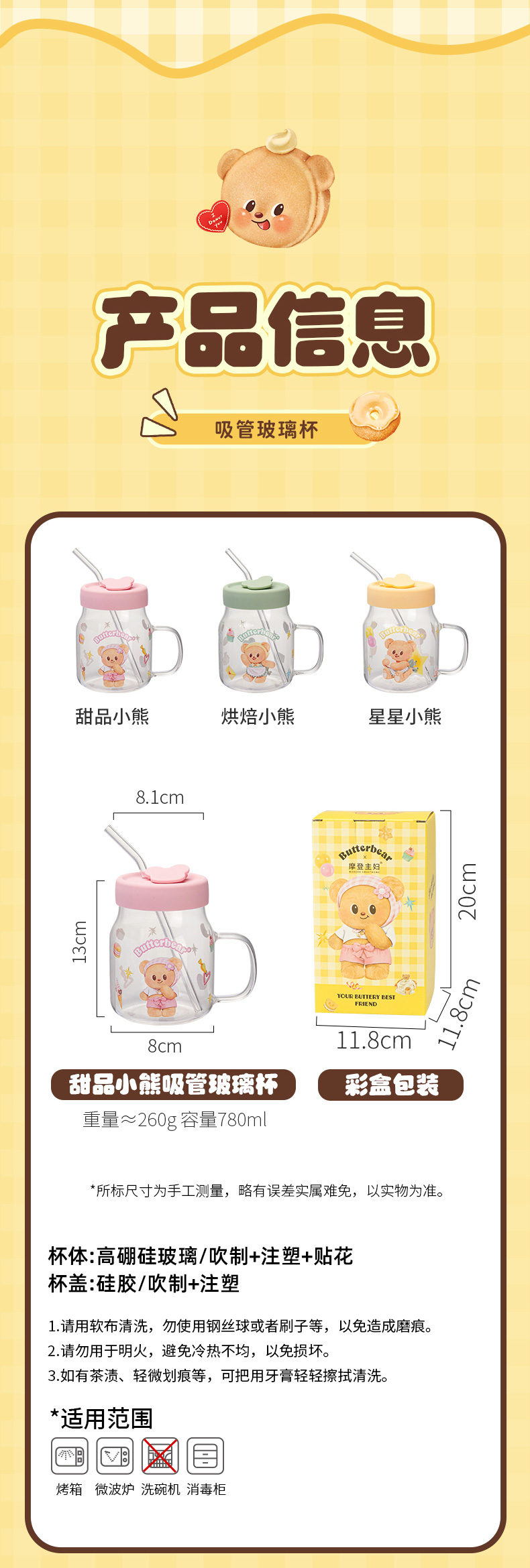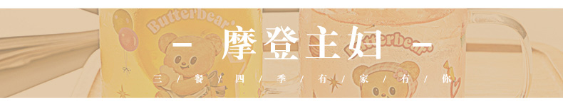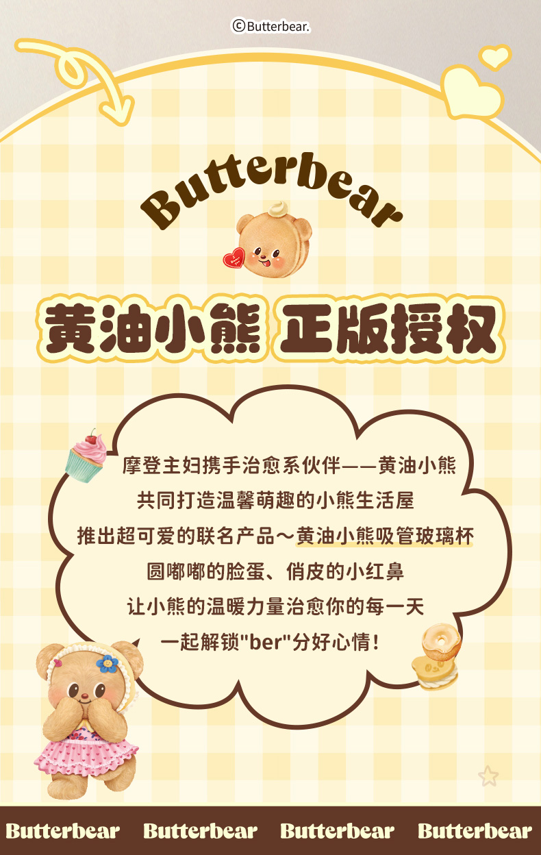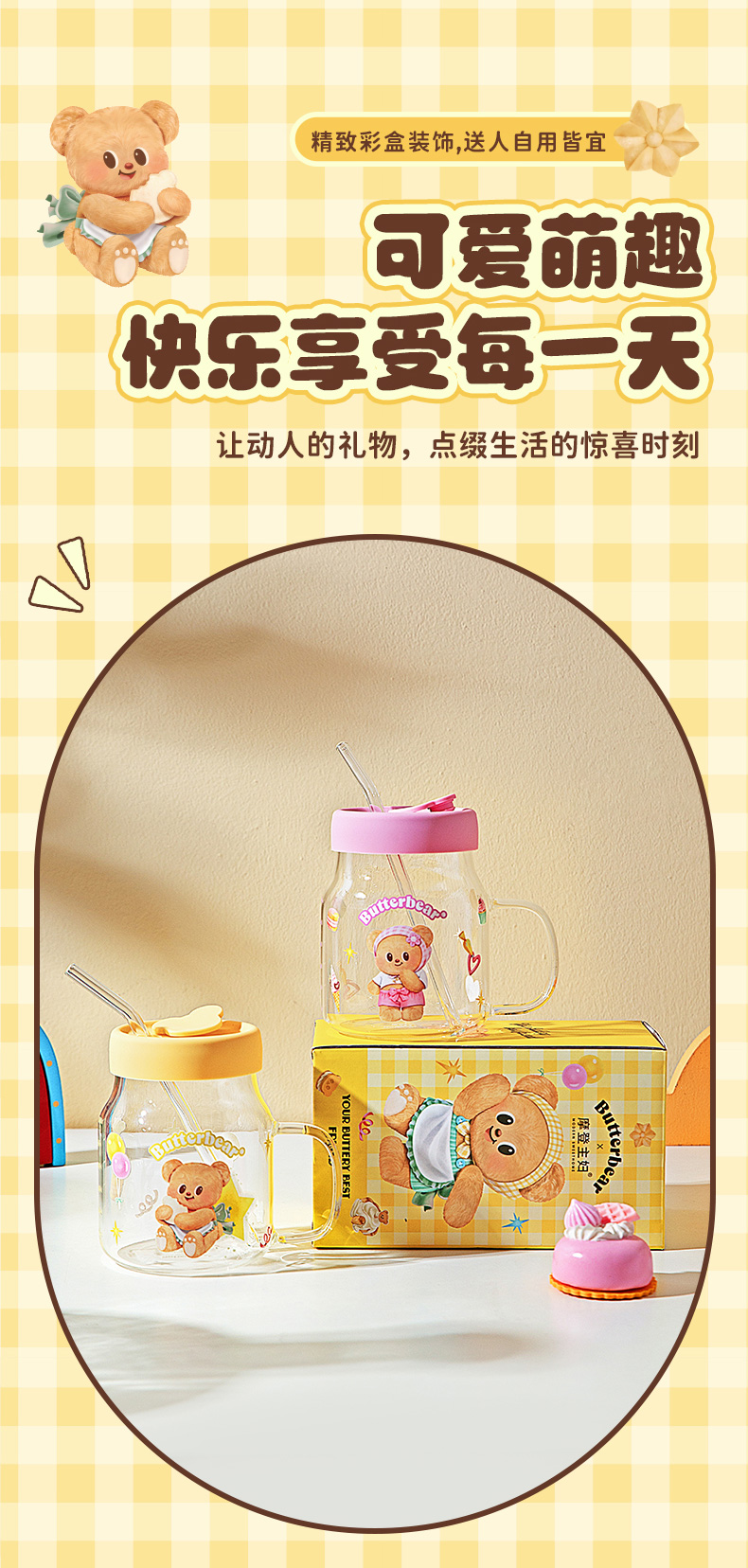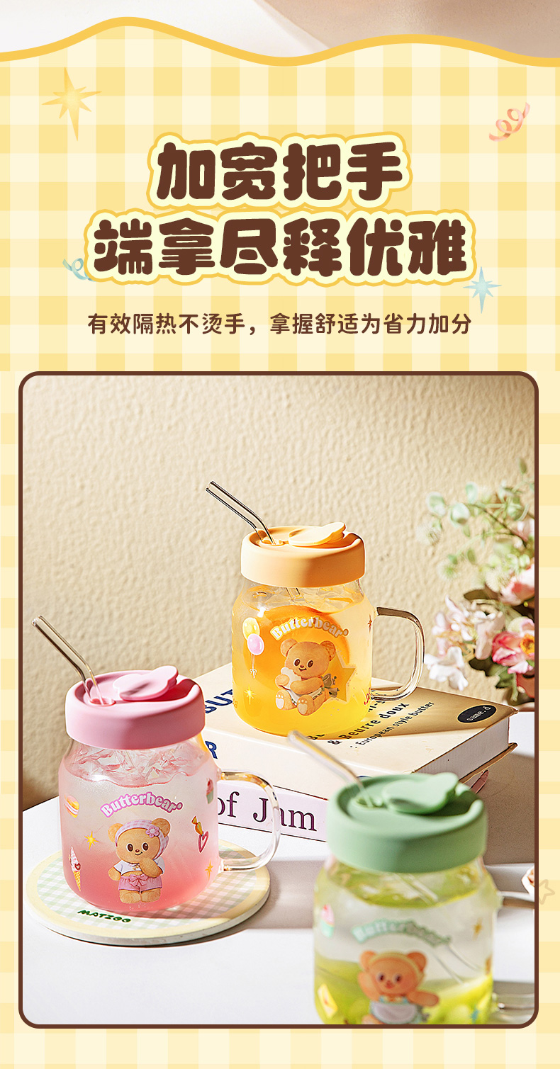 摩登主妇黄油小熊带盖玻璃杯吸管杯高颜值杯子女办公室水杯果汁杯