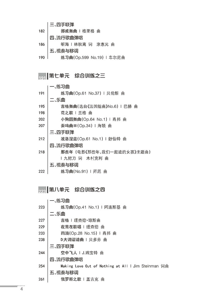 全书由浅入深分为八个单元,每一单元相对独立又相互联系,每一单元分为基本练习、练习曲、乐曲、四手联弹、流行歌曲弹唱五个部分。这八个单元,主要训练技巧为基本弹奏中的音阶、琶音、和弦等,基本涵盖钢琴弹奏的主要技术练习,同时还补充了练习曲,小奏鸣曲和复调曲来巩固技巧。为适应社会形势发展的需要,让学生更喜欢钢琴,本书中引入了流行音乐,增加了当下热门的流行歌曲的弹唱,内容难度不是太大,特别是前几个单元作品都比较简单,这样基础较薄弱的学生也可以弹奏,激起他们学习的热情。