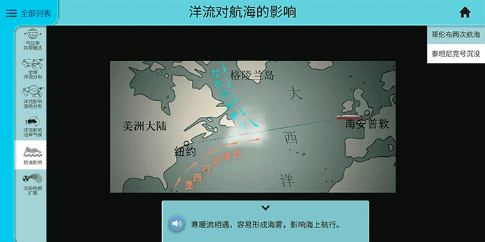 看看这AR动态画面,以显眼的蓝、红箭头代表寒、暖流,箭头运动,代表洋流流动方向,像不像小蝌蚪在游动,生动形象,全球洋流也在这趣味中,给孩子留个整体印象。