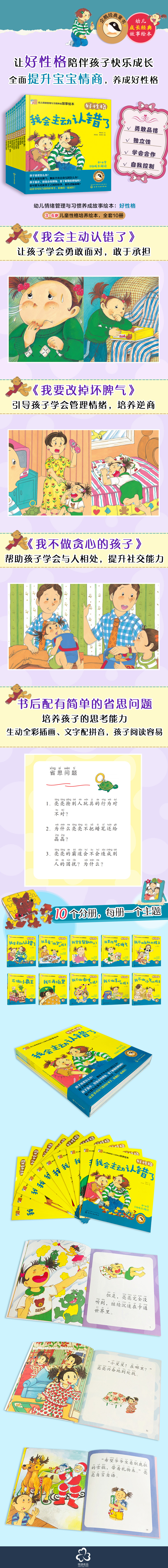 本书由10个分册组成,每个分册都是与孩子性格相关的主题,包括主动认错、不自私、会帮助别人、不小气等。年轻的父母可以借着和孩子共同阅读的机会,走进孩子的心灵世界,了解孩子,与孩子互动,帮助孩子树立正确的思想观念,引导孩子养成良好的性格。