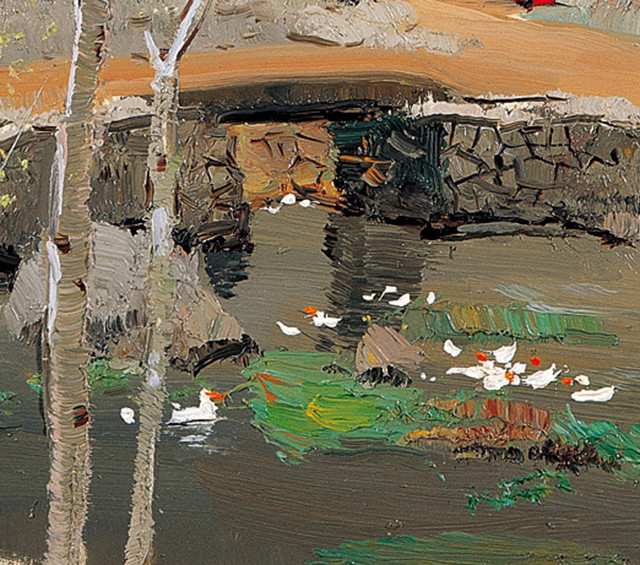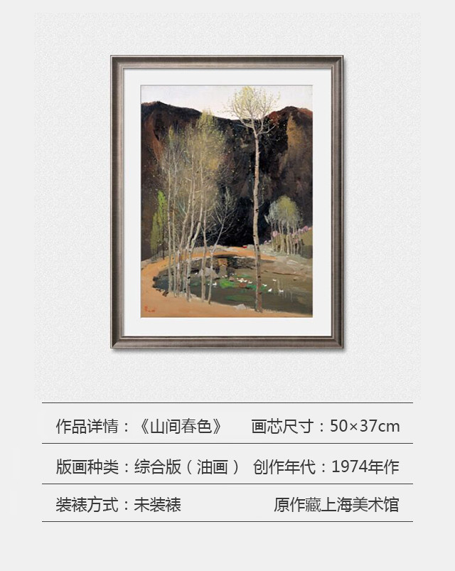 画面主要表现了群山映衬下的几株白杨树,在初春乍暖还寒的时节茕茕孑立于天地间,体现了画家纯真淡然的审美理想。