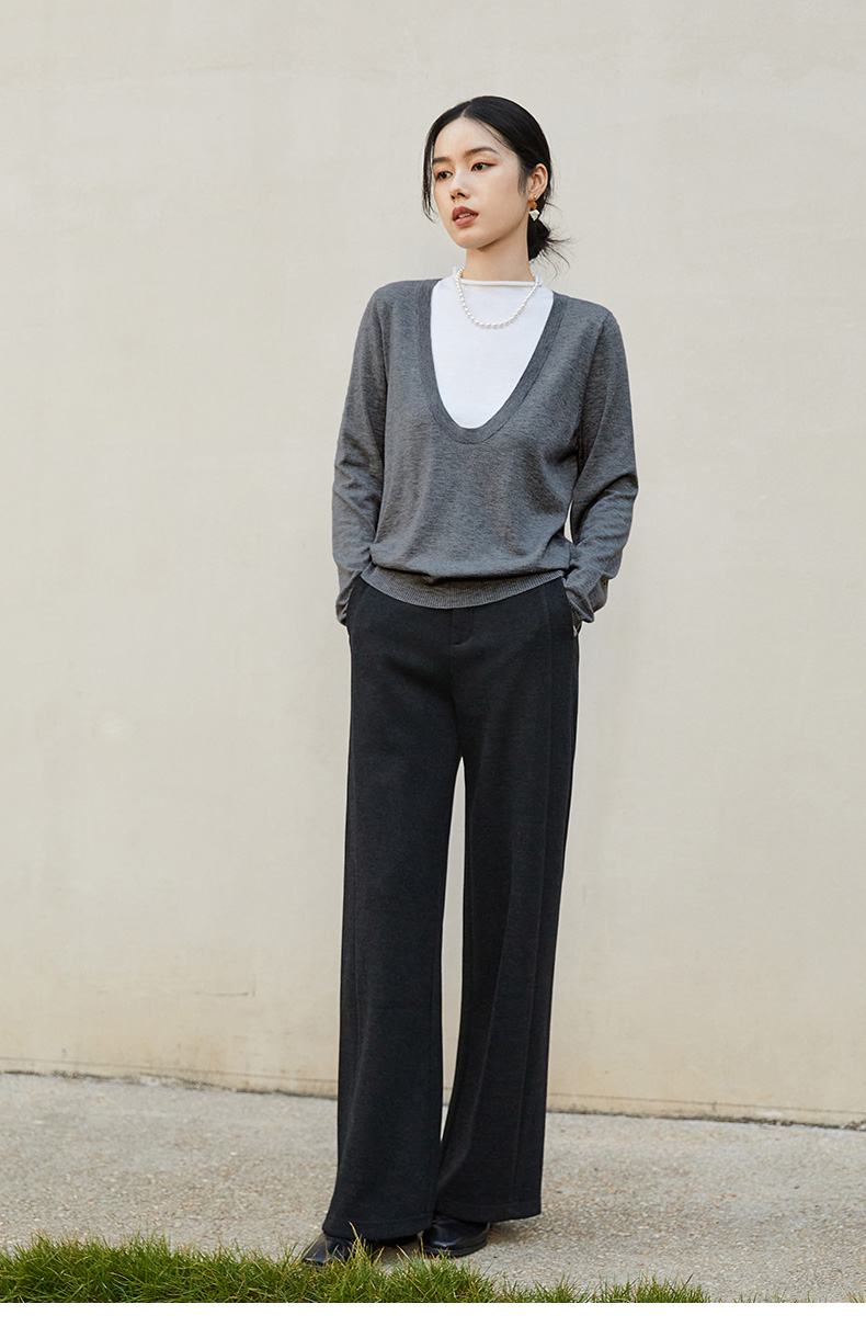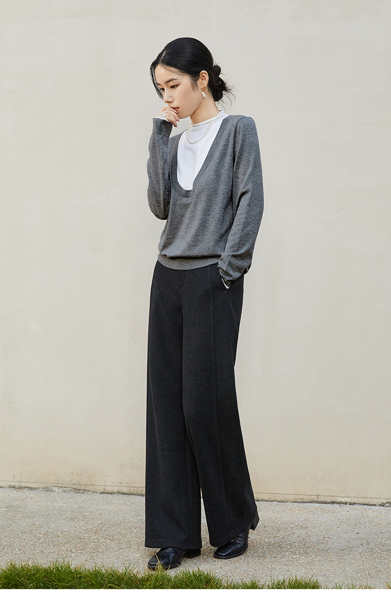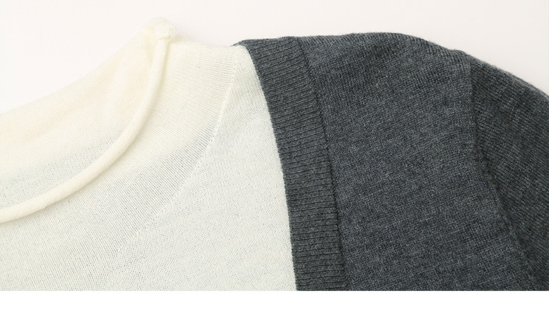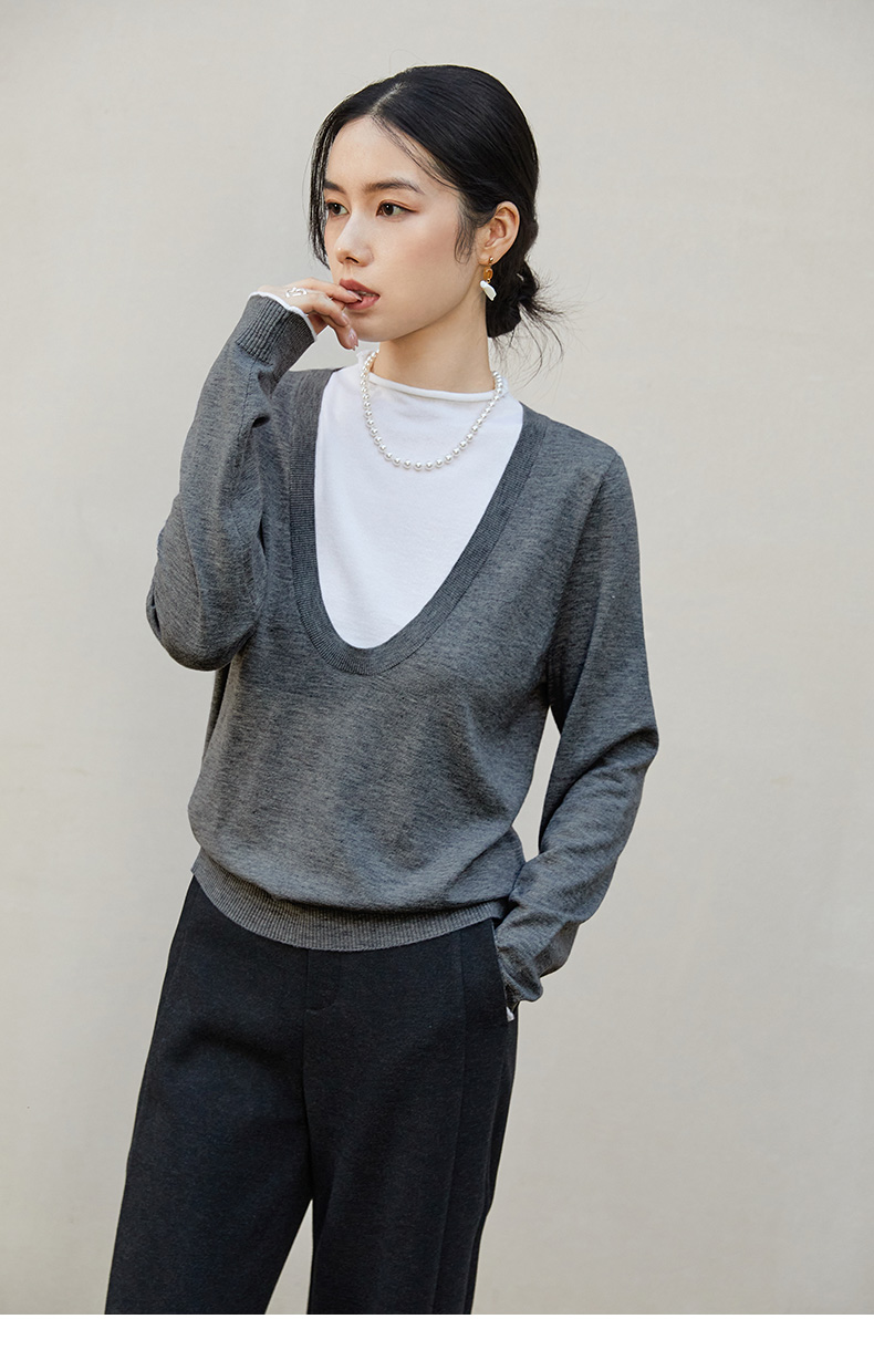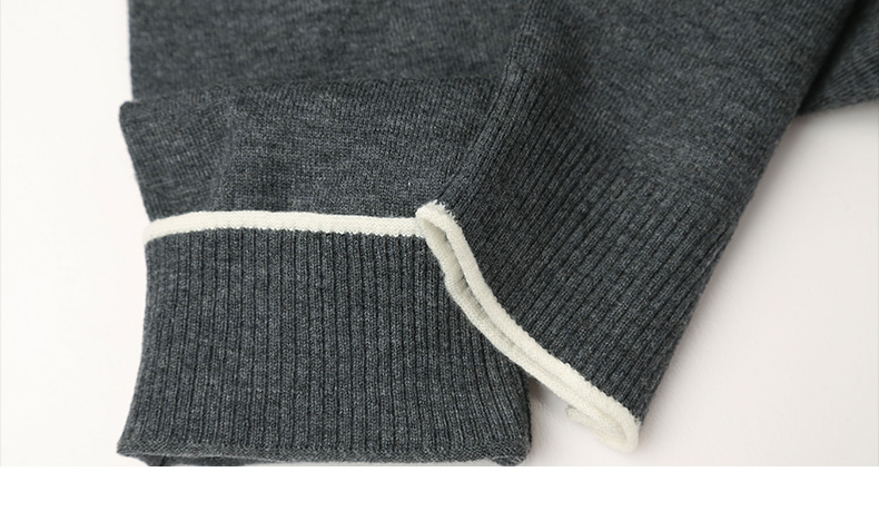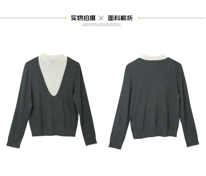 花灰色假两件 V 领针织衫 半高领撞色拼接修身显瘦长袖打底衫 秋冬通勤温柔气质内搭上衣