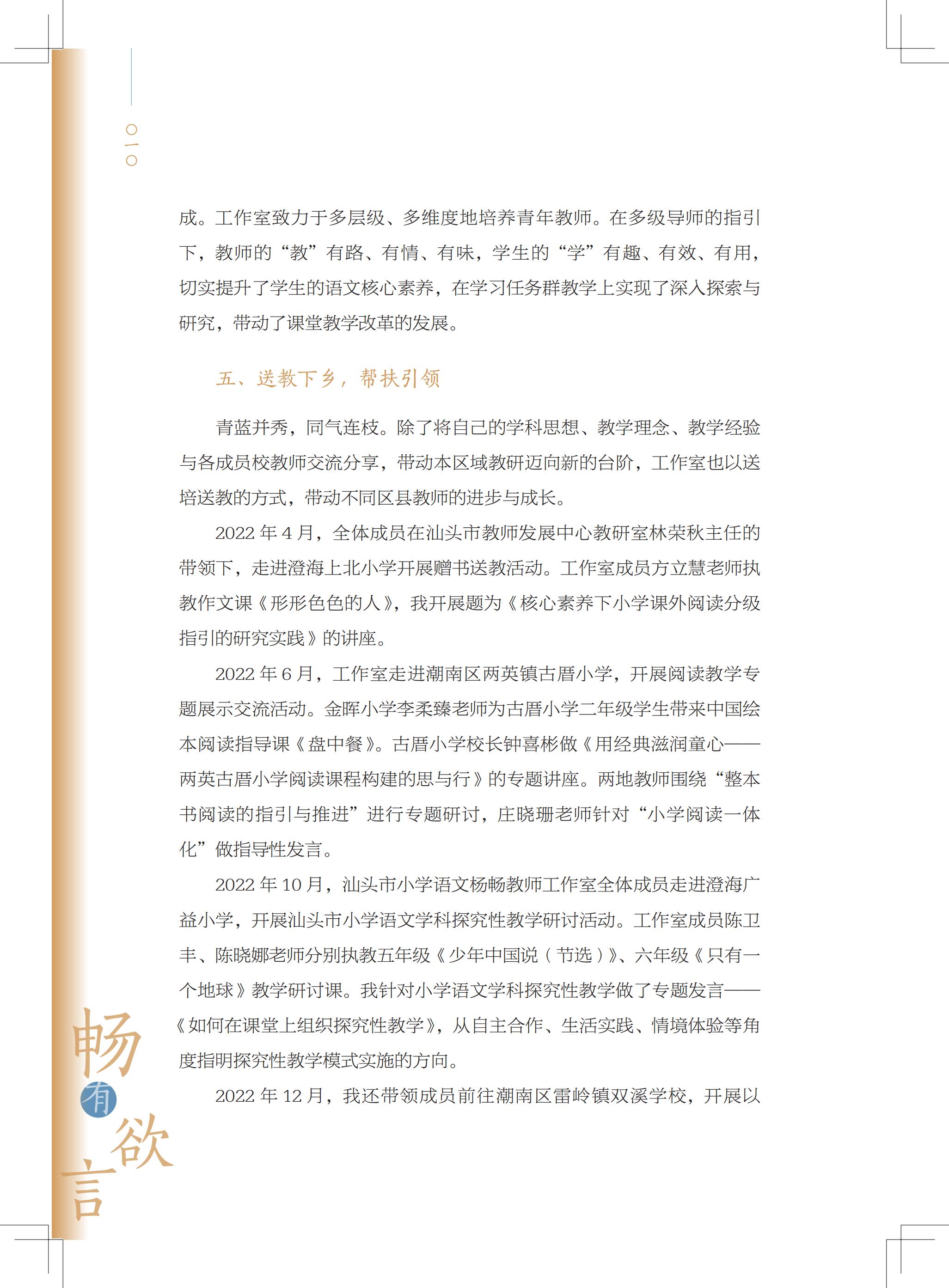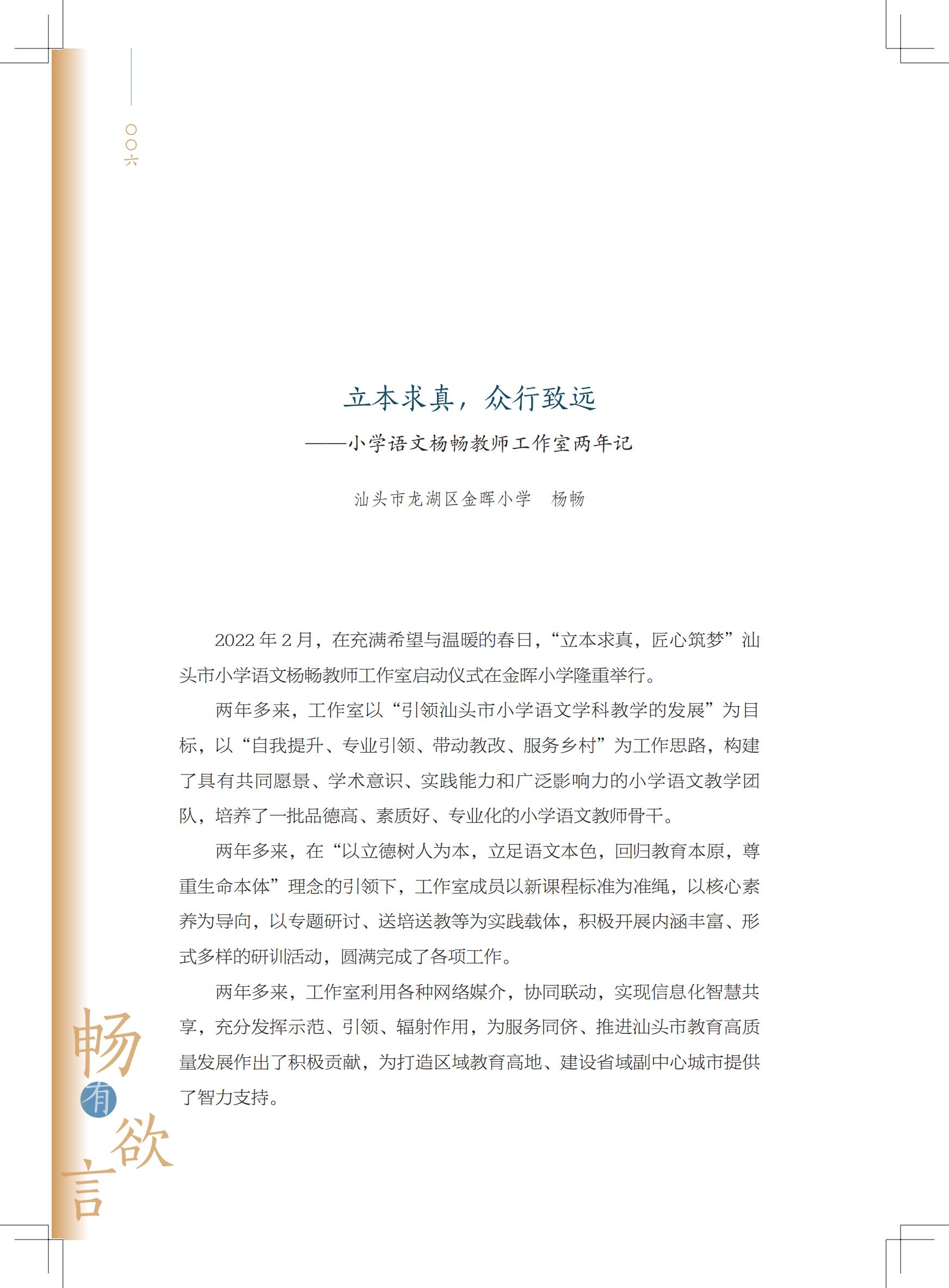 杨畅,小学语文高级教师,汕头市小学语文杨畅教师工作室主持人,汕头市小学语文兼职教研员、中小学教师研训专家库成员。从事小学语文教学教研工作三十年,省骨干教师、市优秀教师、课程改革先进工作者、区优秀教师、优秀班主任。