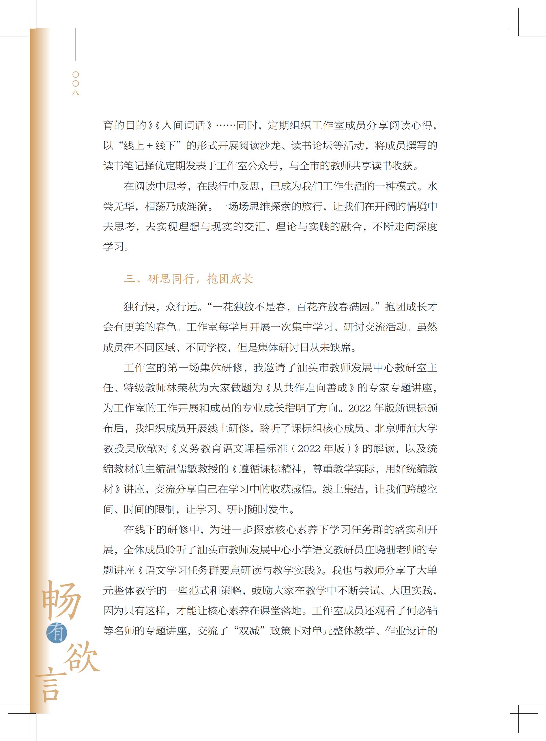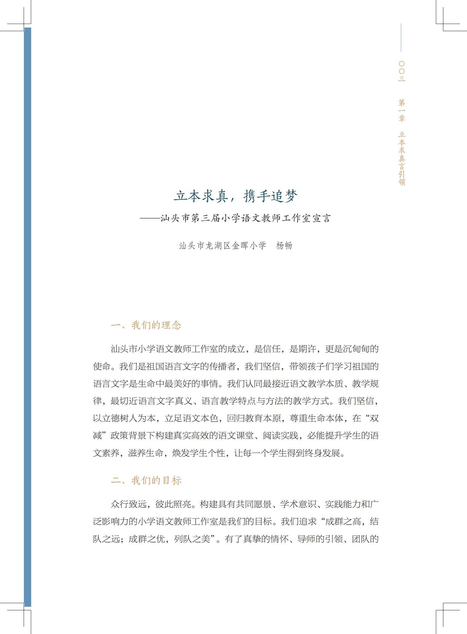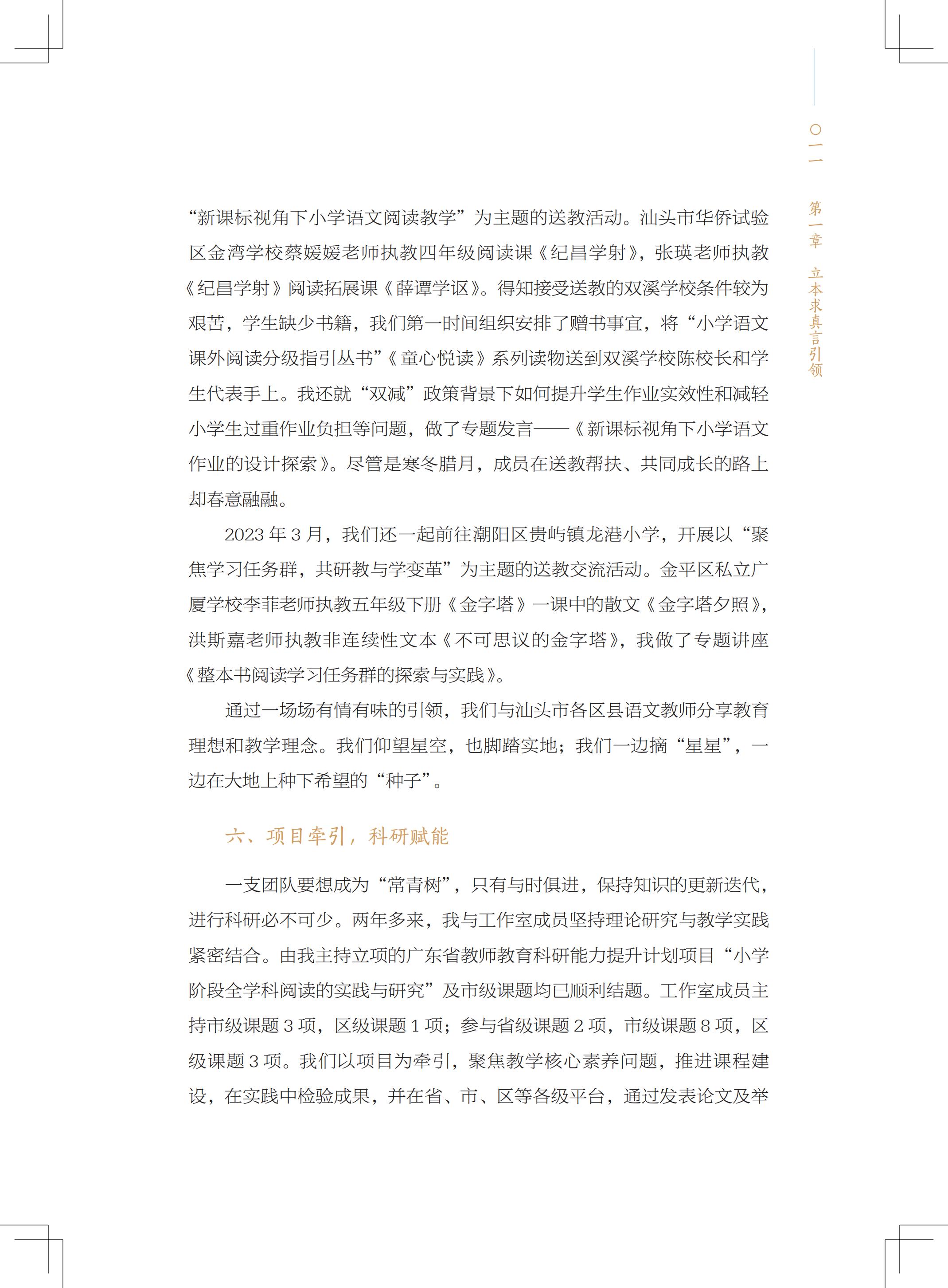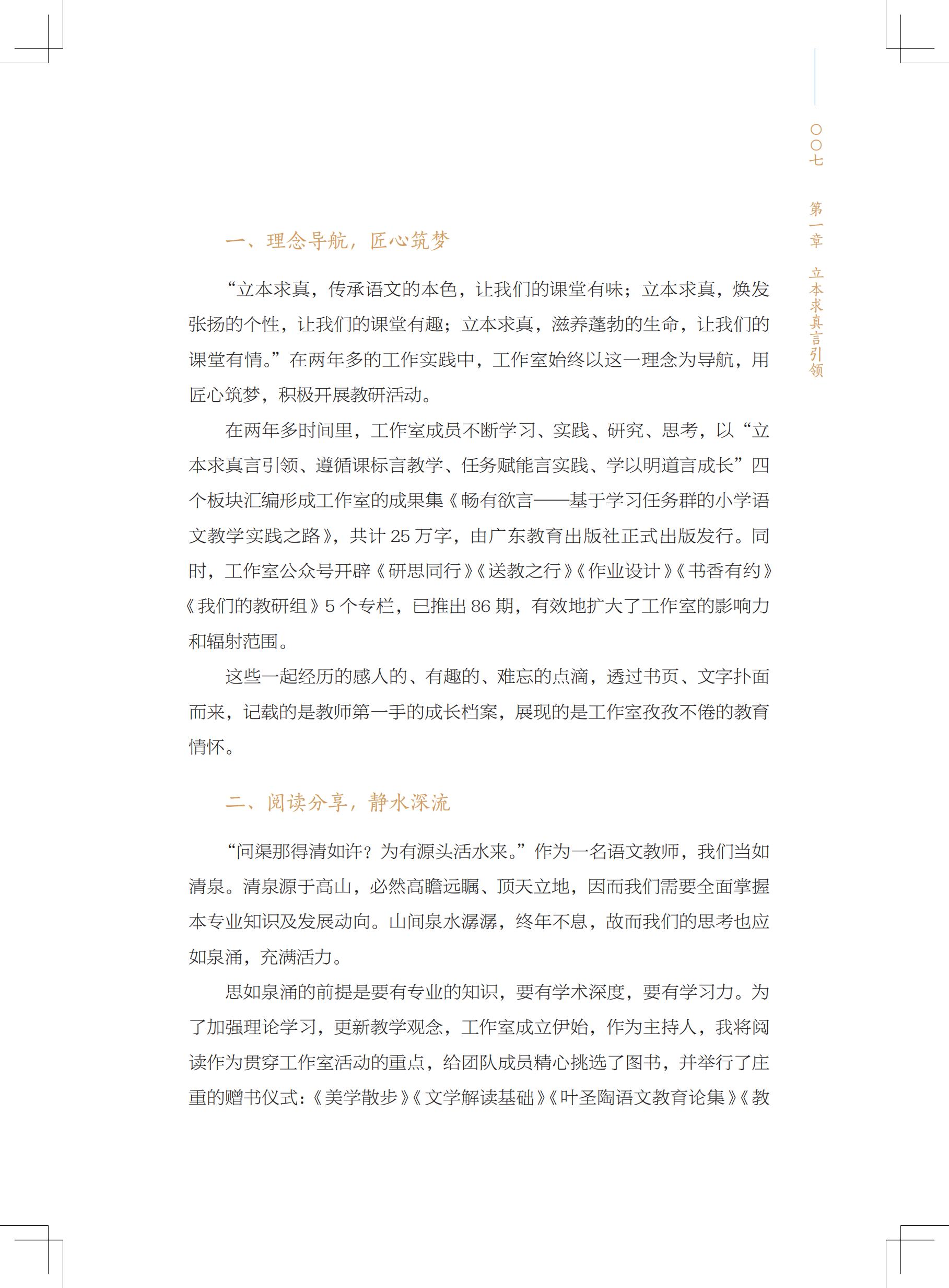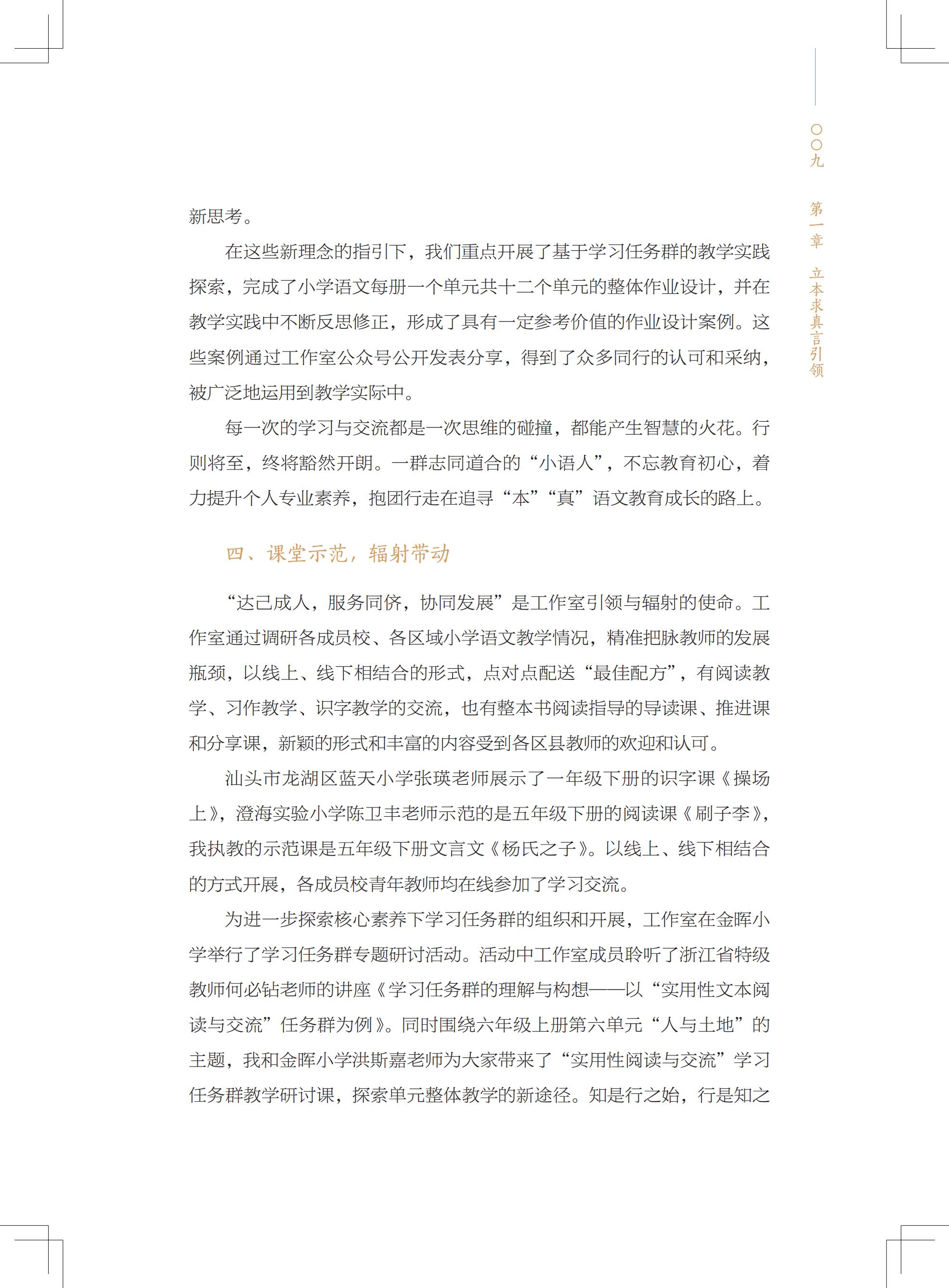 本书梳理工作室团队这两年来的教学实践研究历程及成果,秉持工作室提出的“立本求真”的教学理念,落实《义务教育小学语文课程标准(2022年版)》核心素养的目标和要求,以“学习任务群”为研究的核心,分为立本求真言引领、小语课标言思考、任务赋能言实践、学以明道言成长四个板块,收录了工作室的宣言、总结,成员的论文、教学及作业设计案例、读书随笔。本书呈现了小学语文教研团队携手成长的历程,也分享了一线教师对新课标的思考与探索,为学习任务群的教学和单元整体作业的设计提供了可借鉴使用的范本。