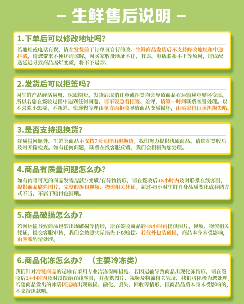 【关于售后】因产品的特殊性(生鲜冻品类),不支持七天无理由退货,收到后如有少货,破损等情况,请签收后24小时内联系客服处理!
