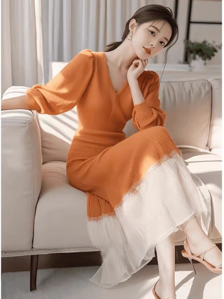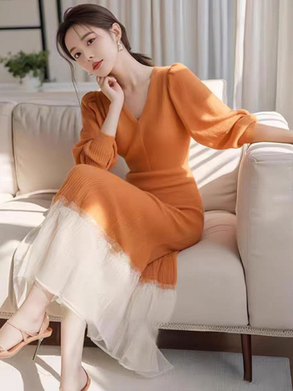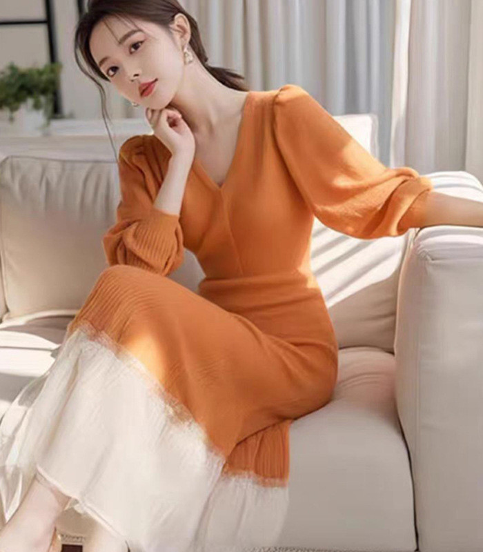 新款橘色针织连衣裙上流社会独特漂亮设计感长裙