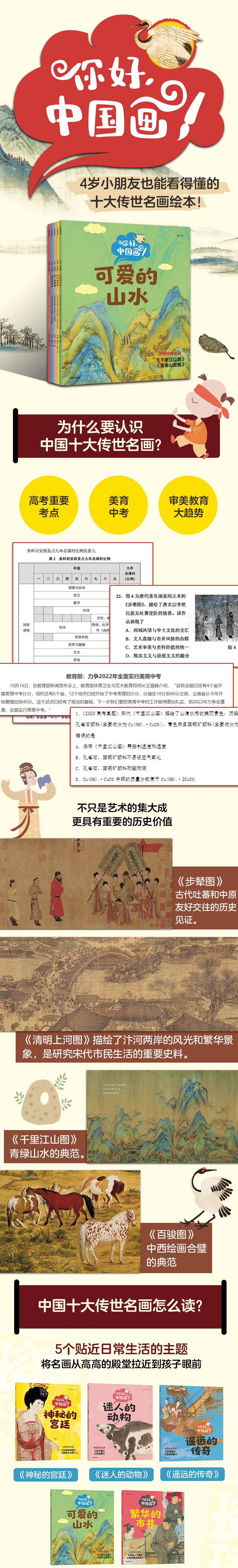 《你好,中国画!》系列图书共5册,分别为《可爱的山水》《繁华的市井》《神秘的宫廷》《遥远的传奇》和《迷人的动物》,是一套面向3-6岁儿童的艺术启蒙绘本。