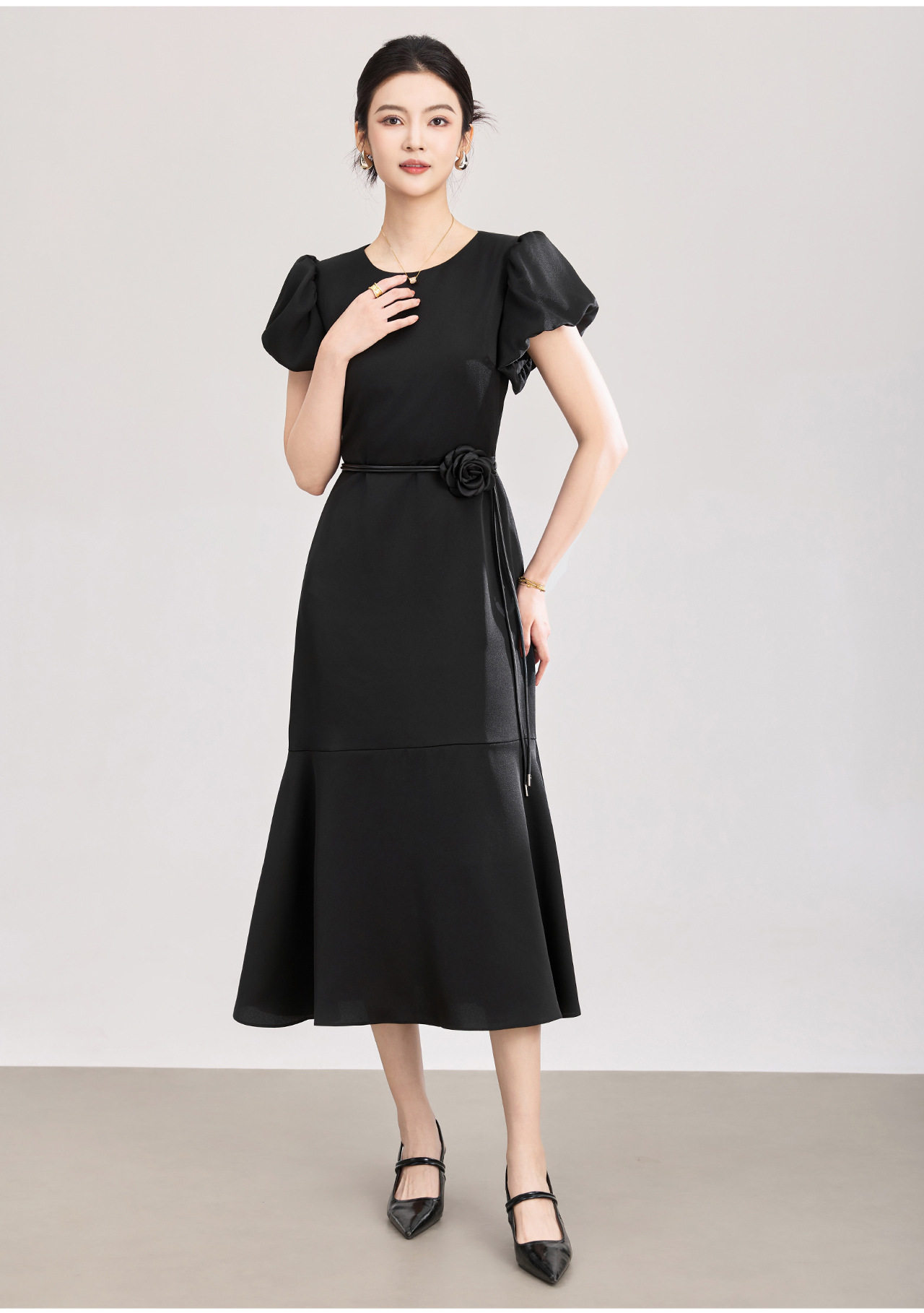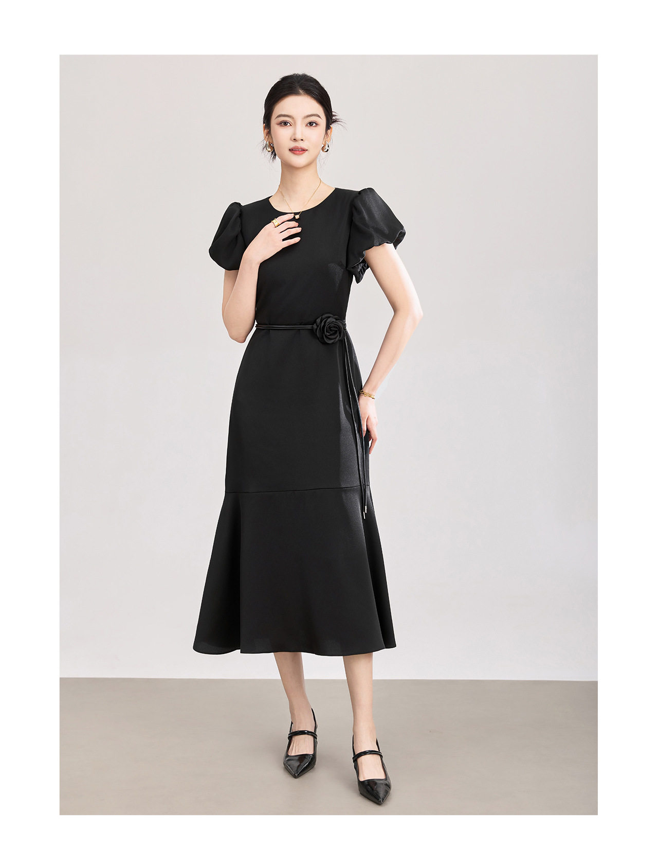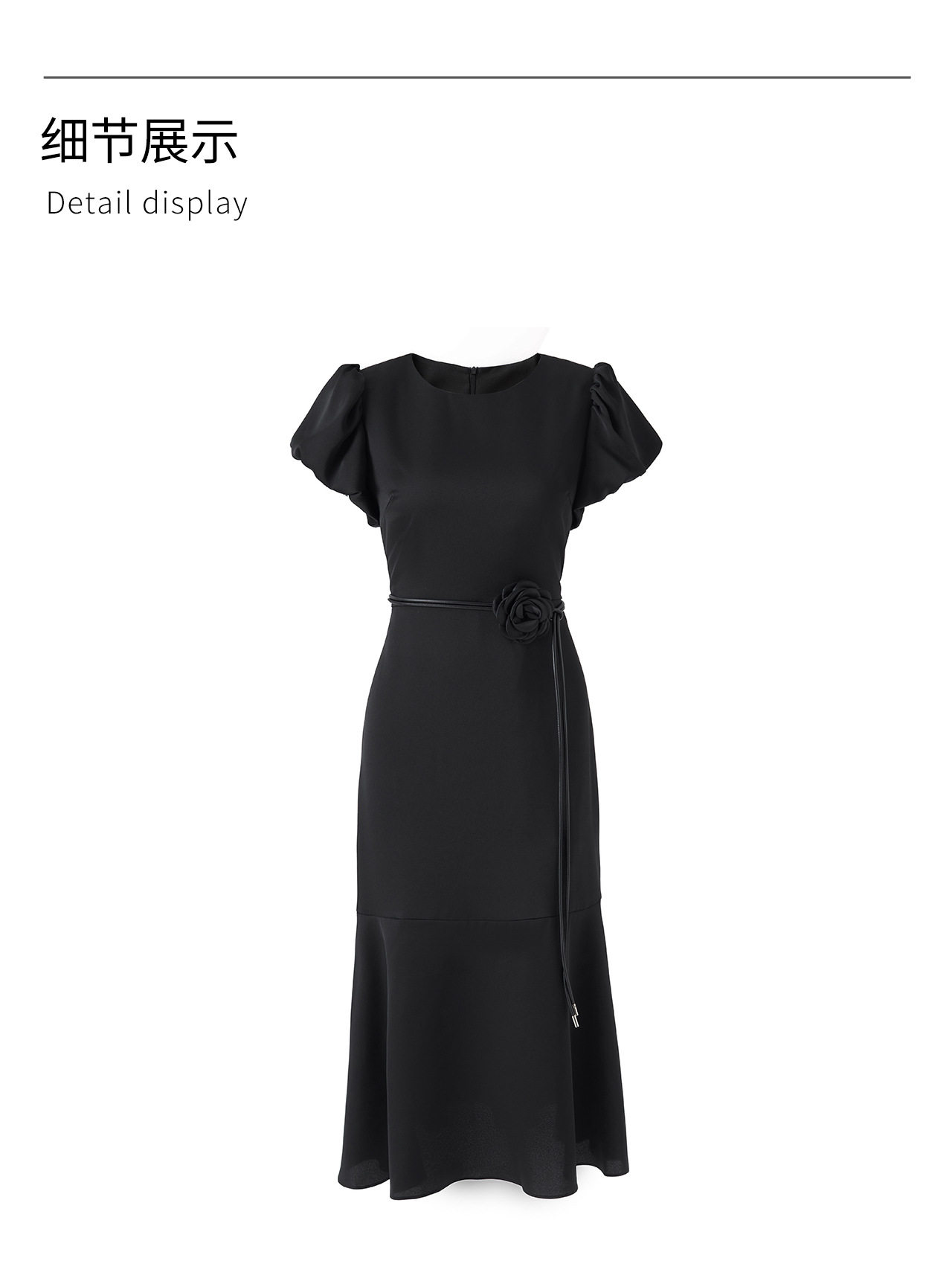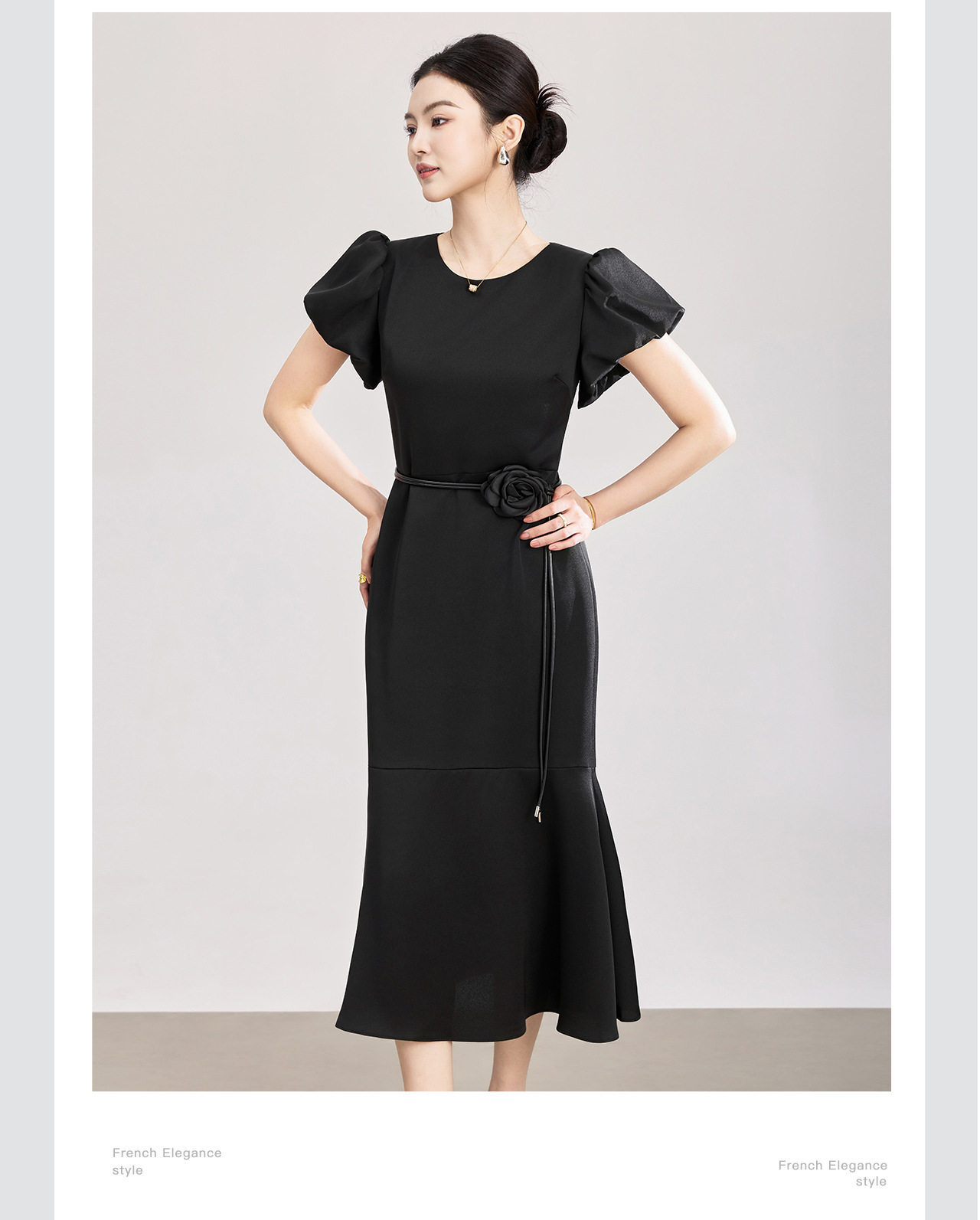 「高货wl」全新升级【铂金会员367/天猫489/差价122】(21403)洛诗琳2026新款气质泡泡袖山茶花腰带鱼尾摆修身连衣裙女