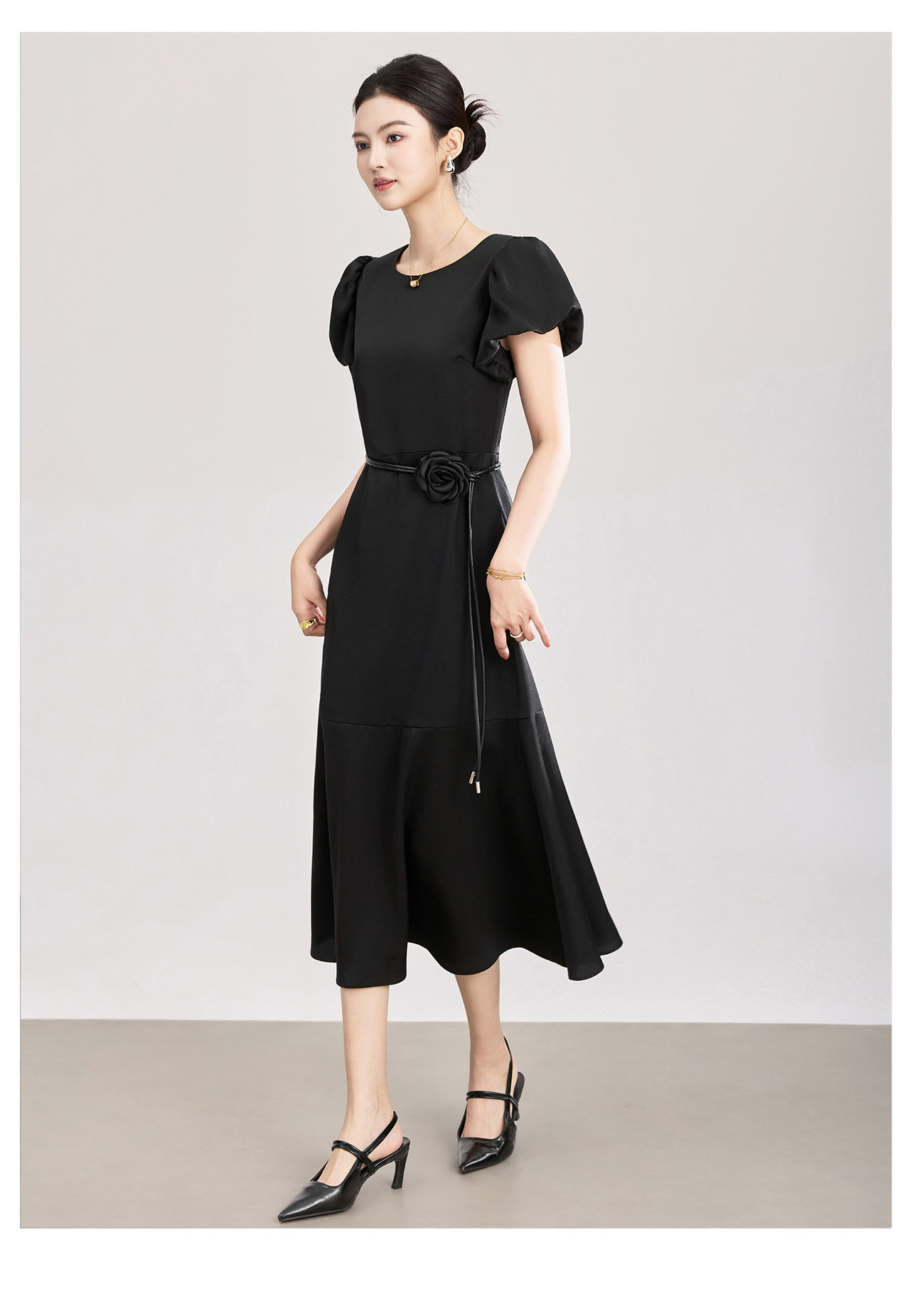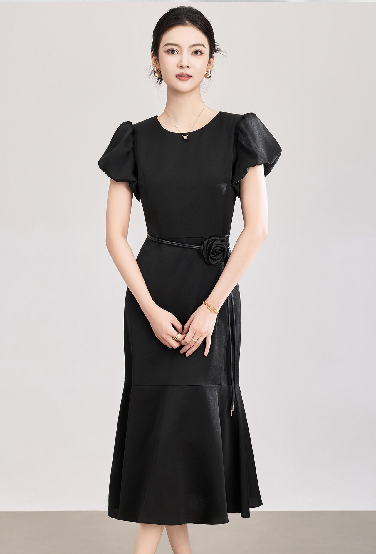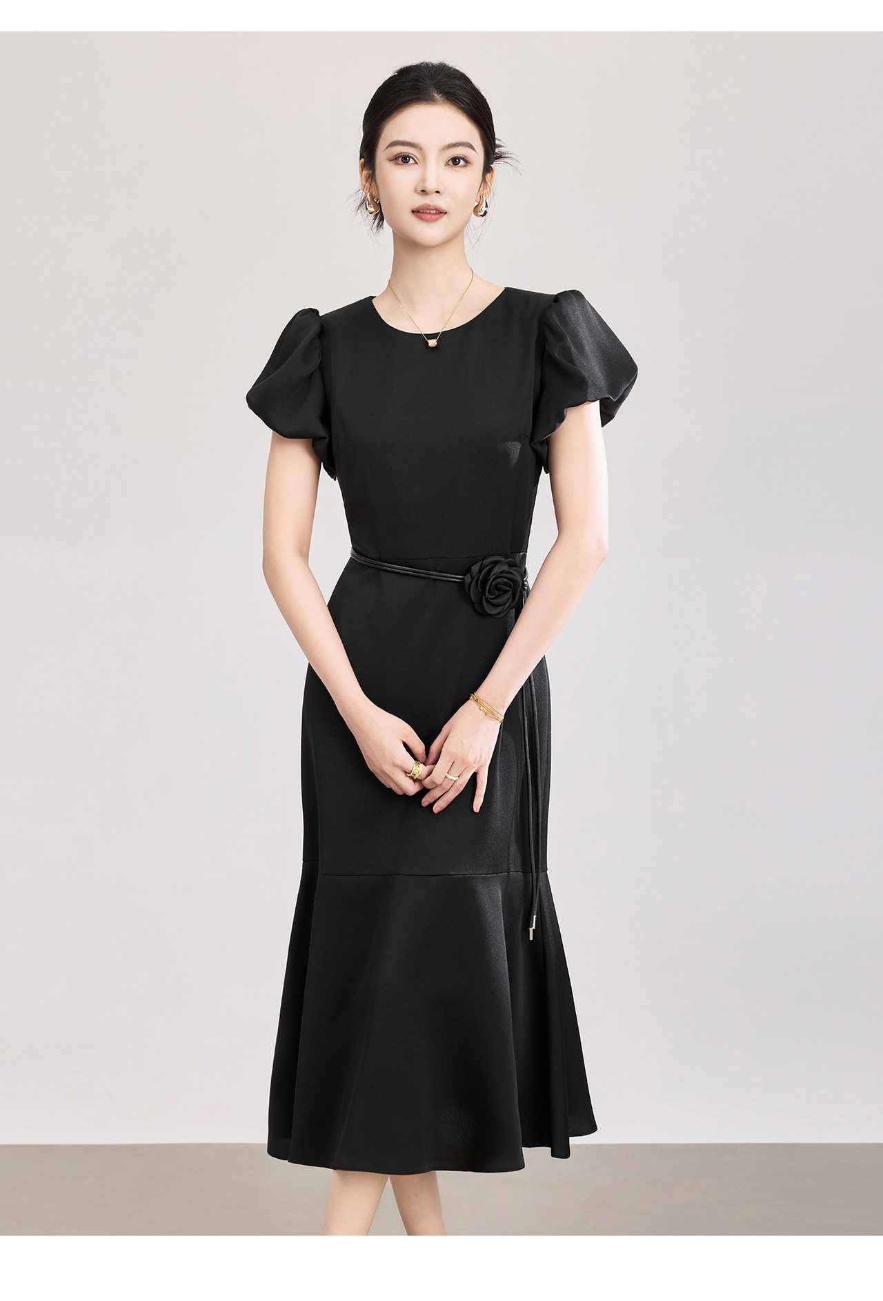 「高货wl」全新升级【铂金会员367/天猫489/差价122】(21403)洛诗琳2026新款气质泡泡袖山茶花腰带鱼尾摆修身连衣裙女