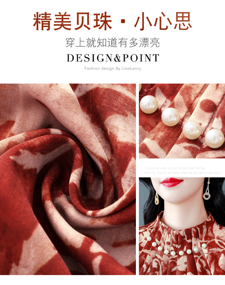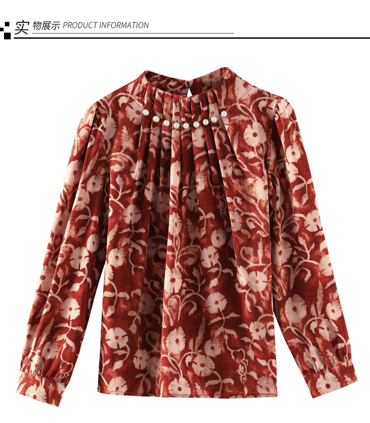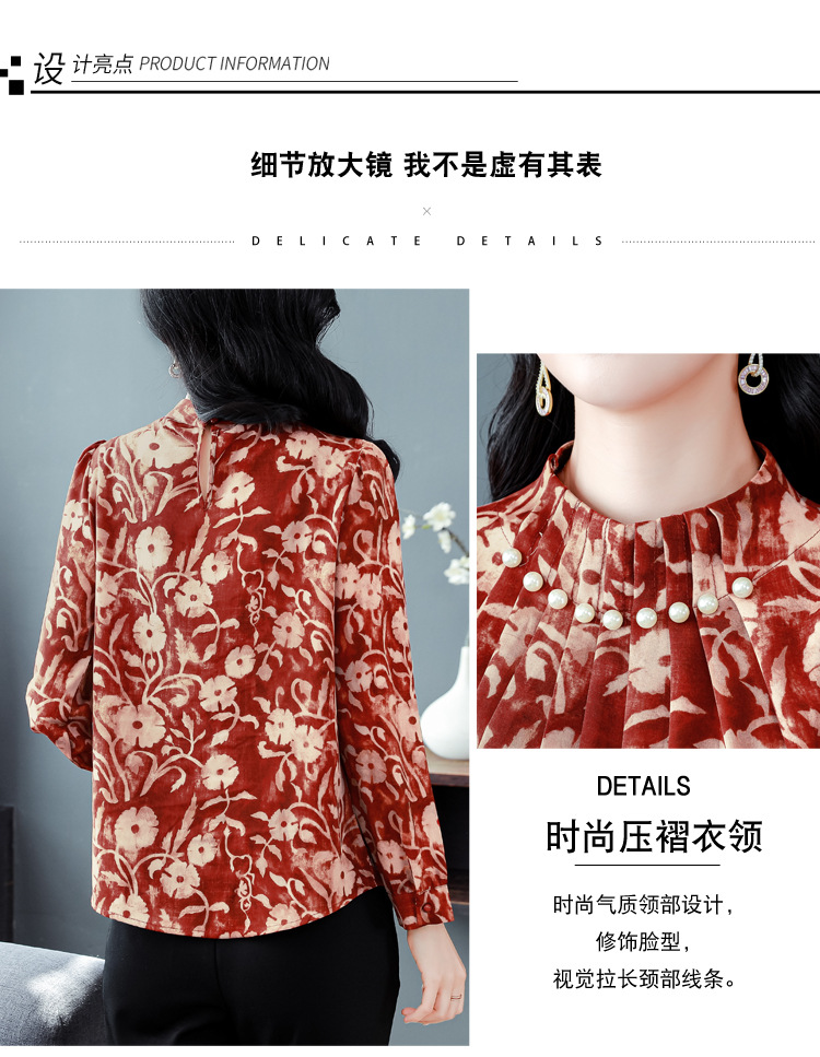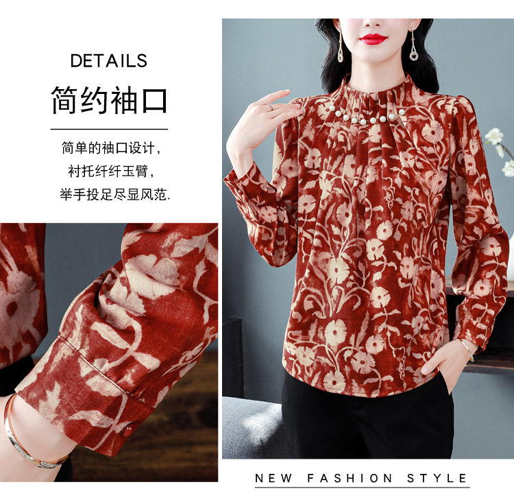 KQL369H99782025年秋装新款缎面立领钉珠印花长袖雪纺衬衫女春秋洋气衬衣