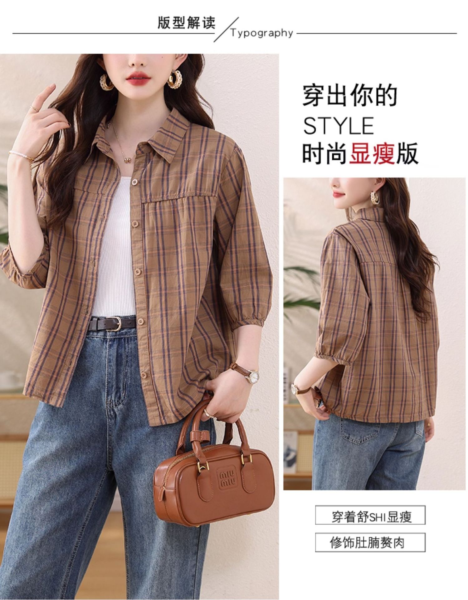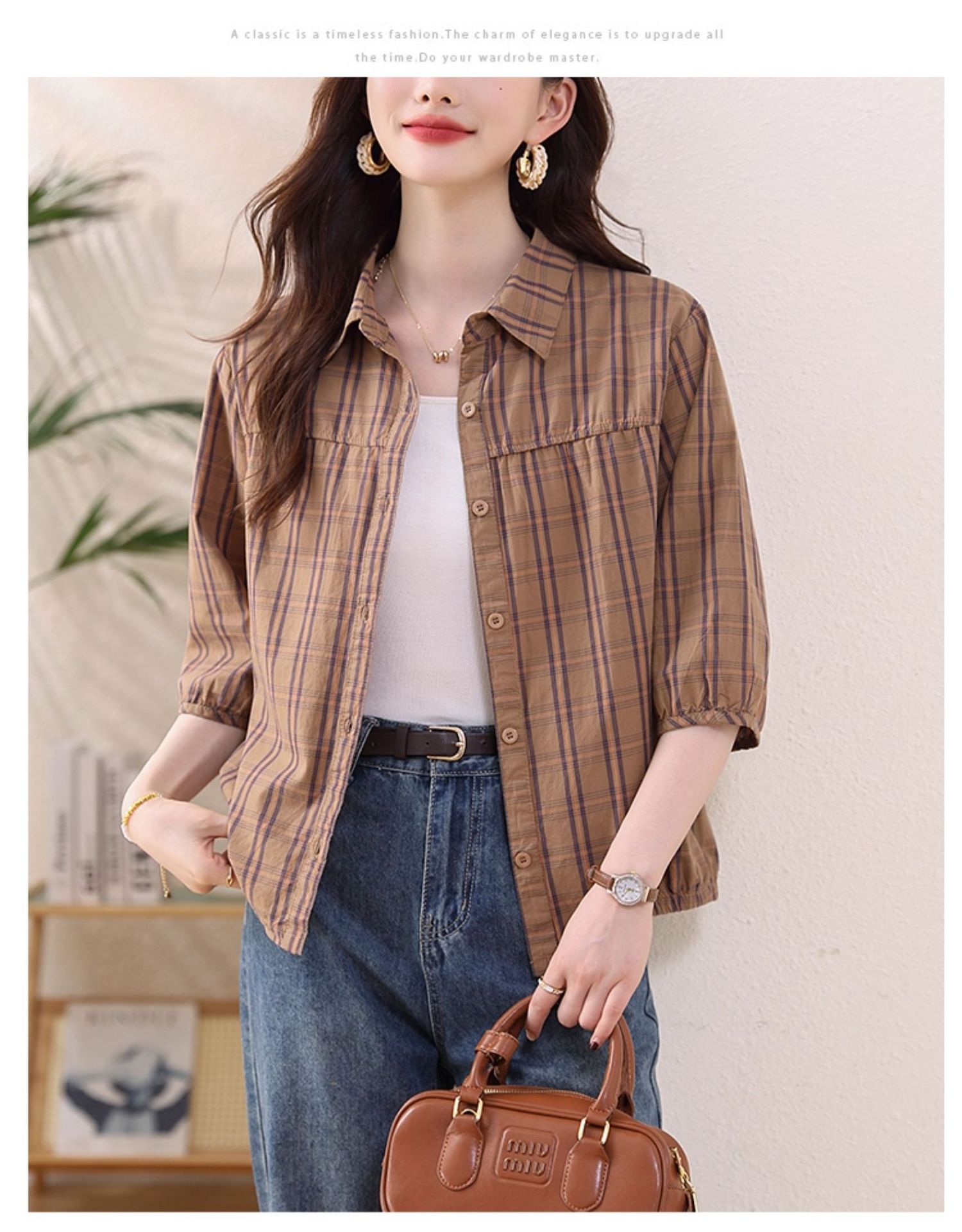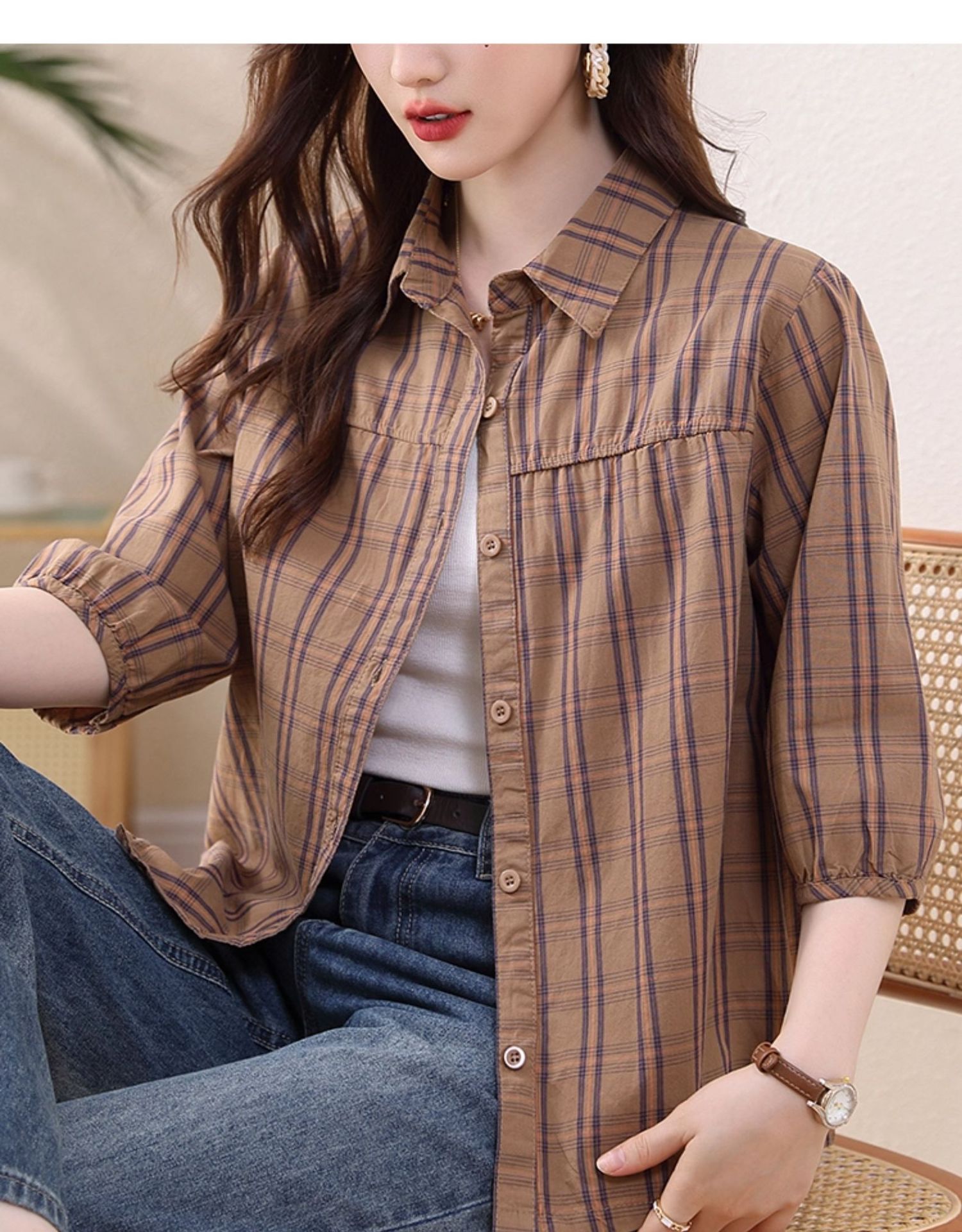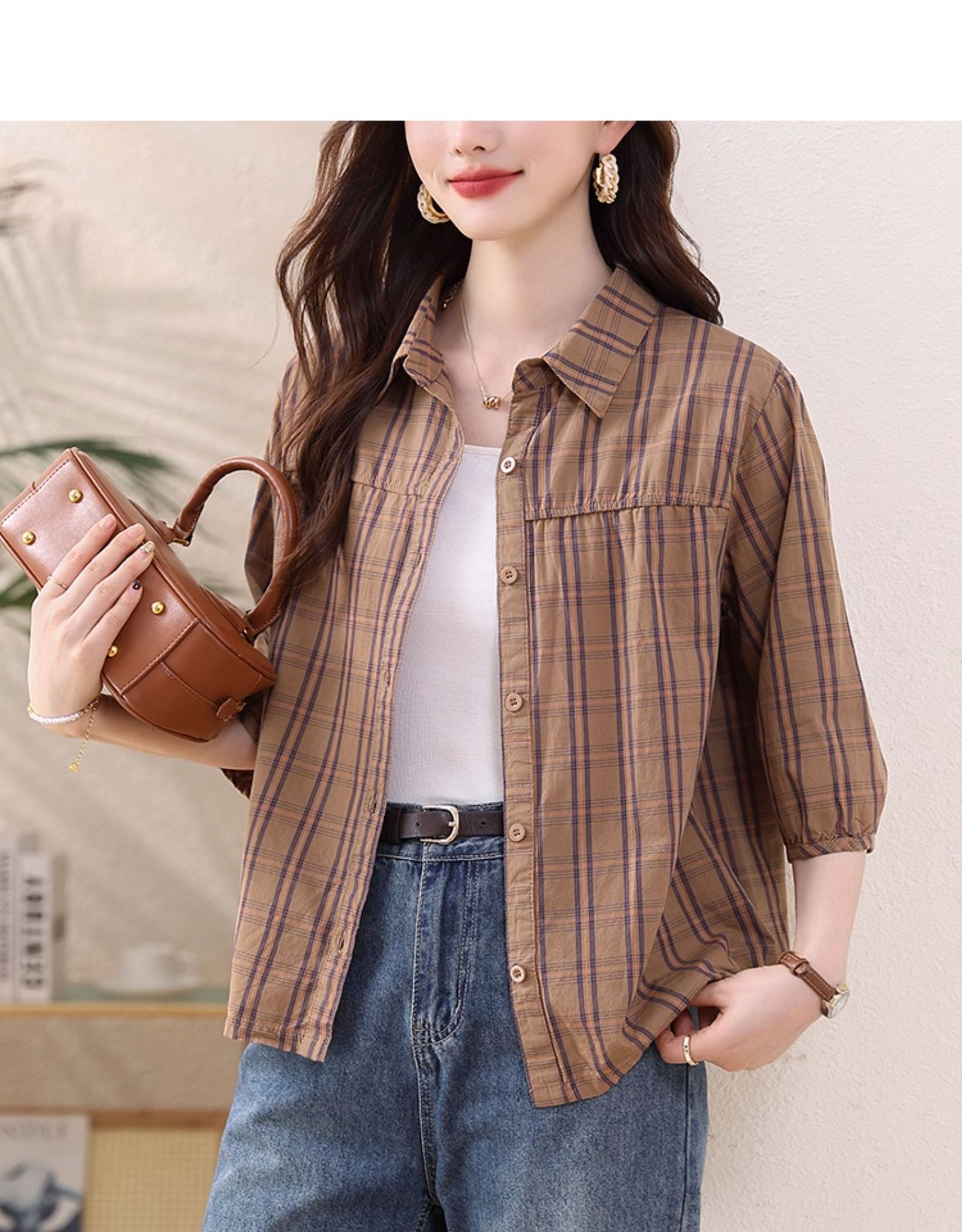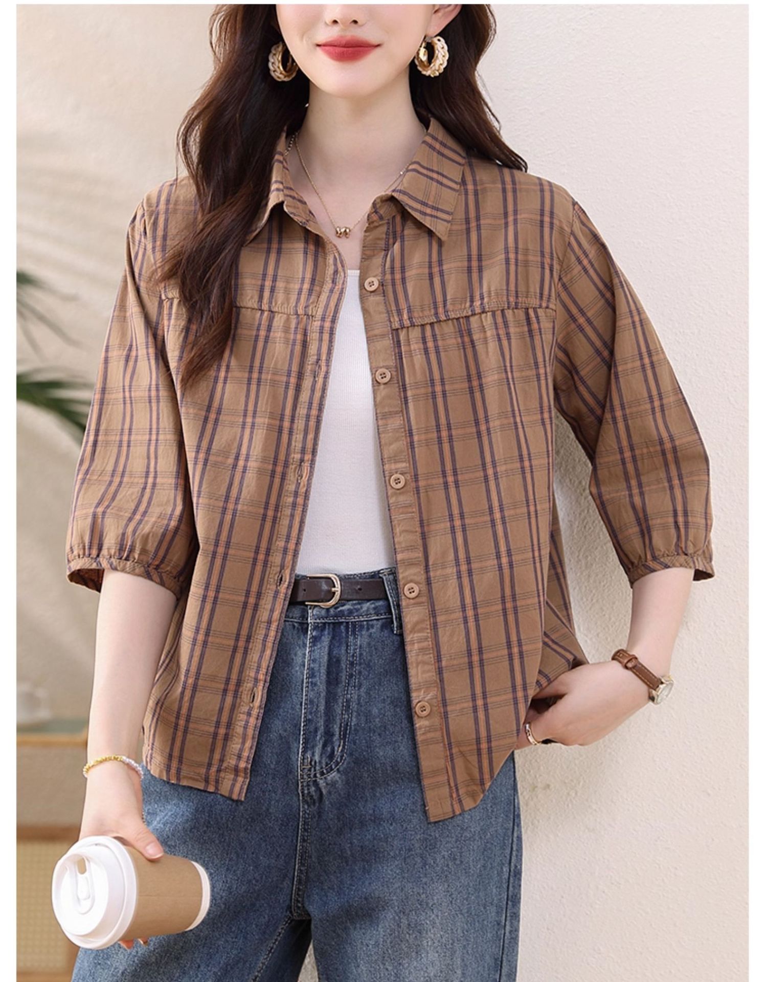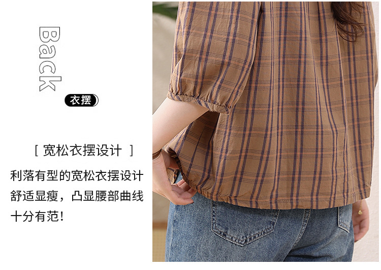 夏装新款女士时尚衬衫中袖上衣女秋夏妈妈装宽松遮肚显瘦棉衬衣潮