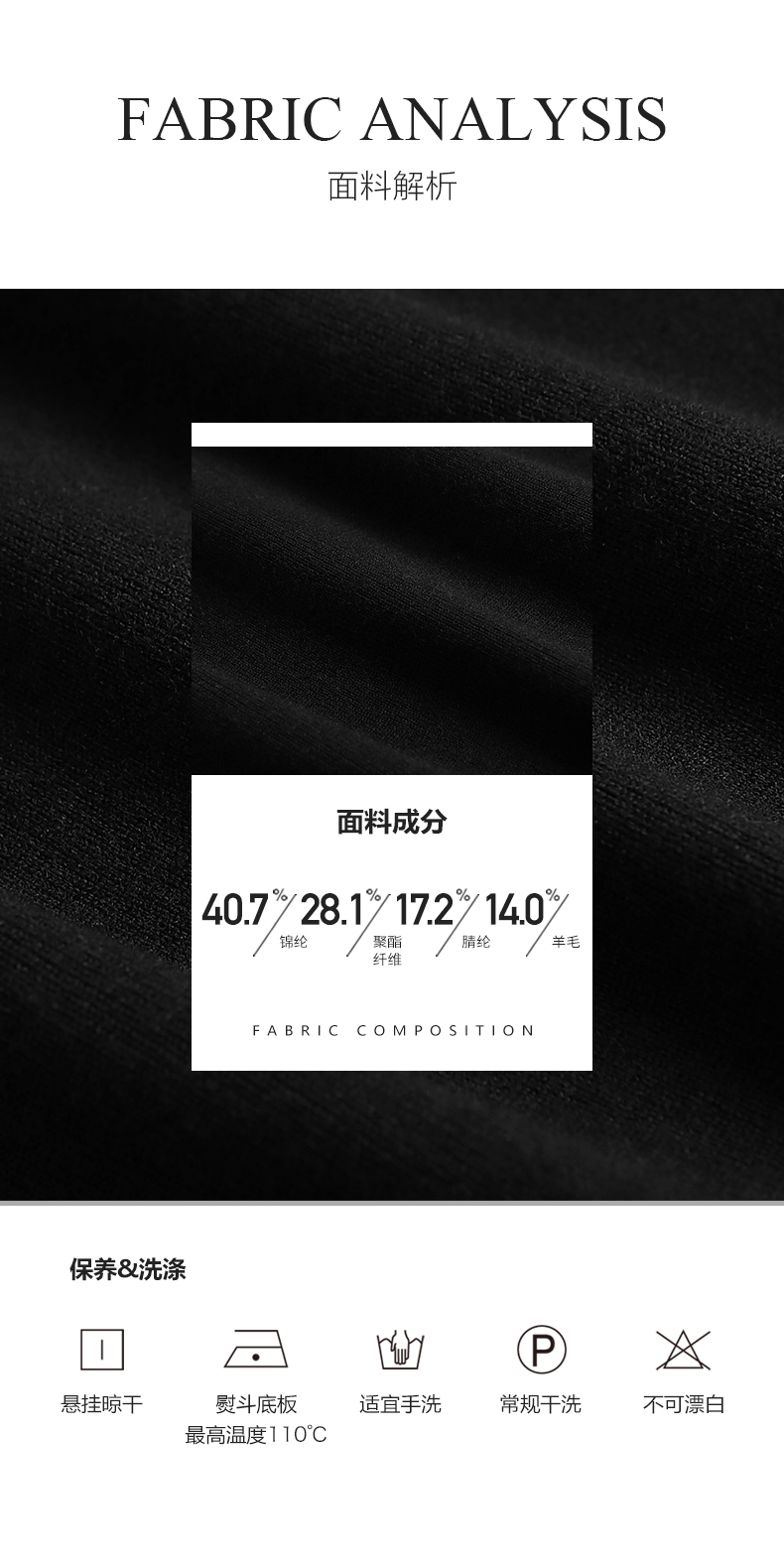 | 材质成分: 聚酰胺纤维(锦纶)40.7% 聚酯纤维28.1% 聚丙烯腈纤维(腈纶)17.2% 羊毛14% |