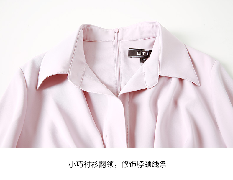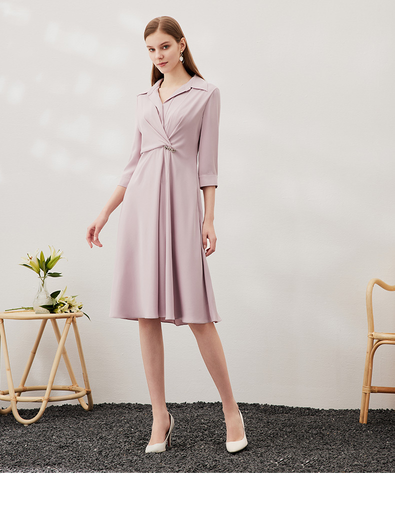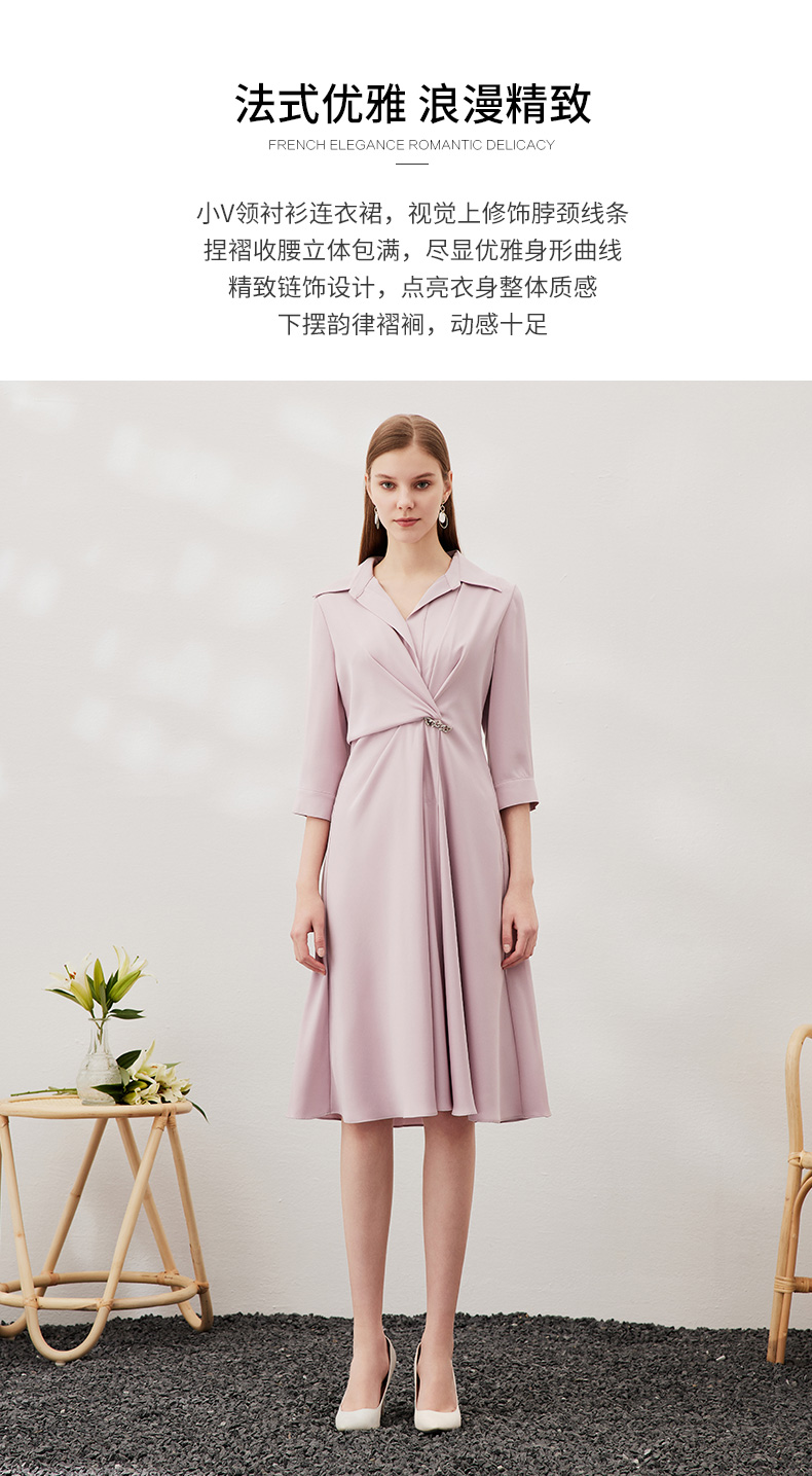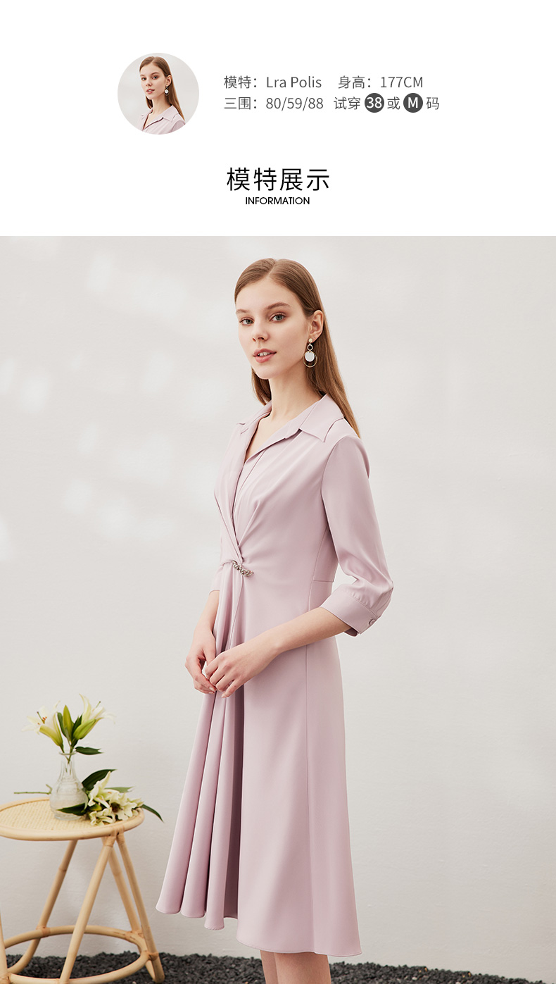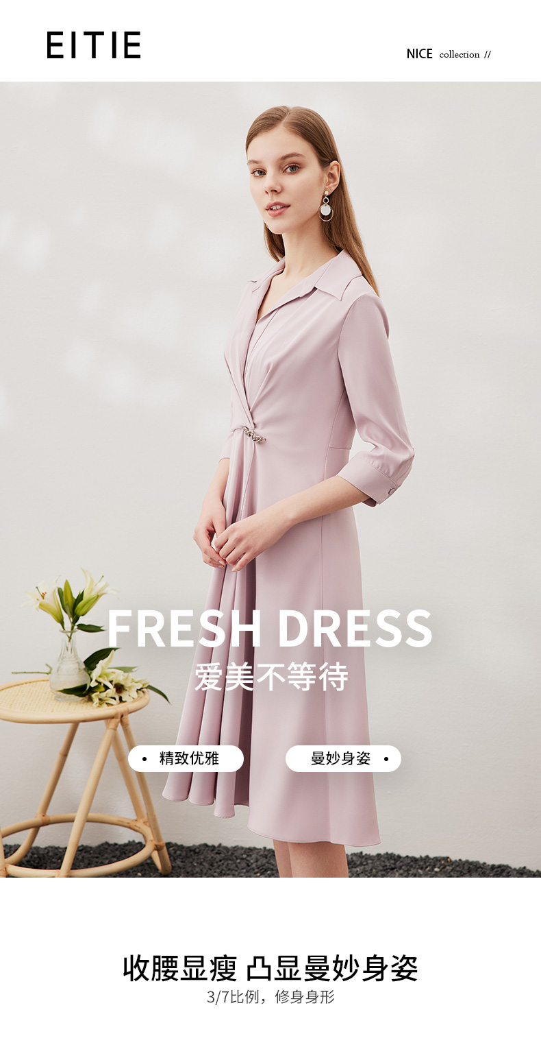 EITIE爱特爱春季新款优雅五分袖V领显瘦收腰过膝连衣裙6907628