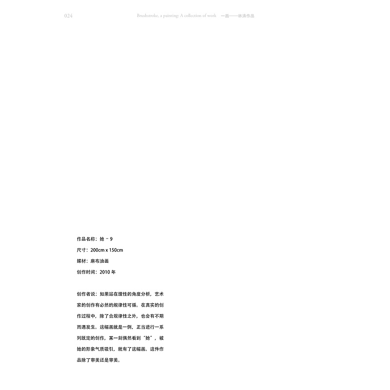 本书为林涛先生油画作品展同名展览图录。书中收录的作品以油画为主,并有部分丙烯和速写,题材有以表现其身边同事、友人的人物肖像创作,有表现上世纪末至解放前后杭州的风土人情,有用油画语言对“宋画”的再创作,有个性选题的综合创作,以及部分风景、静物的写生作品。主要画作多以黑白灰和选择性基本色组合色调表现,呈现出单纯、简洁、平静的视觉体验。