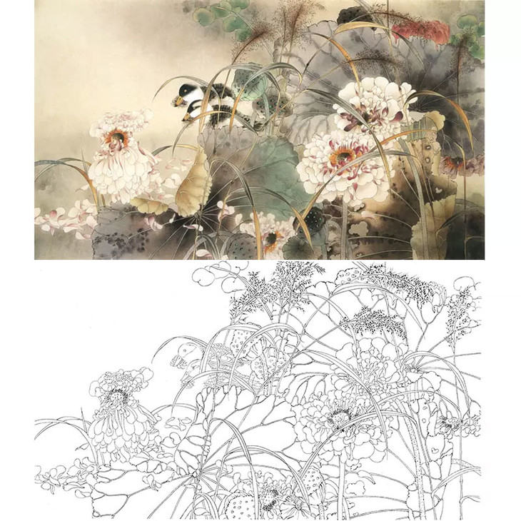 竖幅工笔花鸟白描底稿-金鸿钧四尺六尺-荷花鸳鸯-《清露》-多种白描尺寸可选-A083