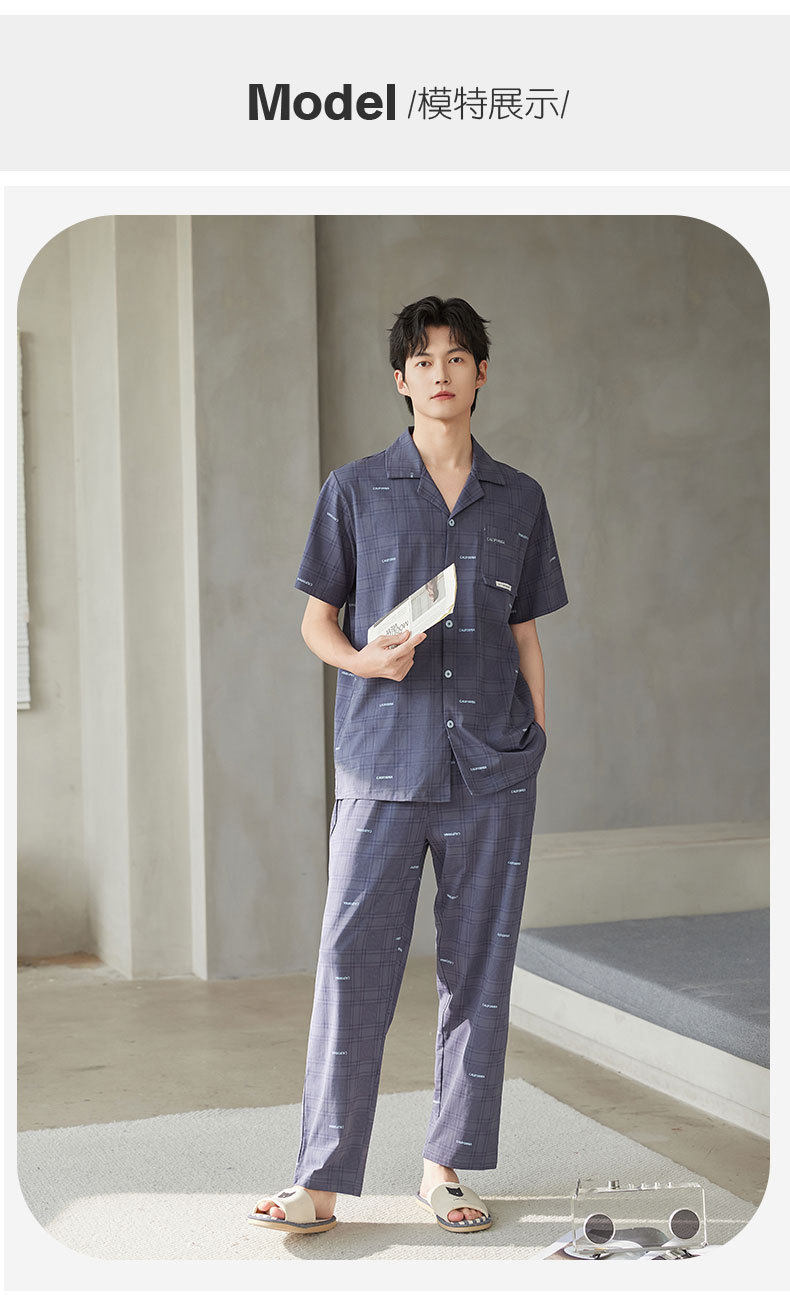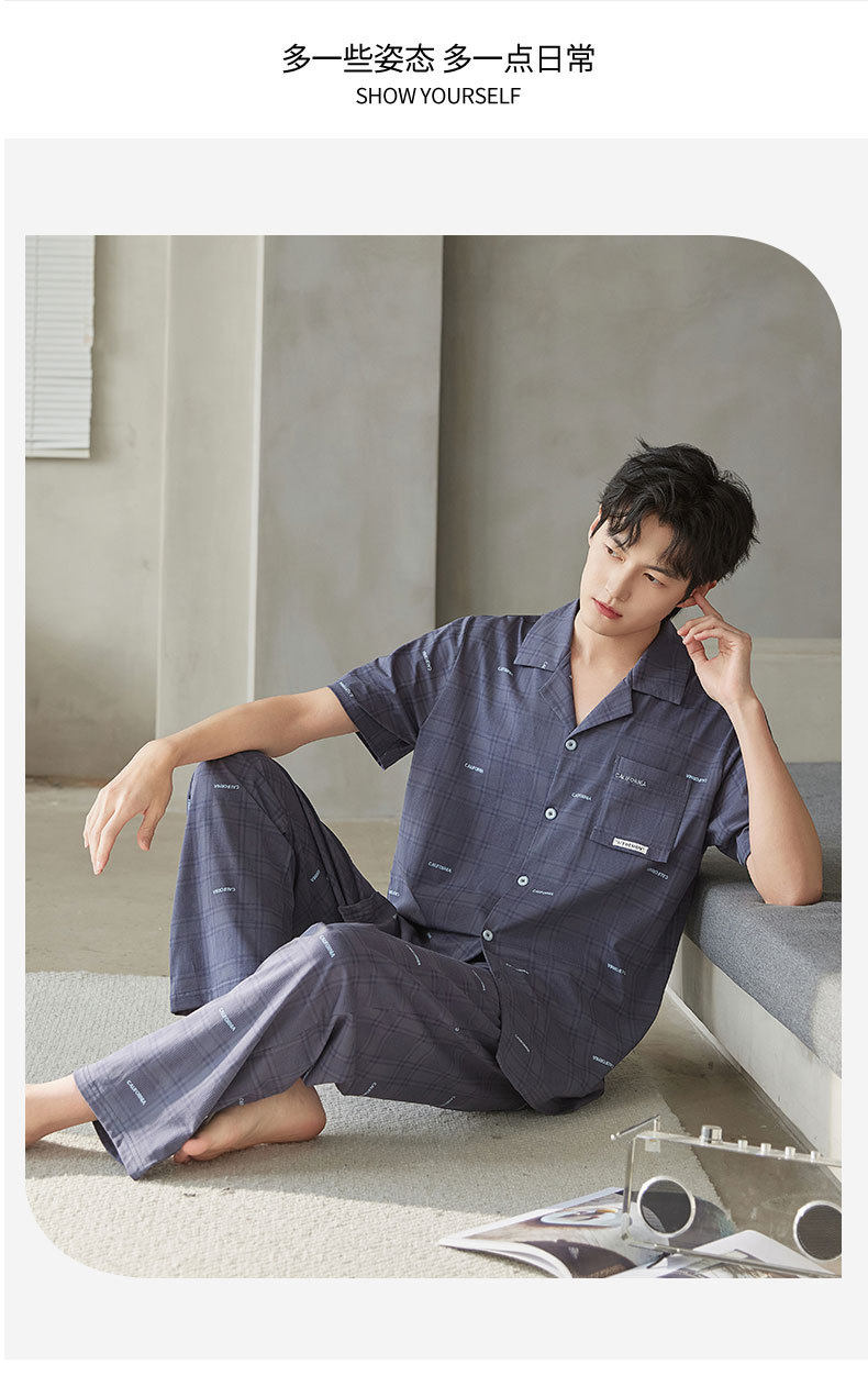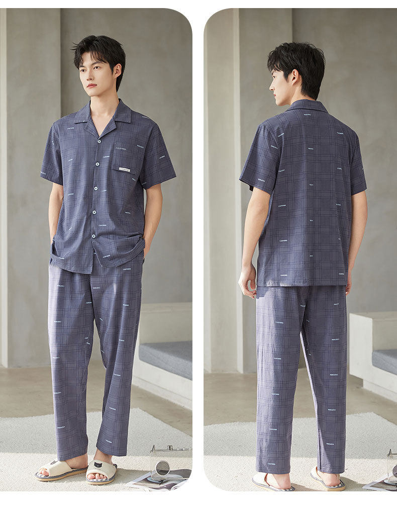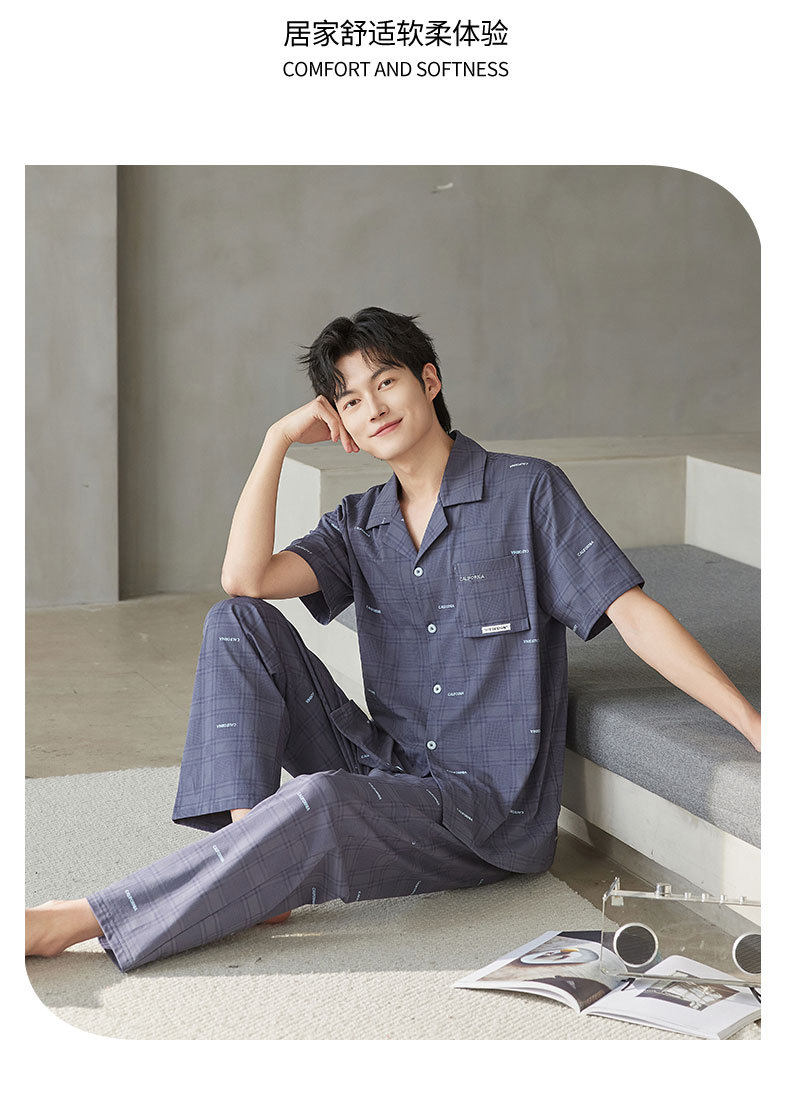 新款夏季男士睡衣纯棉短袖长裤可外穿爽棉翻领家居服开衫套装 JL-TMZ5521