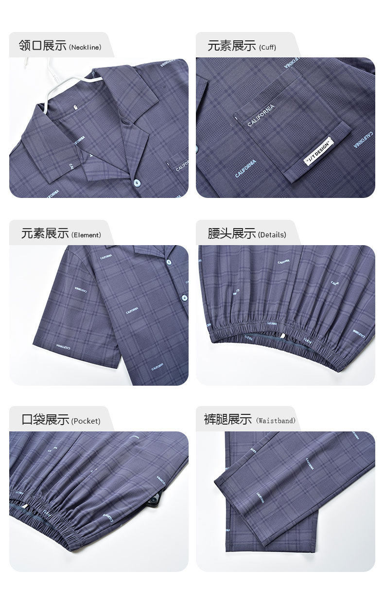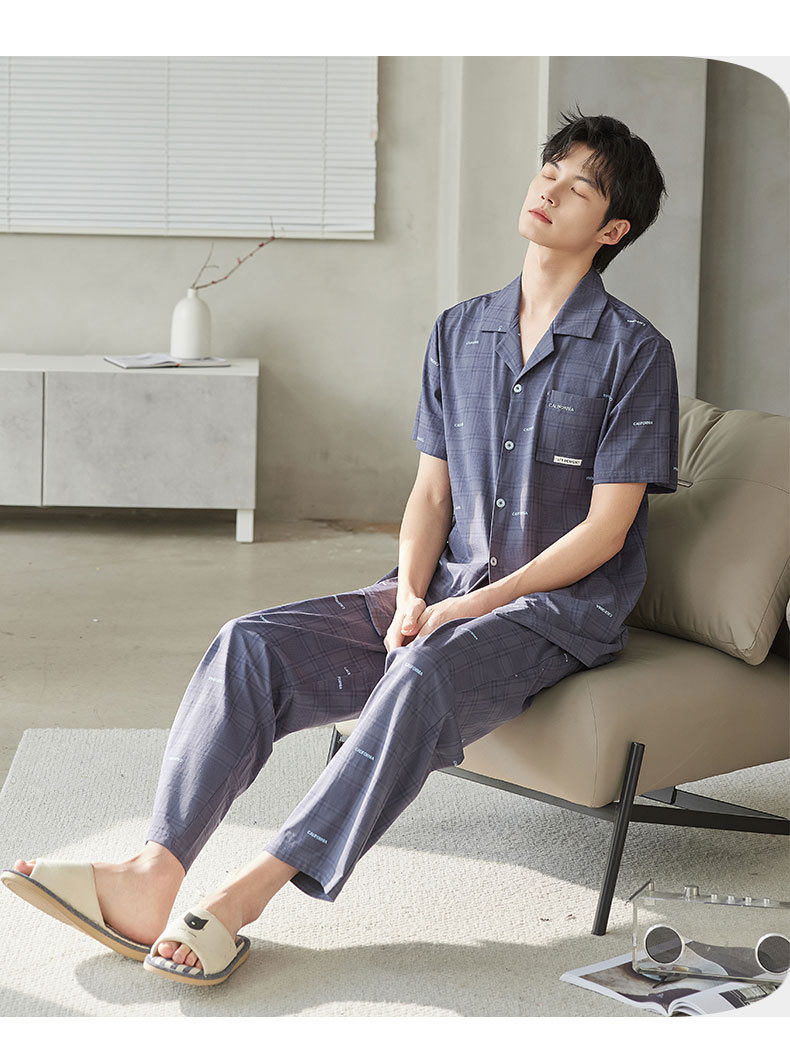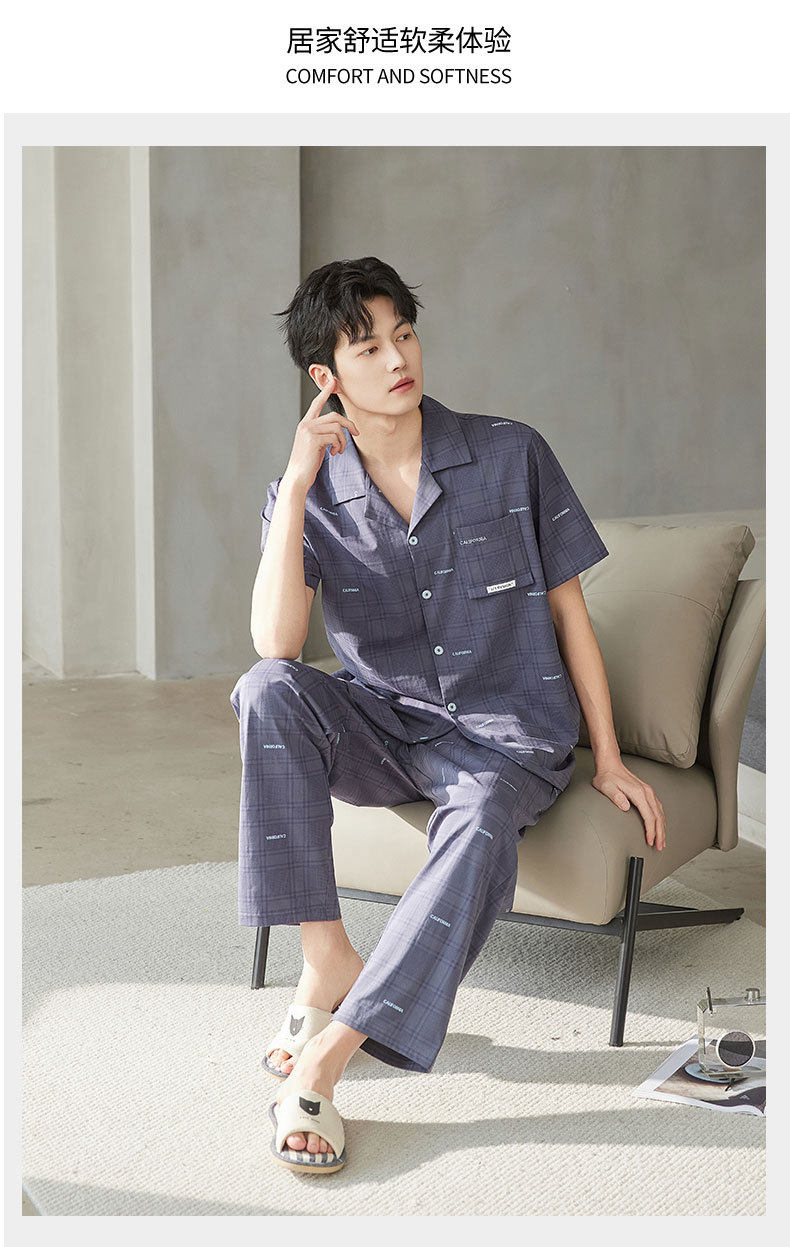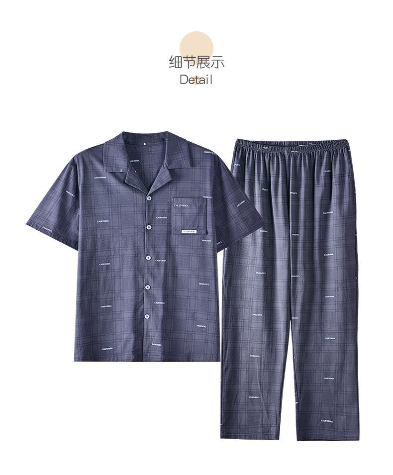 新款夏季男士睡衣纯棉短袖长裤可外穿爽棉翻领家居服开衫套装 JL-TMZ5521