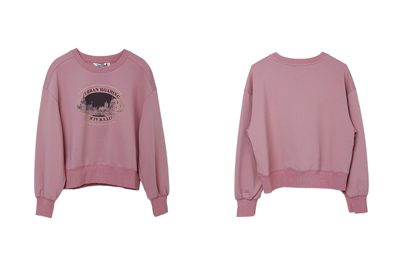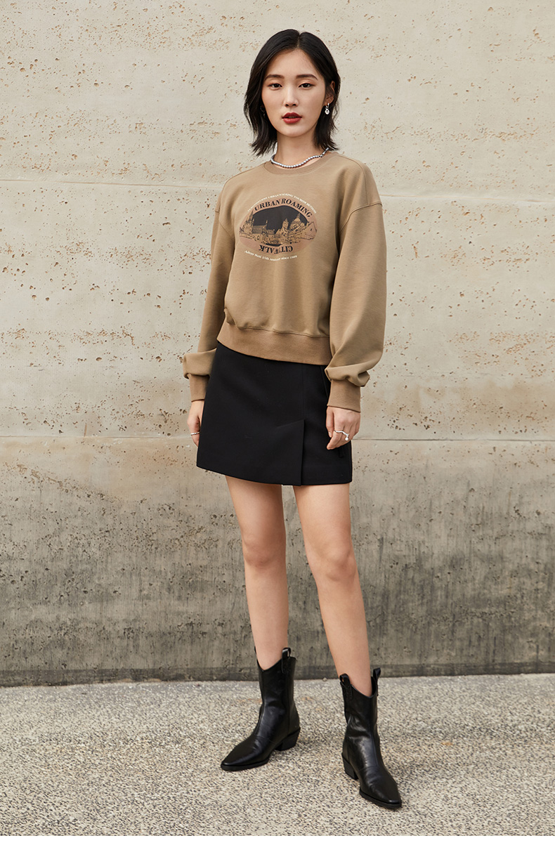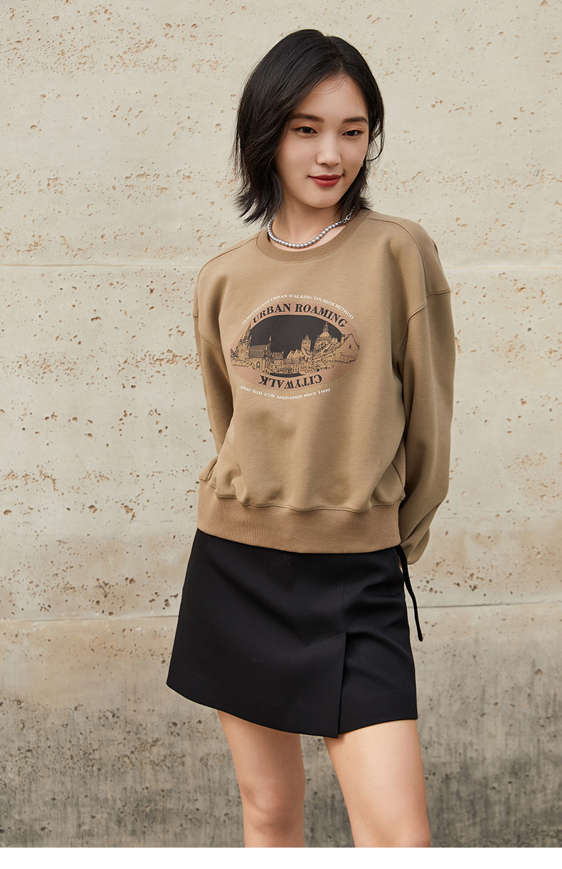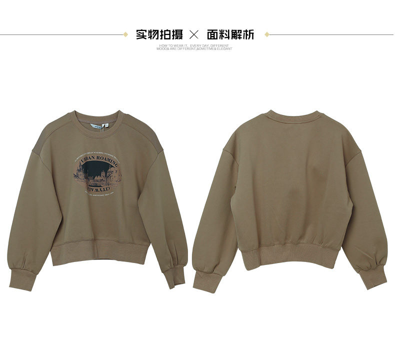 复古风卡其色印花圆领卫衣女 宽松百搭休闲上衣