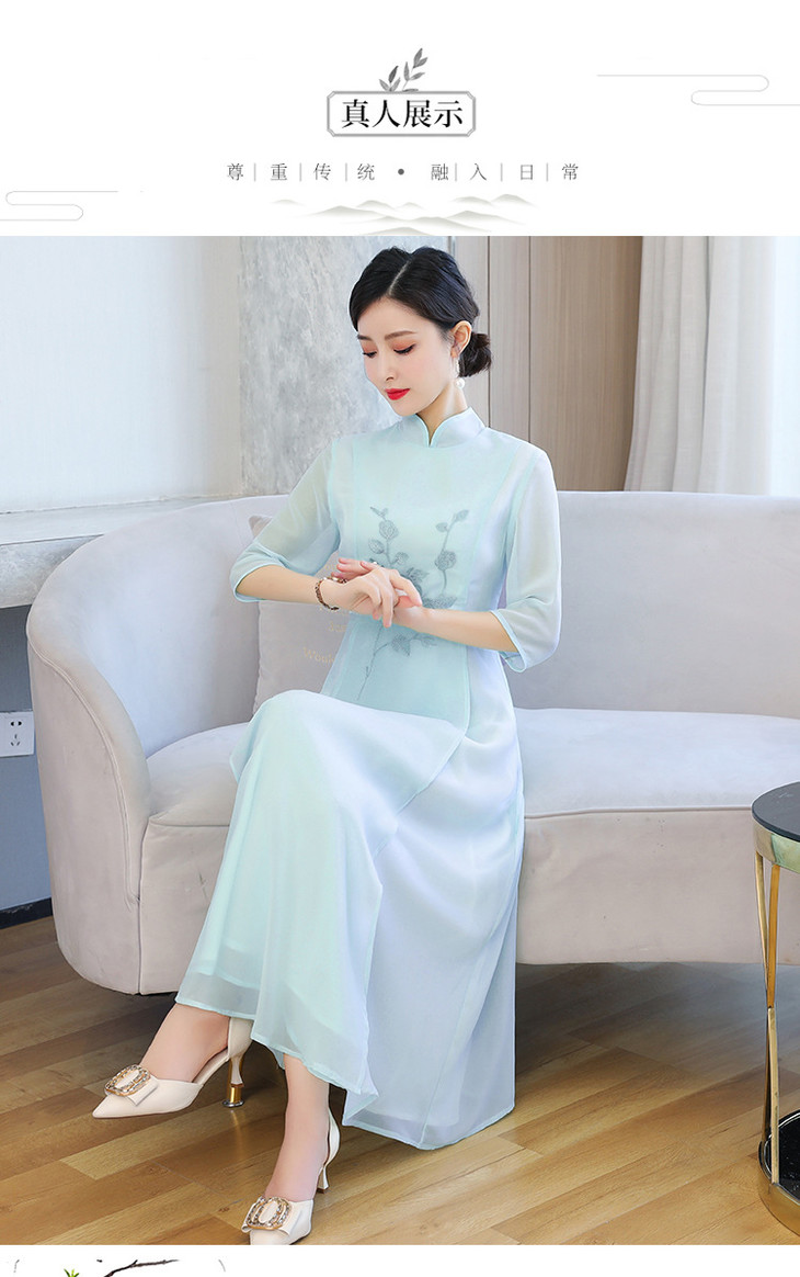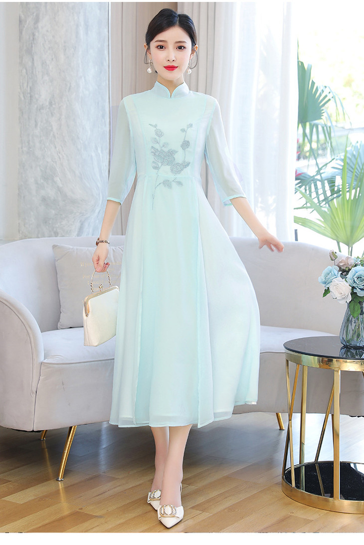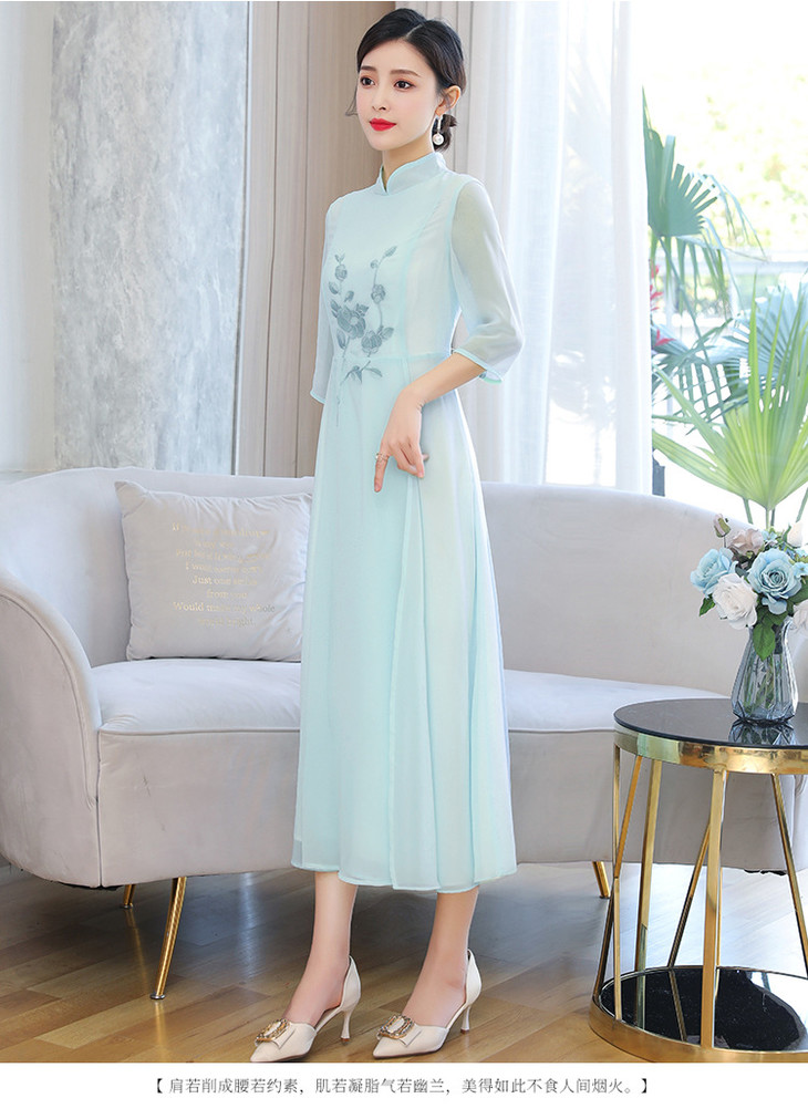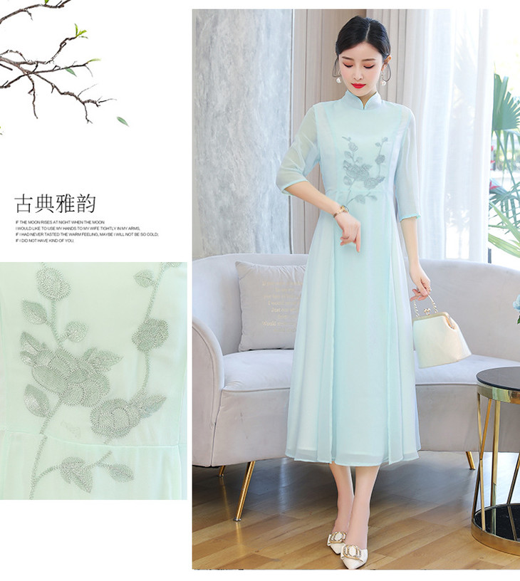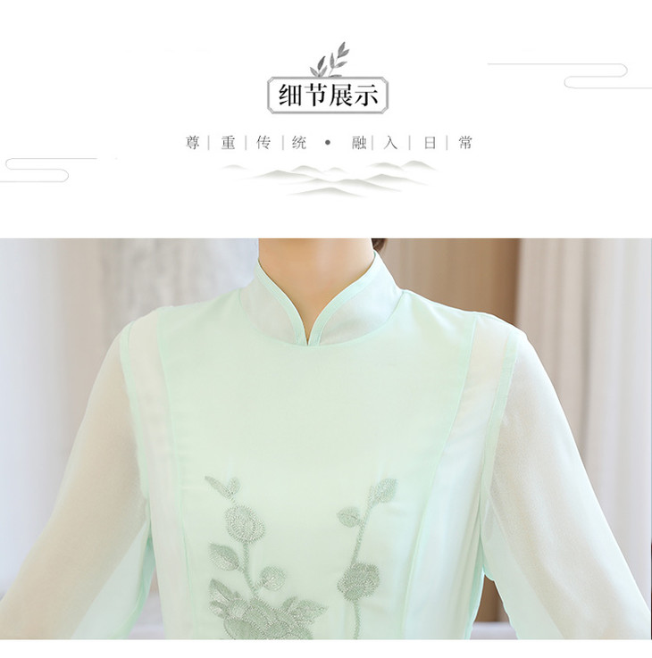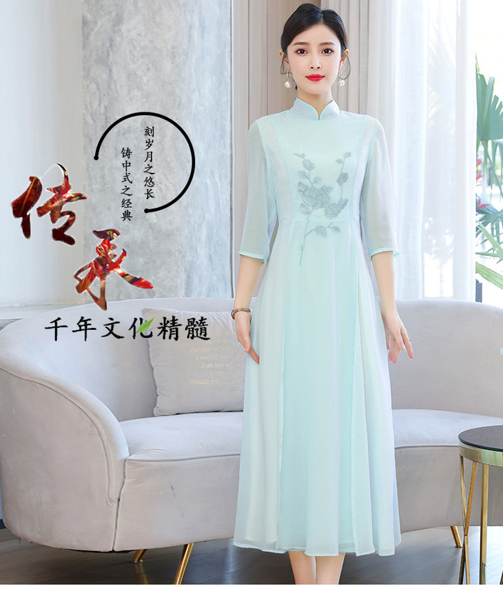 XYA022 新款汉服中国风长裙雪纺绣花改良民国风雪纺连衣裙中式禅茶服